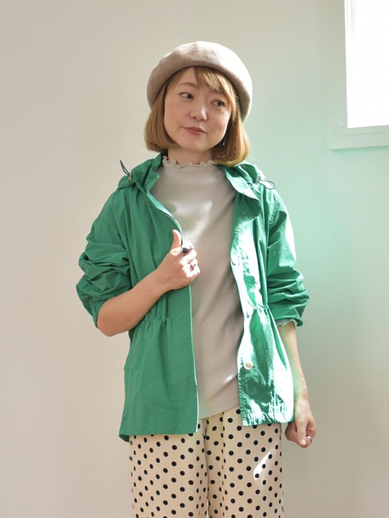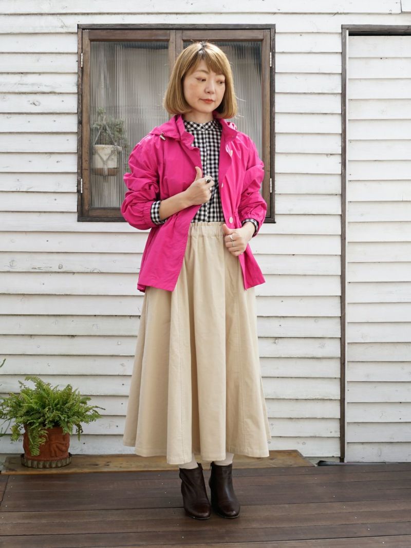 スカートを合わせても女性らしいムードが決まる着丈の前後差がポイントです。