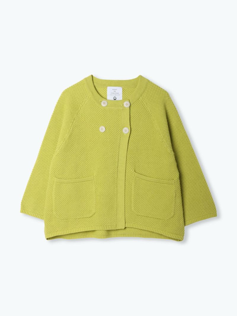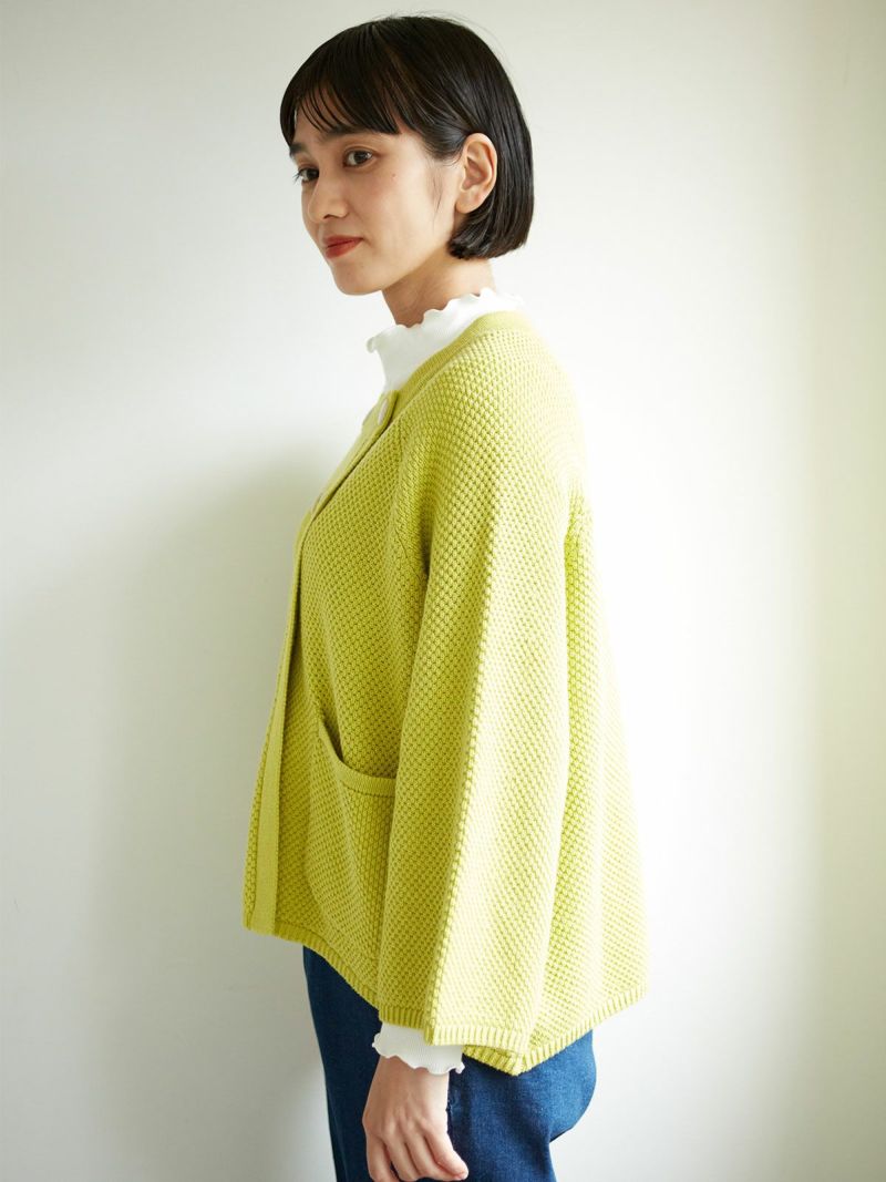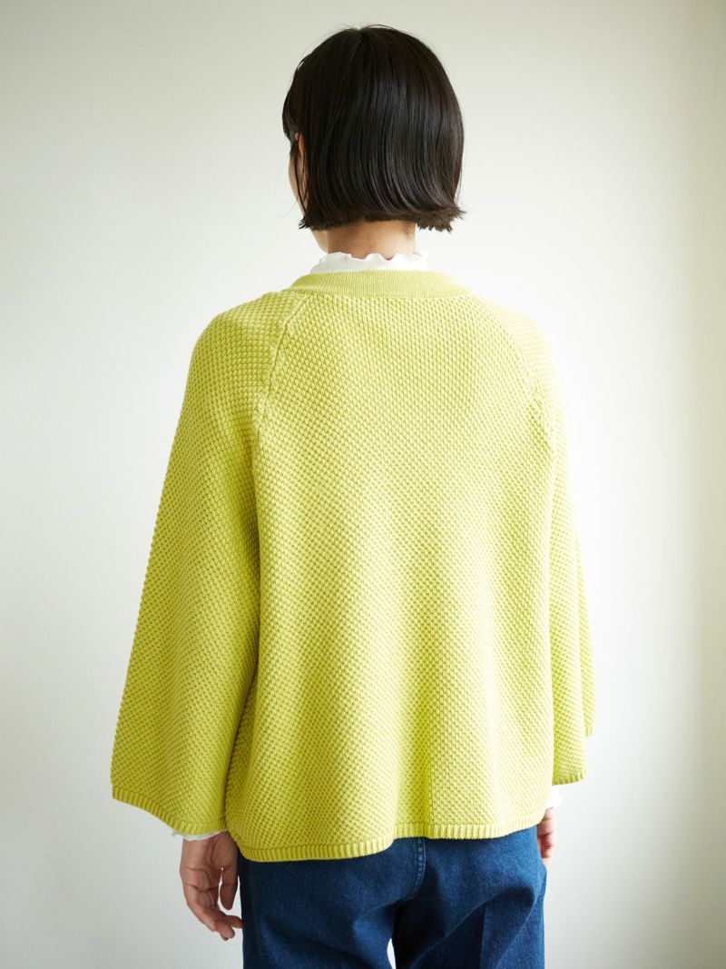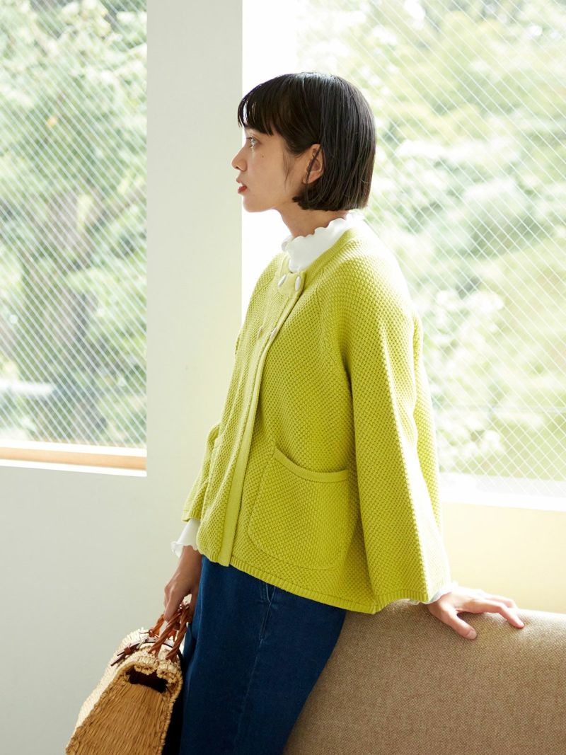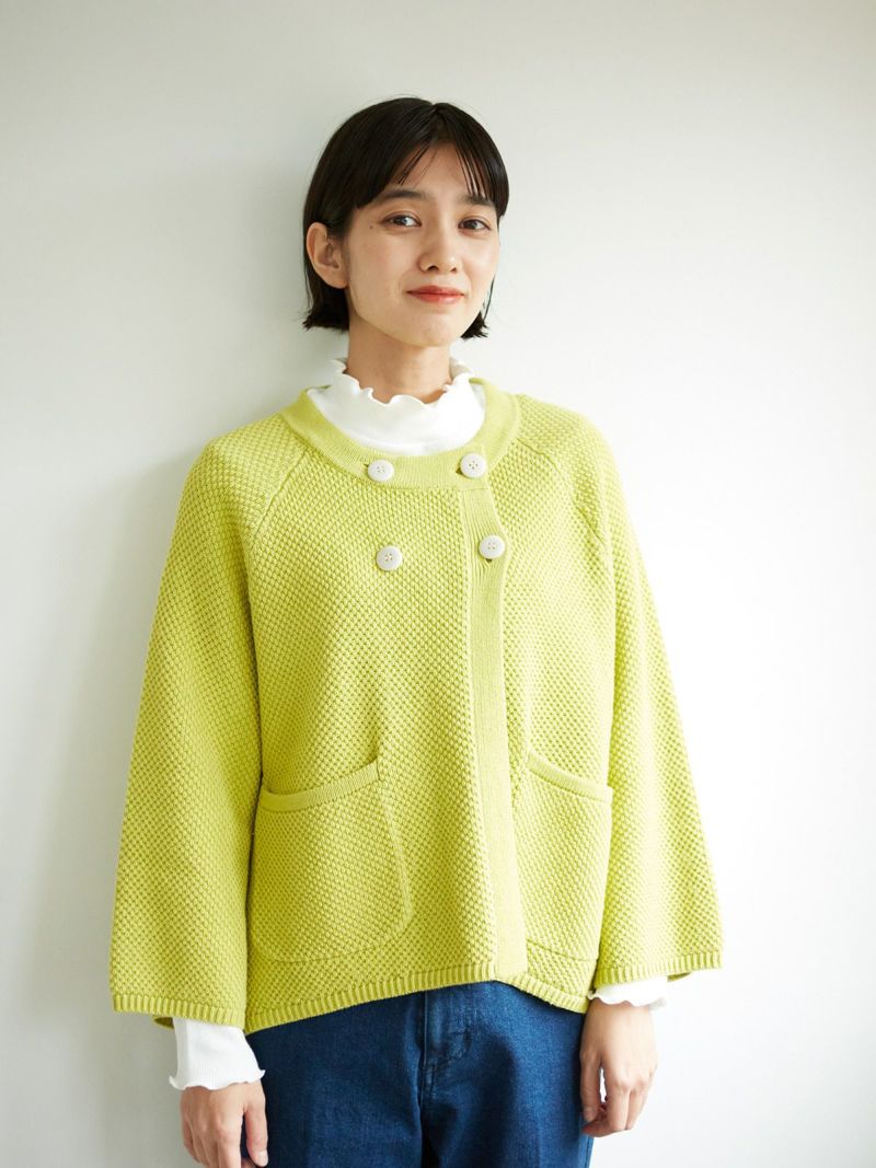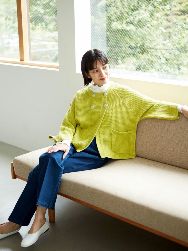 ボタンを全部閉じてニットプルオーバー風な着こなしも◎。
