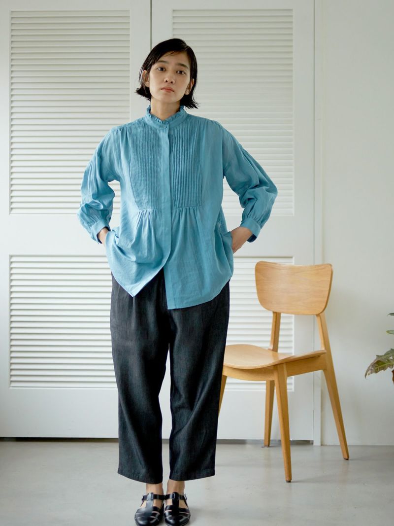 フロントウエストにはギャザーとタックを施し