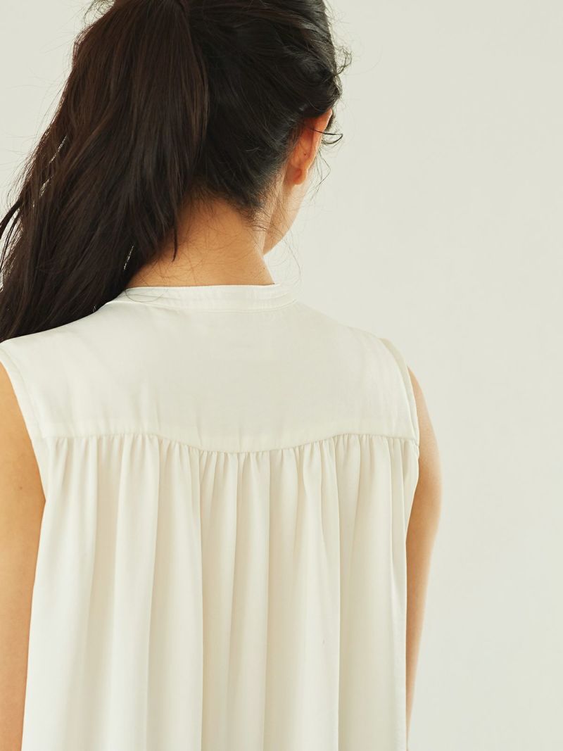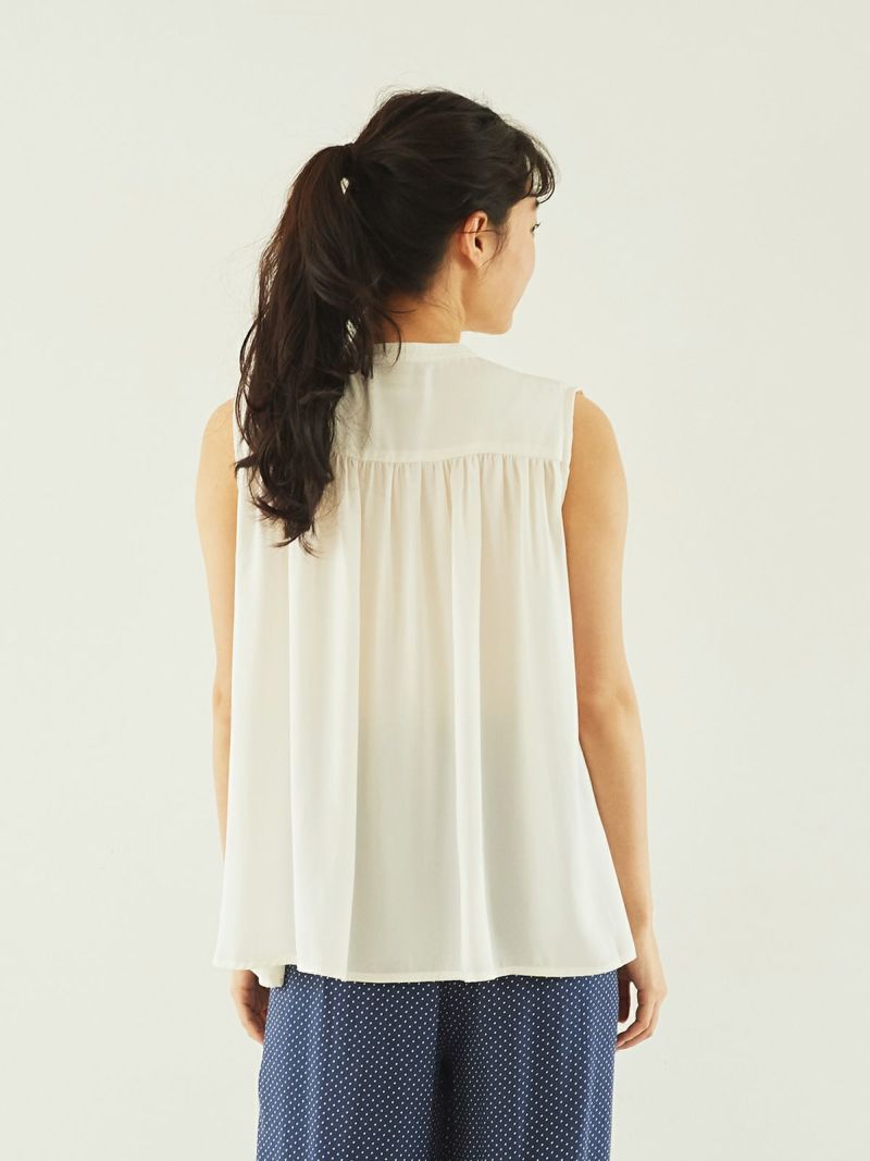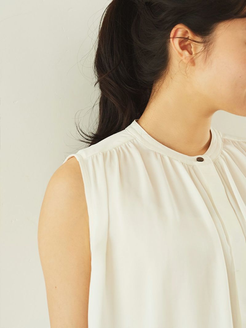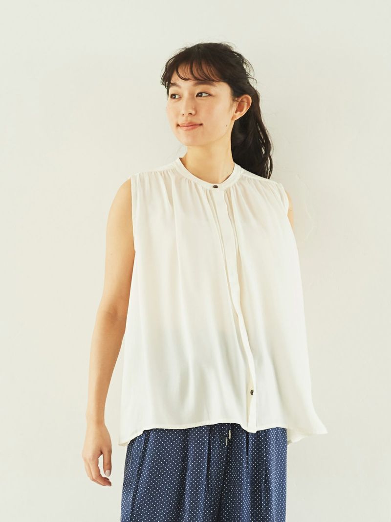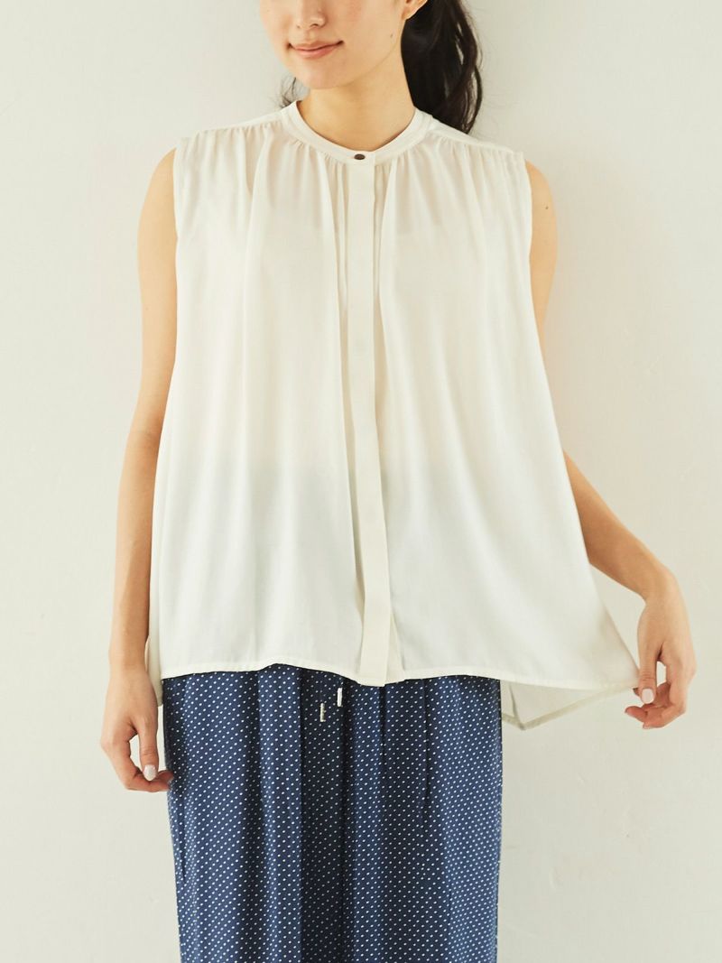 たっぷりのギャザーを入れたノースリーブブラウスです。