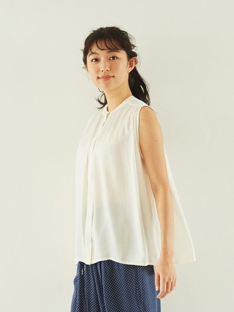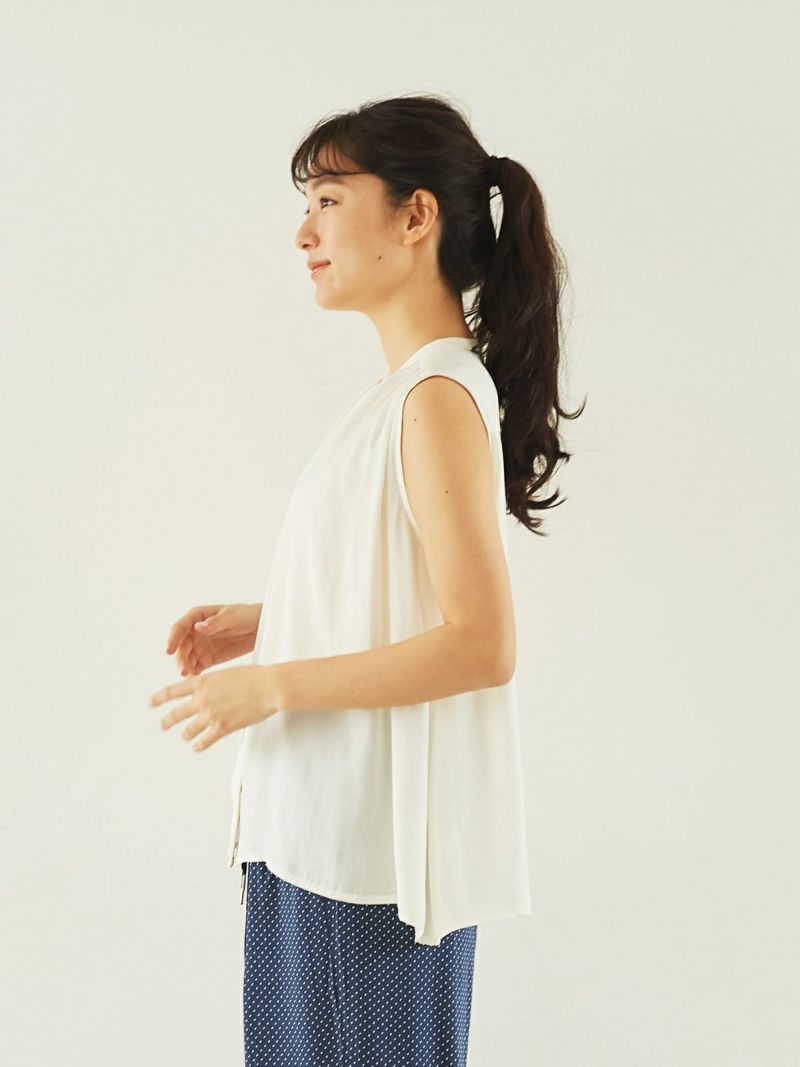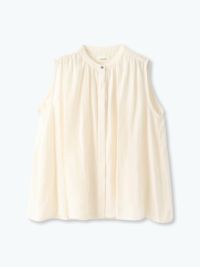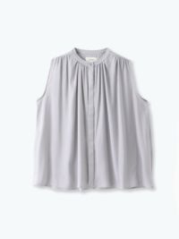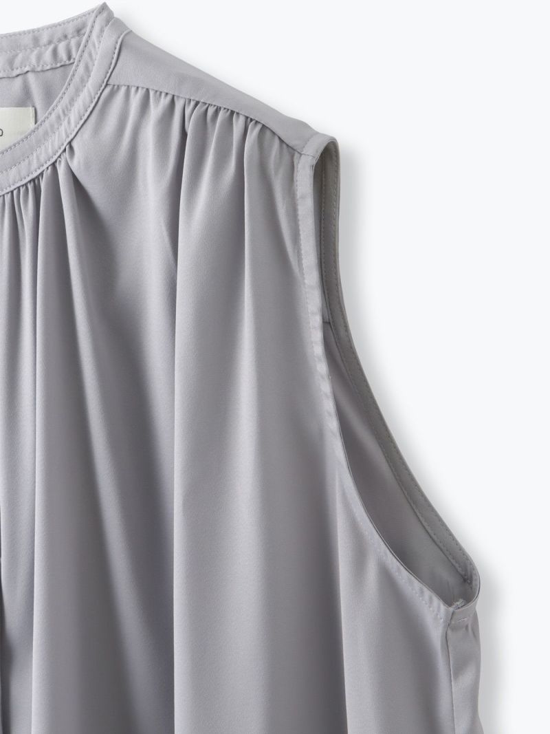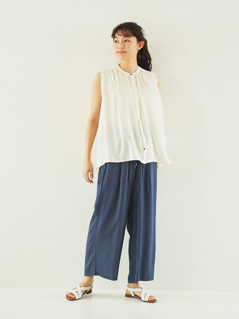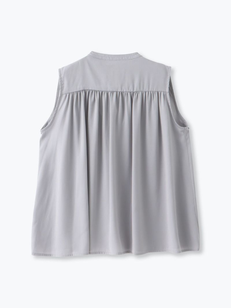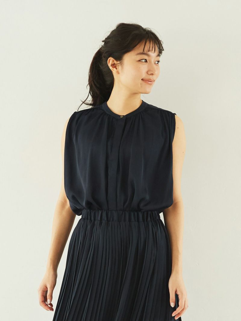 たっぷりのギャザーを入れたノースリーブブラウスです。