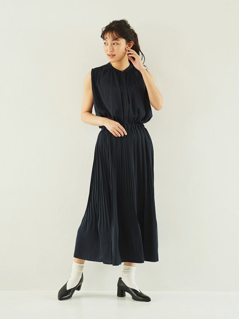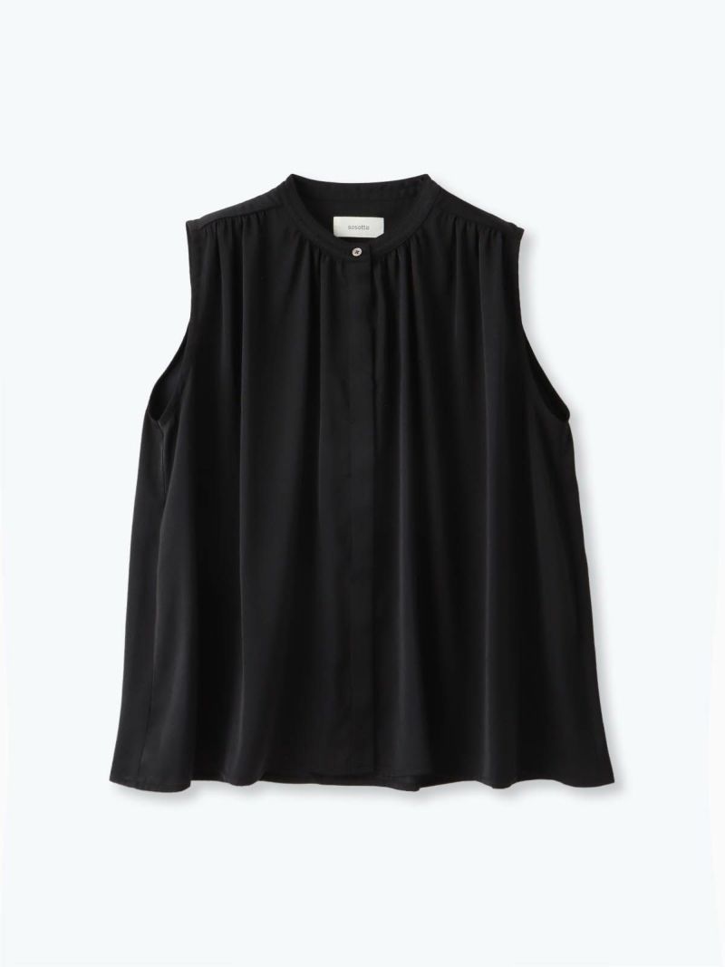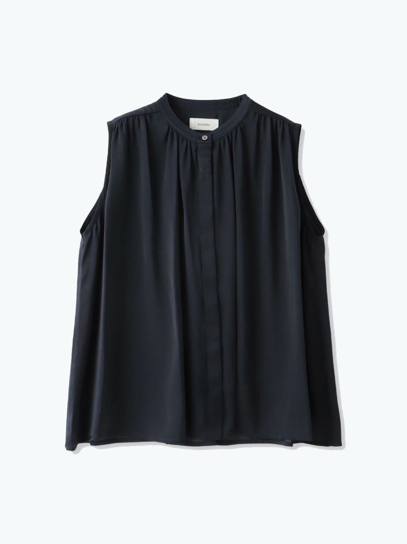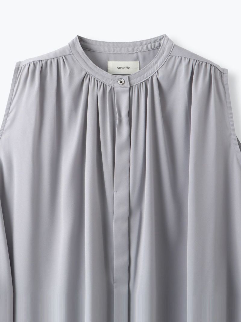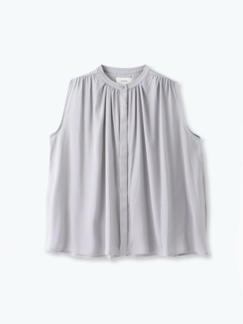 たっぷりのギャザーを入れたノースリーブブラウスです。