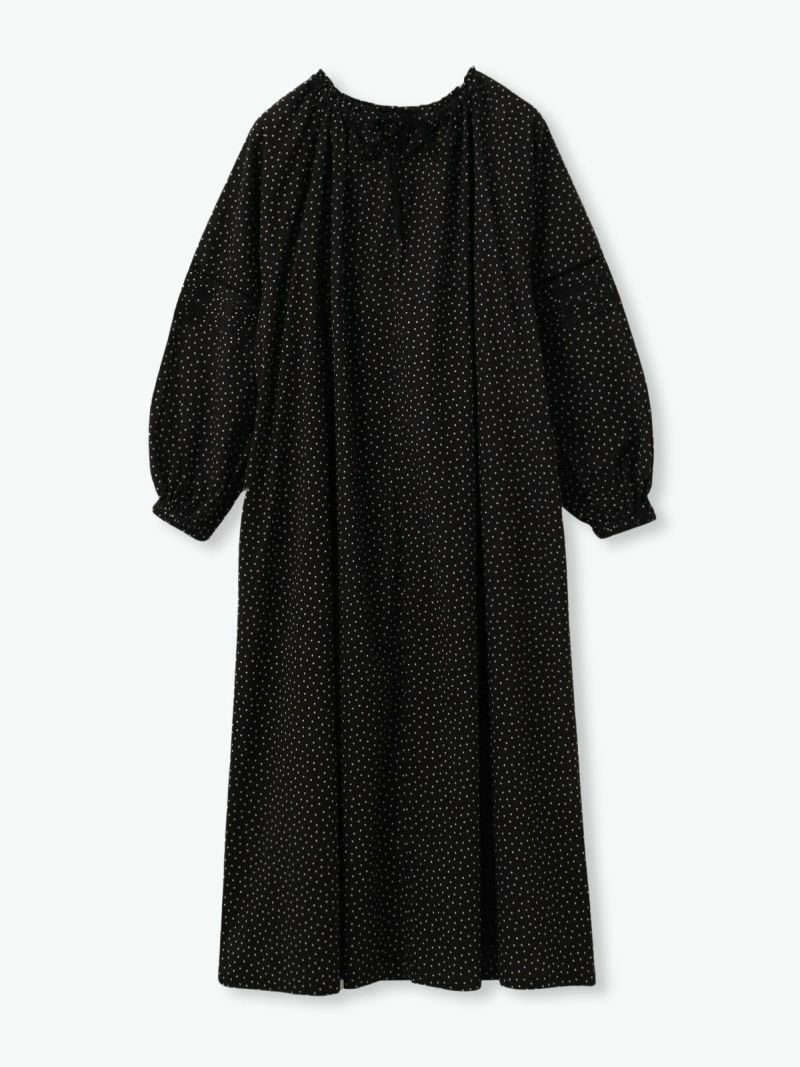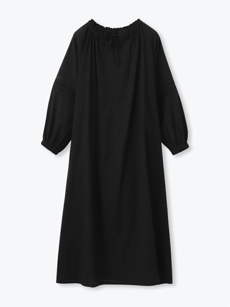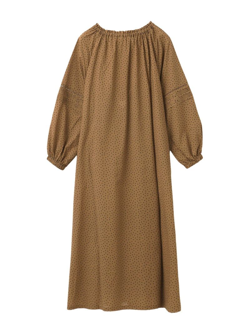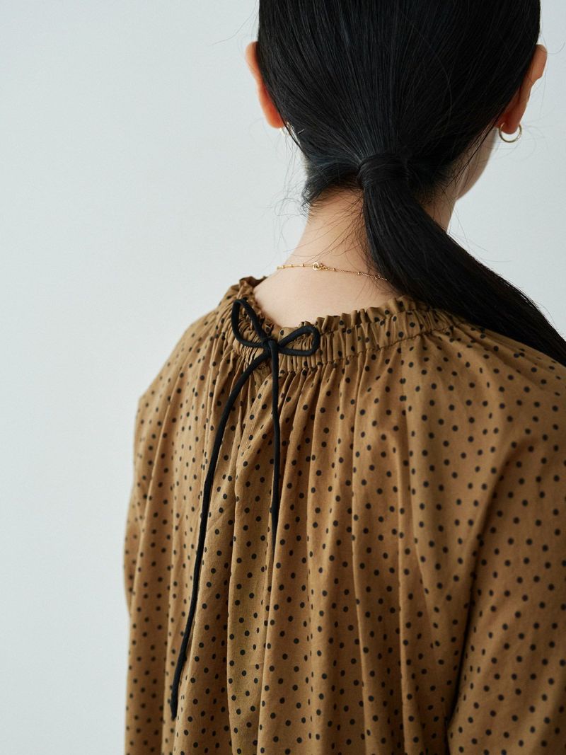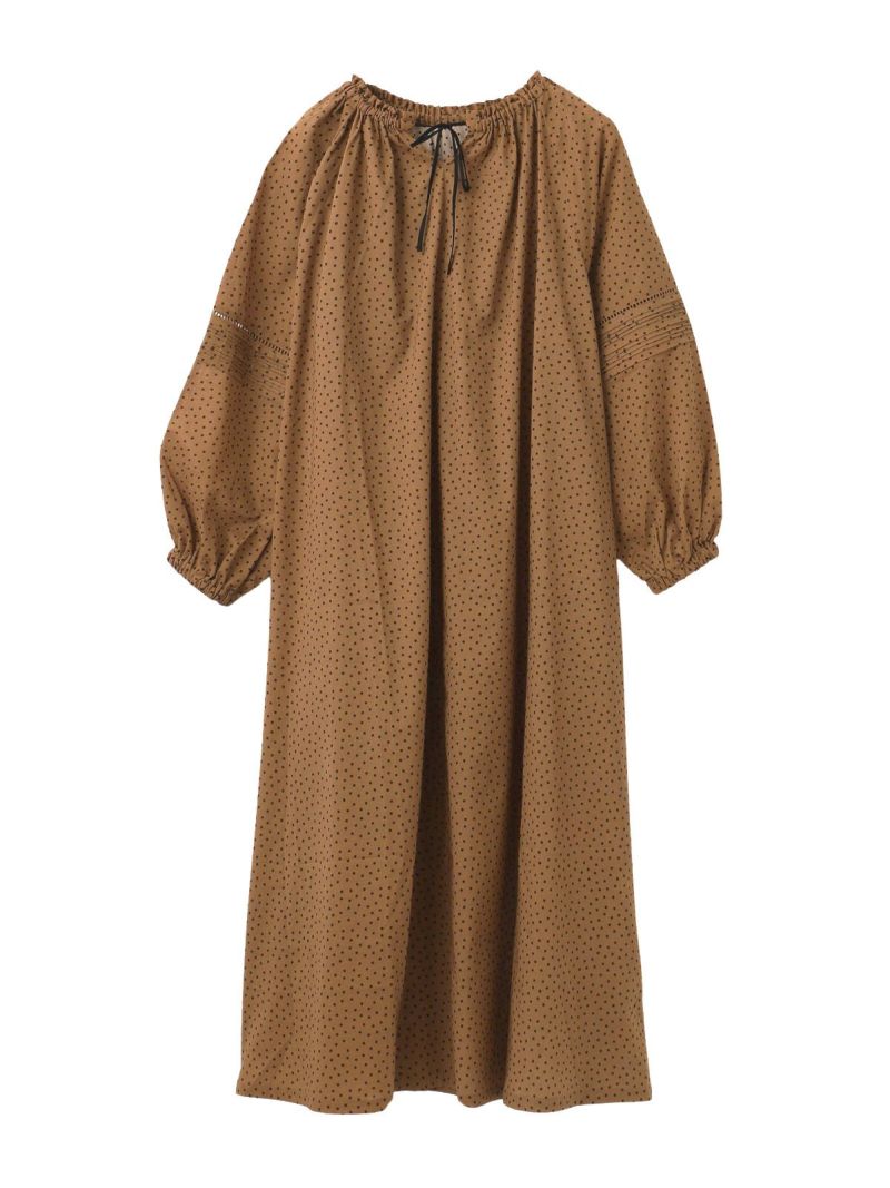 ボリュームのあるギャザーネックが華やかなワンピース。