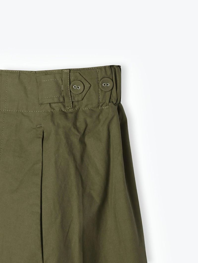フロントのタックプリーツでウエスト周りのボリュームは抑え、