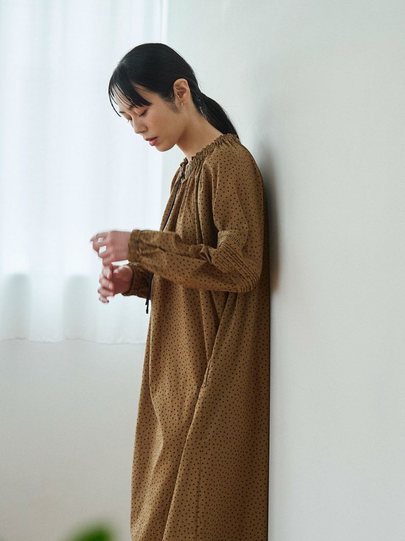 ボリュームのあるギャザーネックが華やかなワンピース。