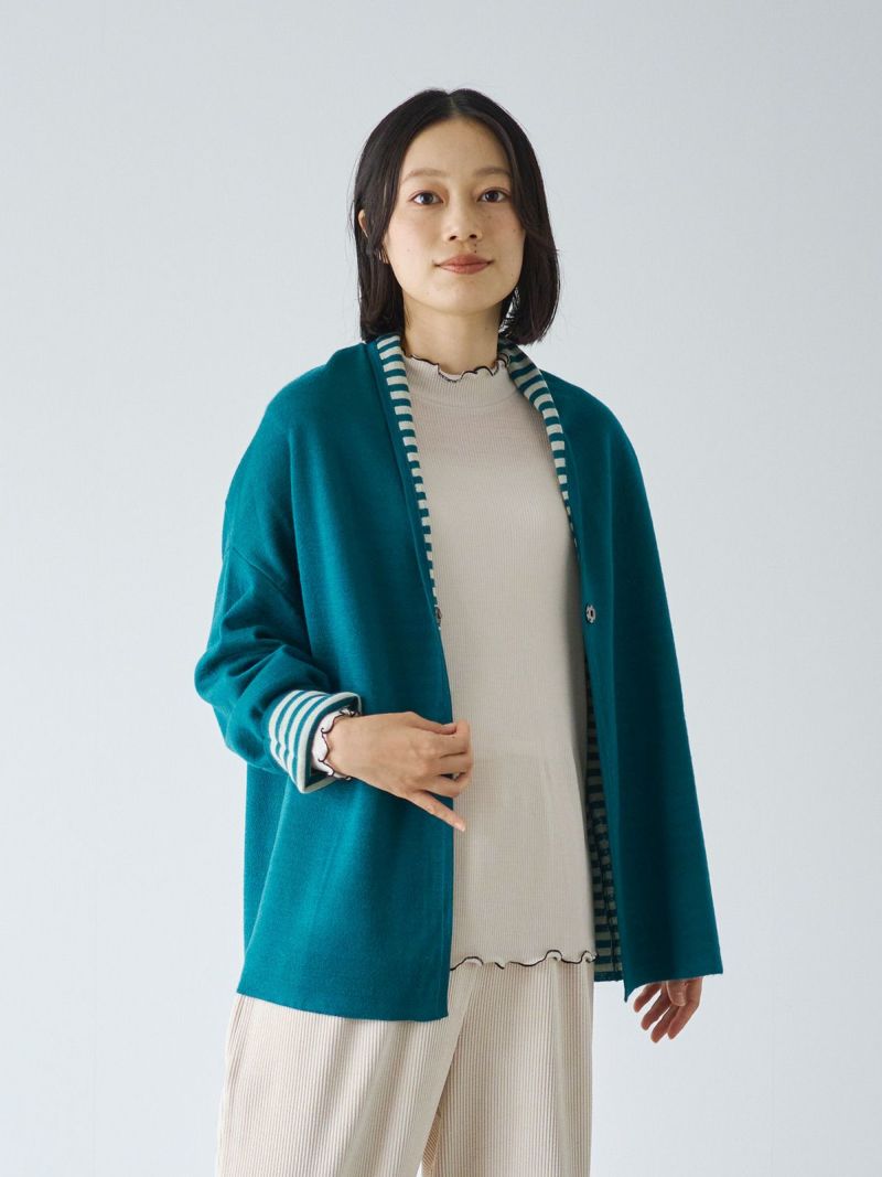 衿ぐりと袖口のメローロックの配色が、