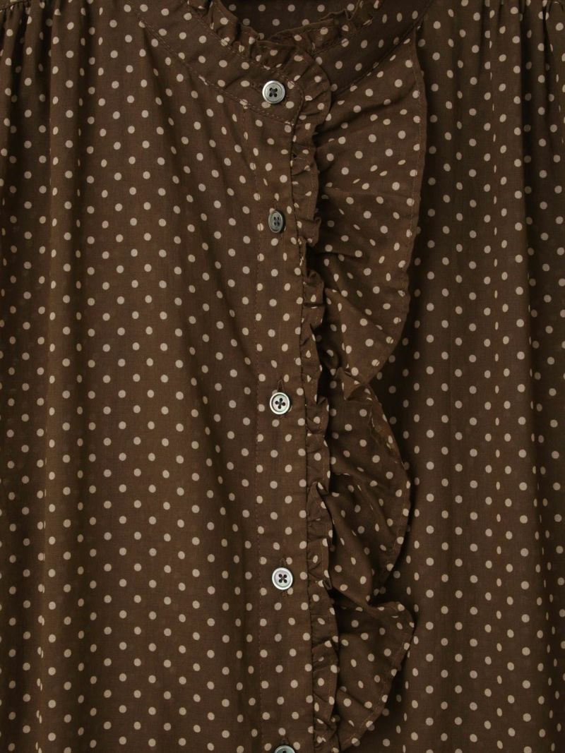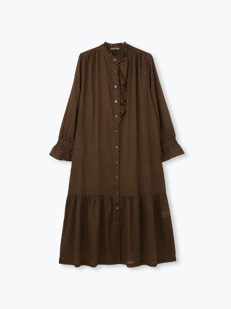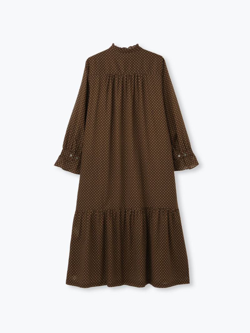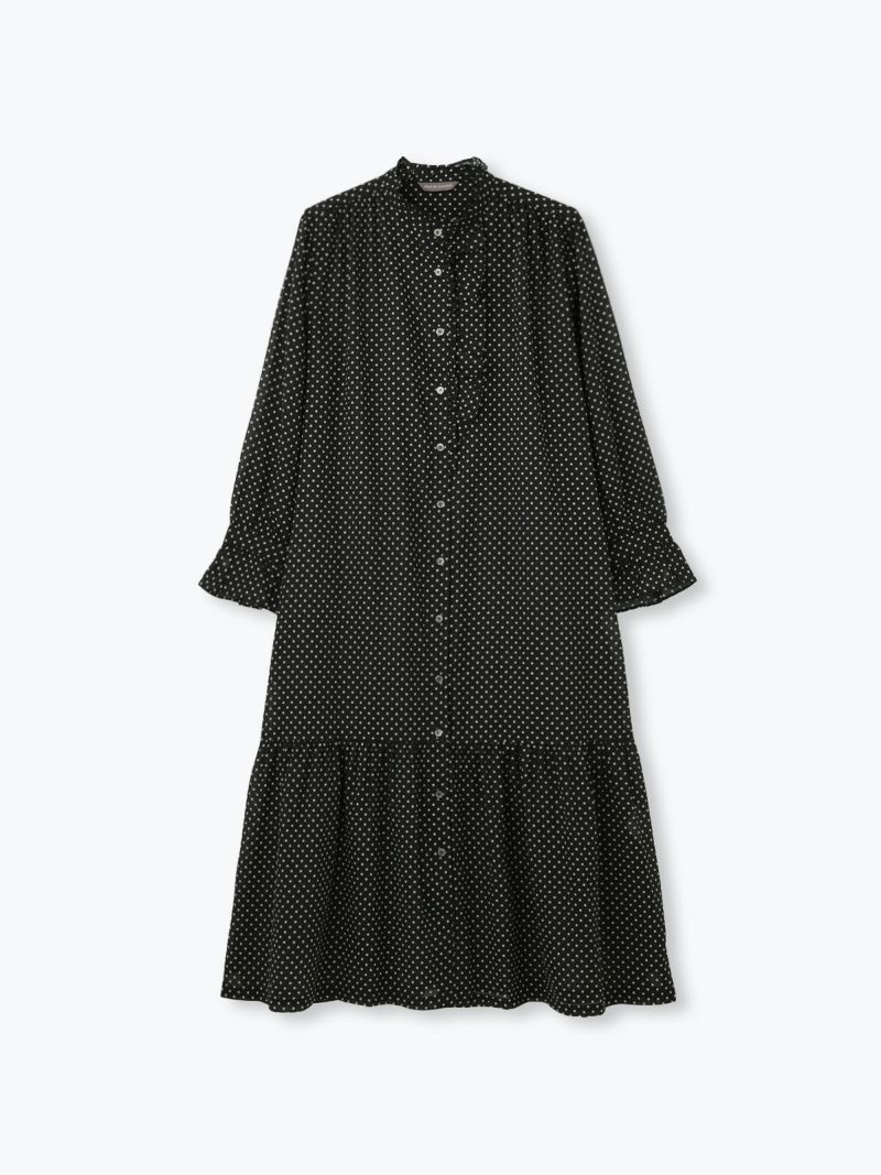 衿ぐりやフロント、袖口などふんだんにあしらったフリルは