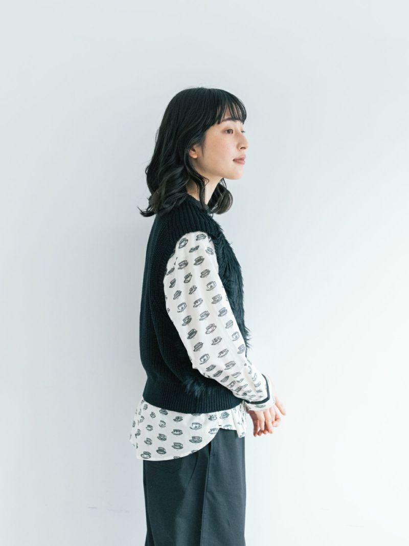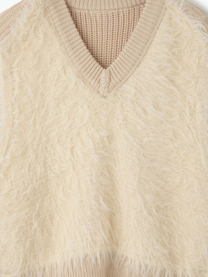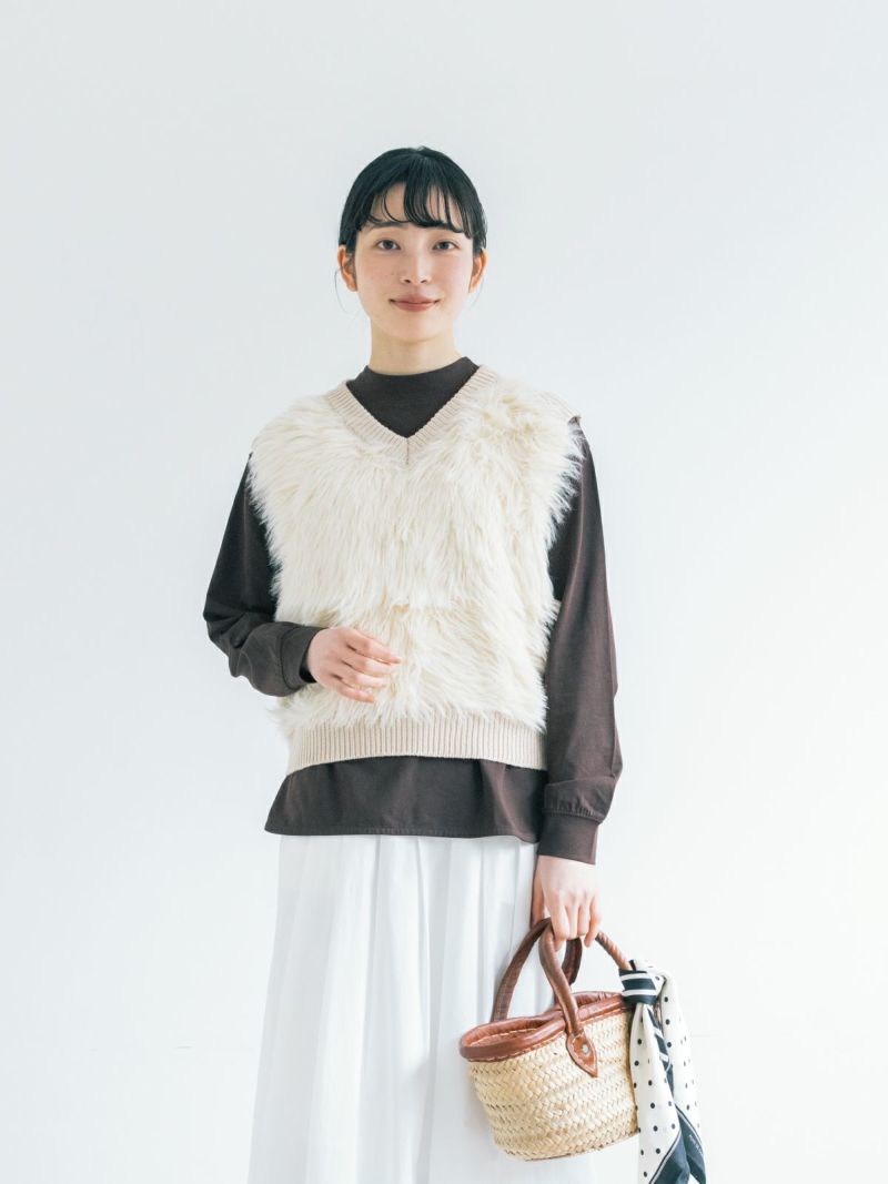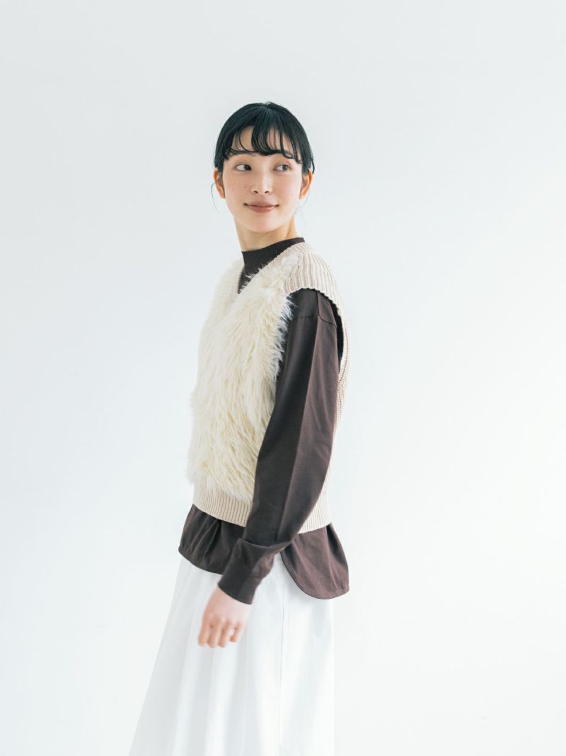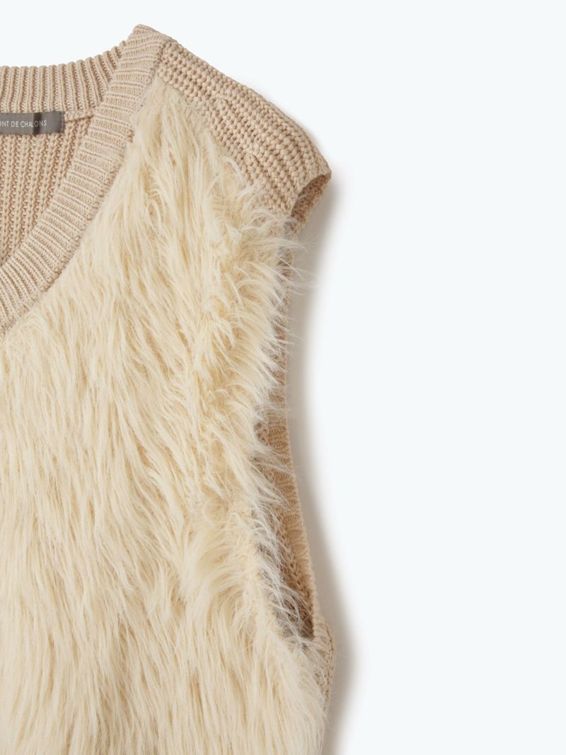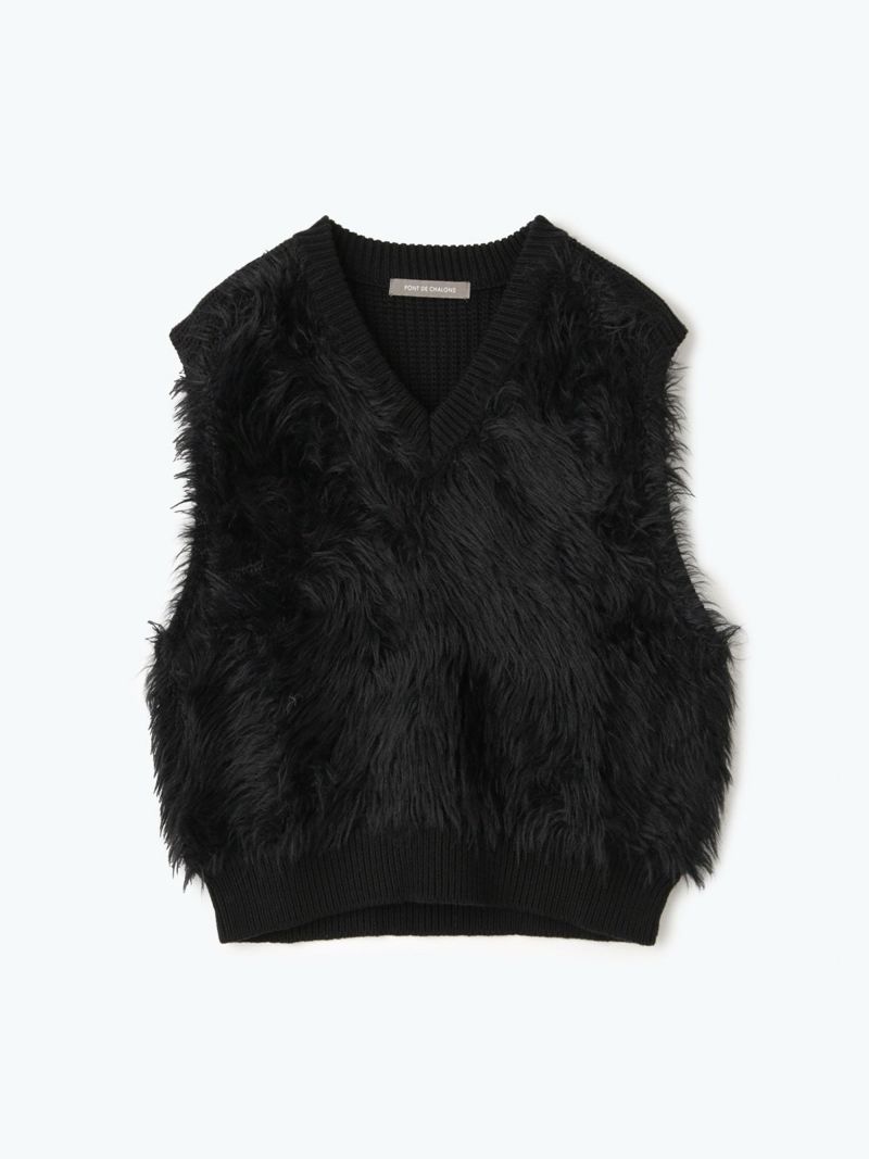 毛足の長いシャギー糸をファーのように編み込んだニットベストです。