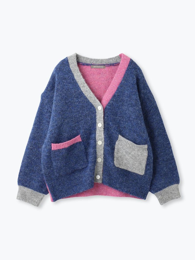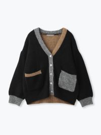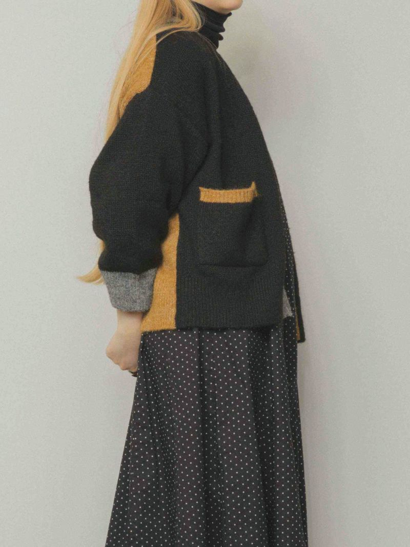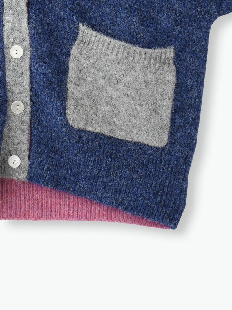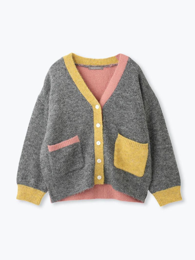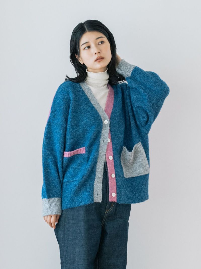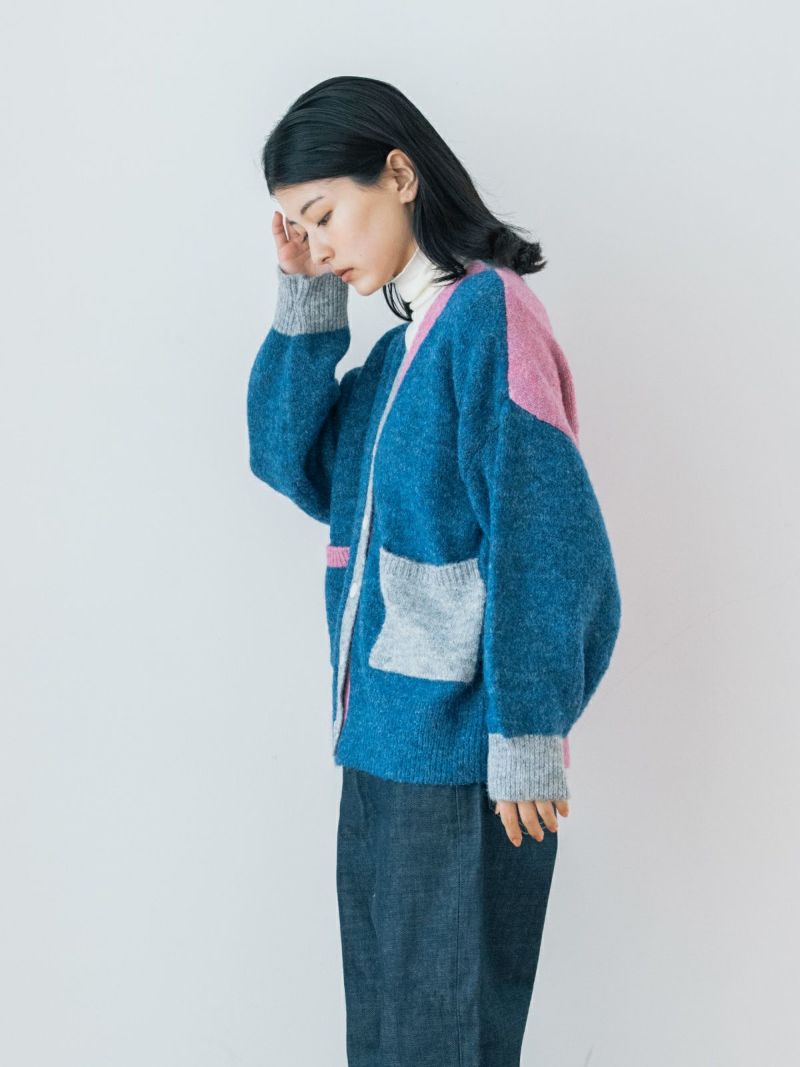 カラフルな切り替えが映えるデザインカーディガン。