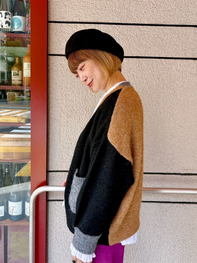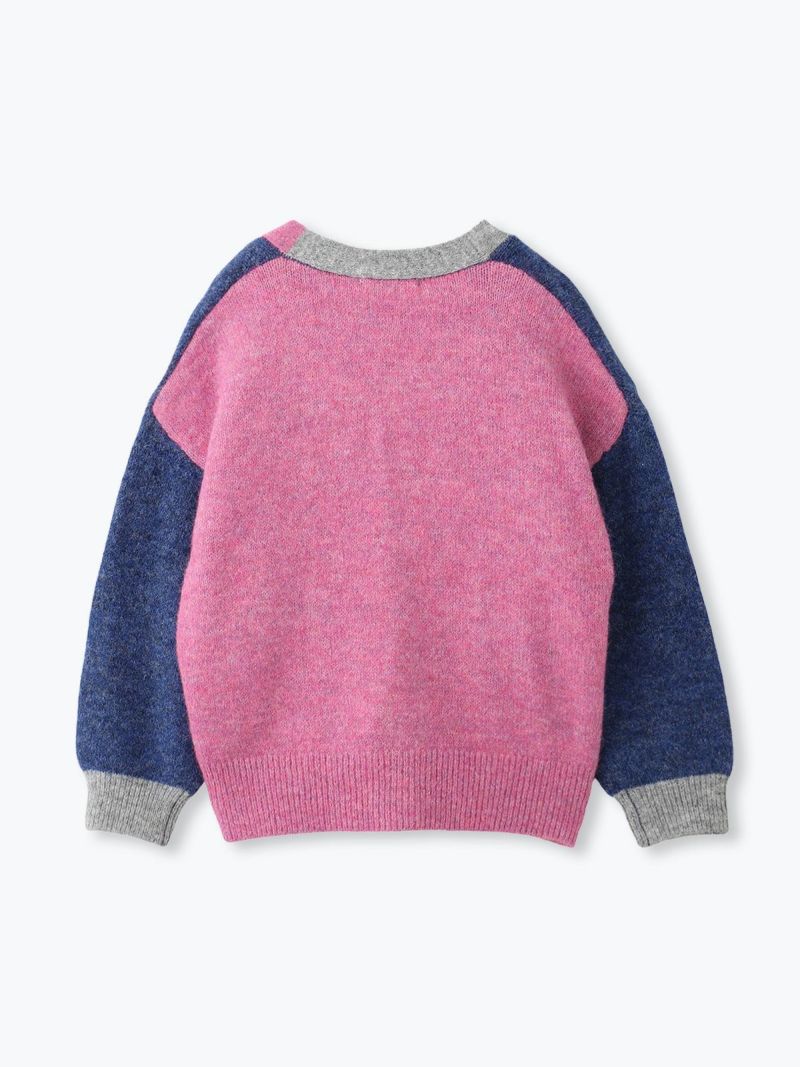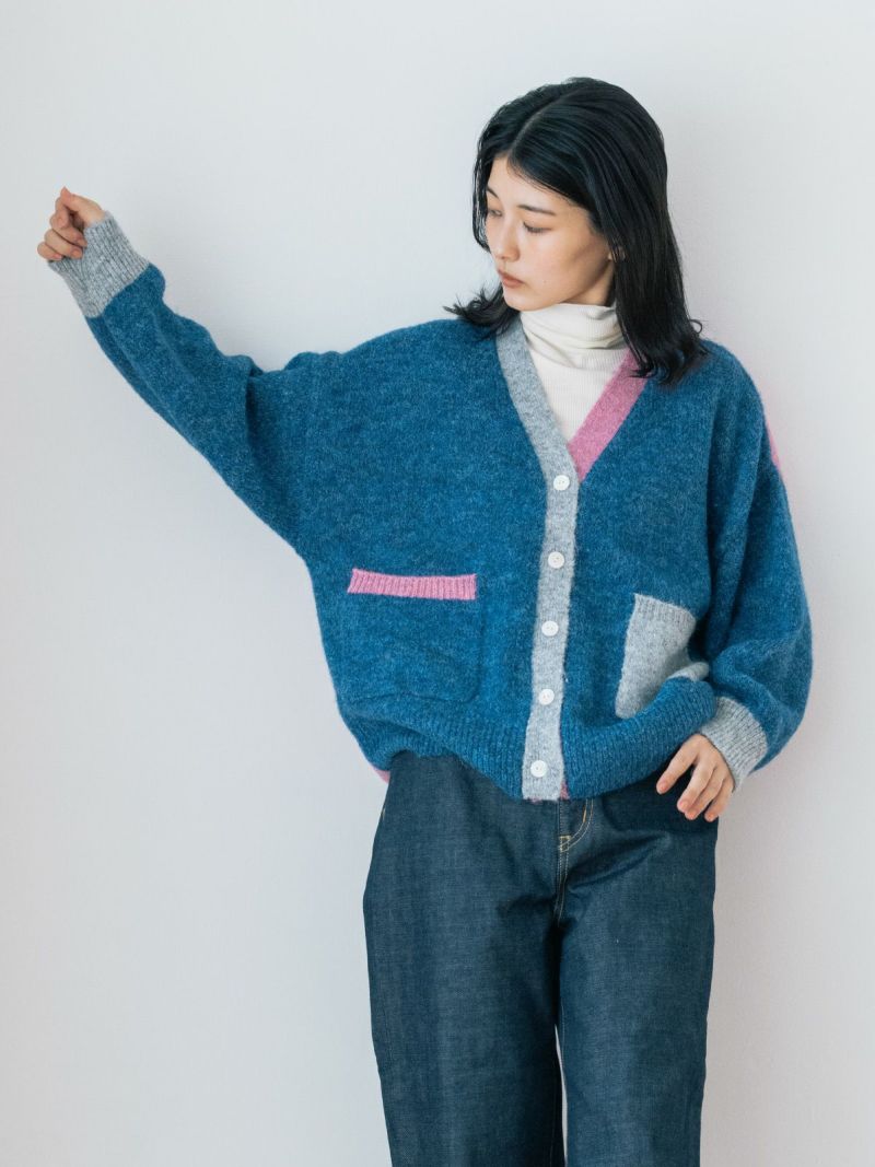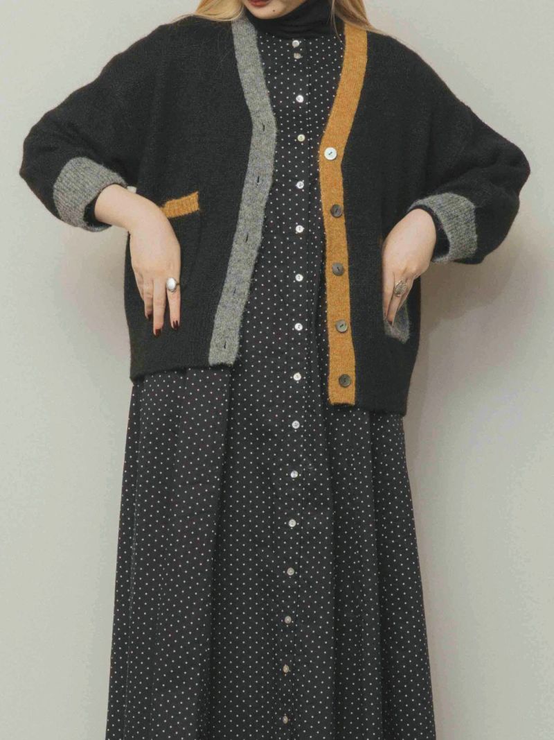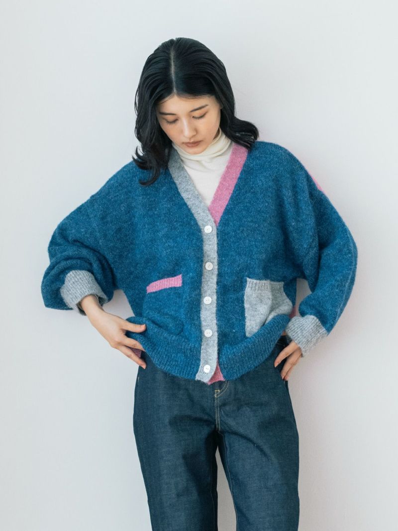 カラフルな切り替えが映えるデザインカーディガン。