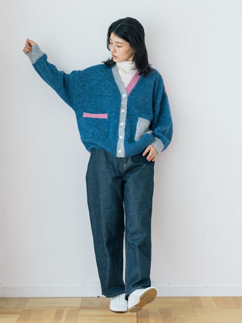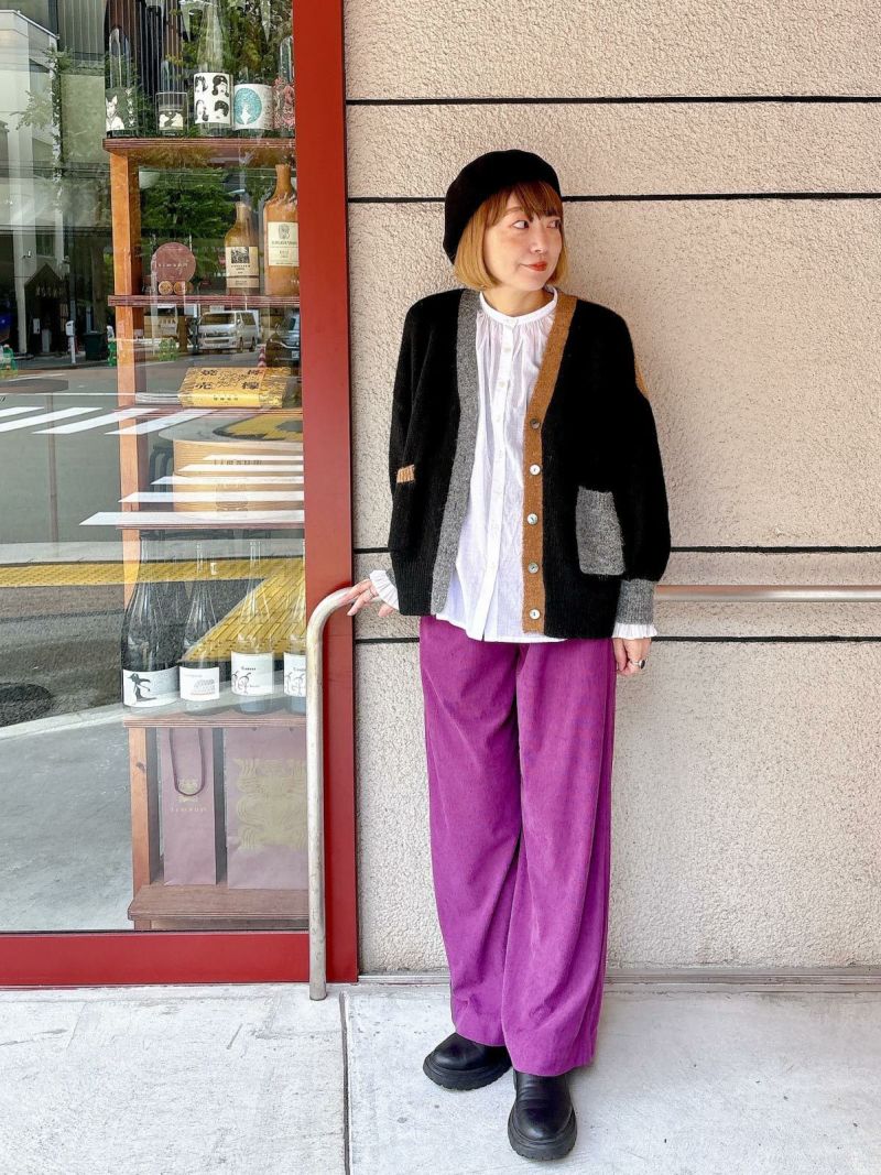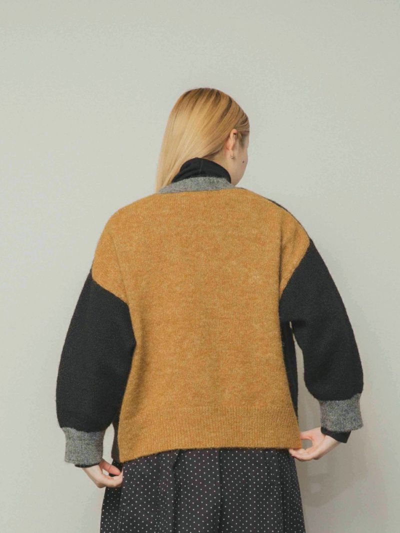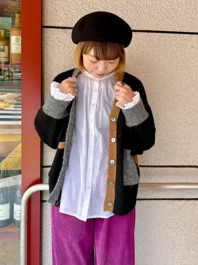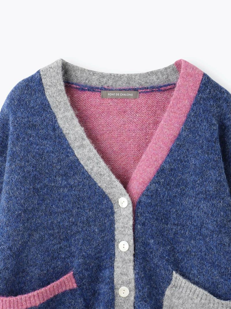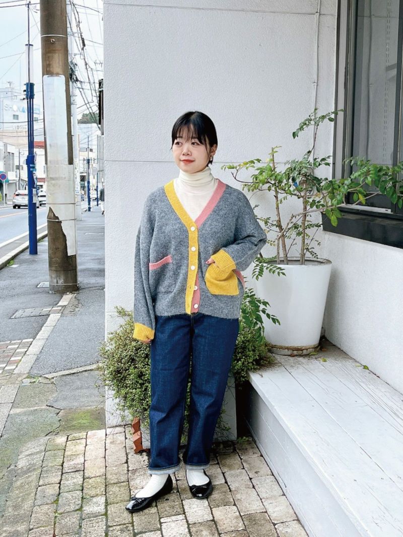 カラフルな切り替えが映えるデザインカーディガン。