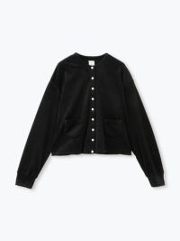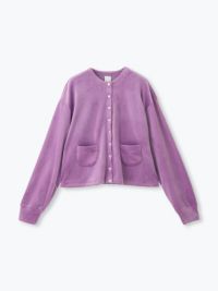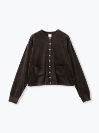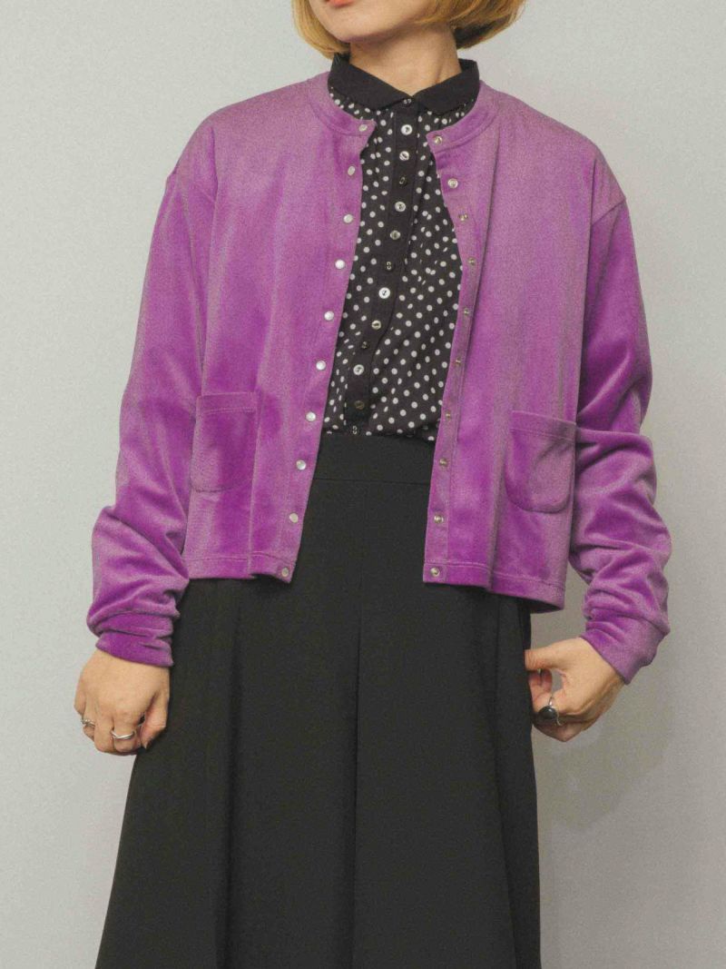 縁取りのスナップボタンがアクセントのカーディガン。