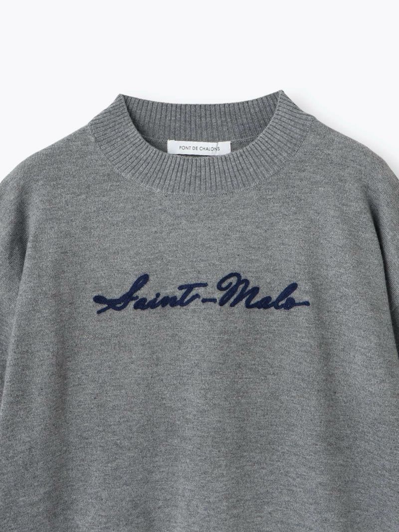 チェーンステッチ風の刺繍ロゴがアクセントのニット。