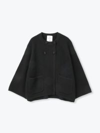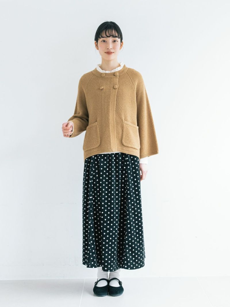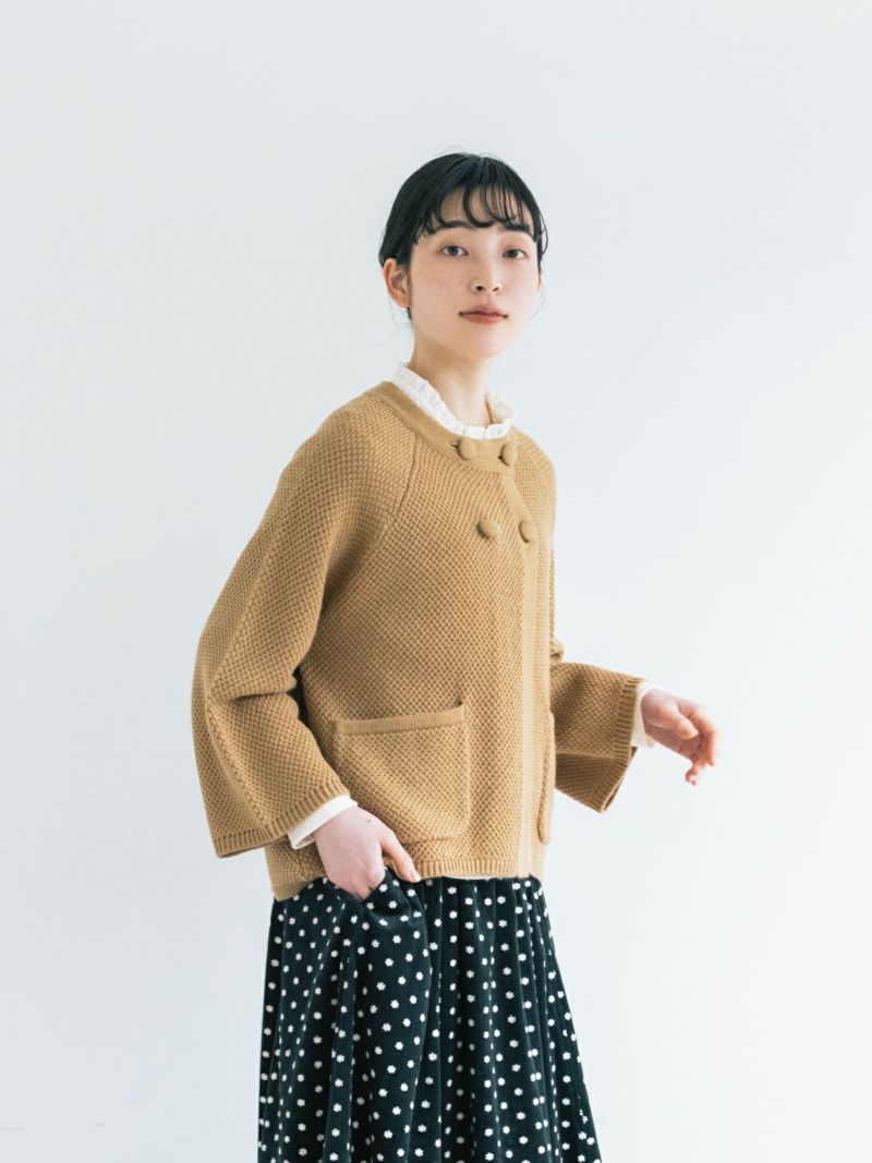 ボタンを全部閉じてニットプルオーバー風な着こなしも◎。
