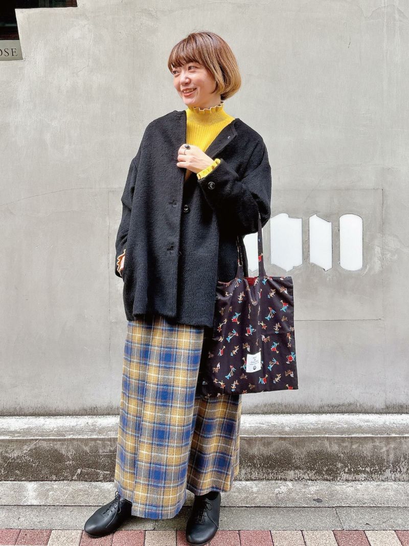 ボトムには、同じくイエローを効かせたチェック柄スカートをセレクトし、