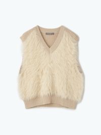 毛足の長いシャギー糸をファーのように編み込んだニットベストです。