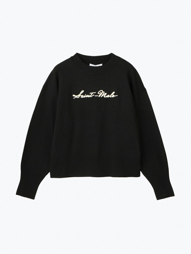 チェーンステッチ風の刺繍ロゴがアクセントのニット。