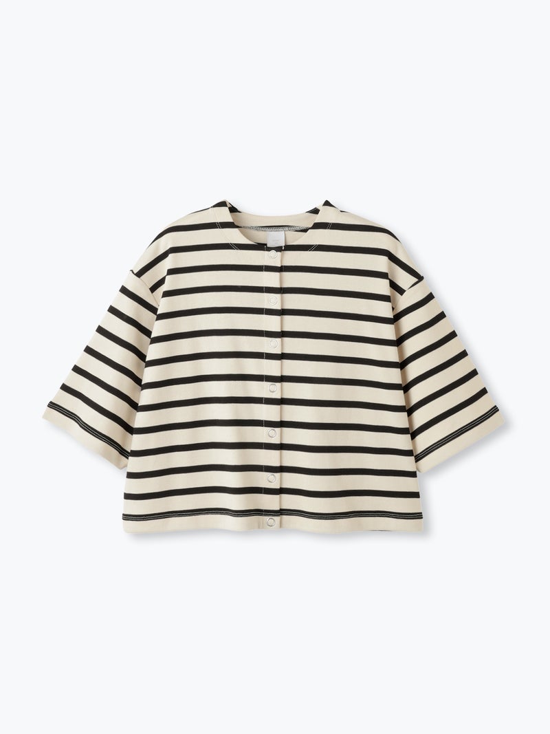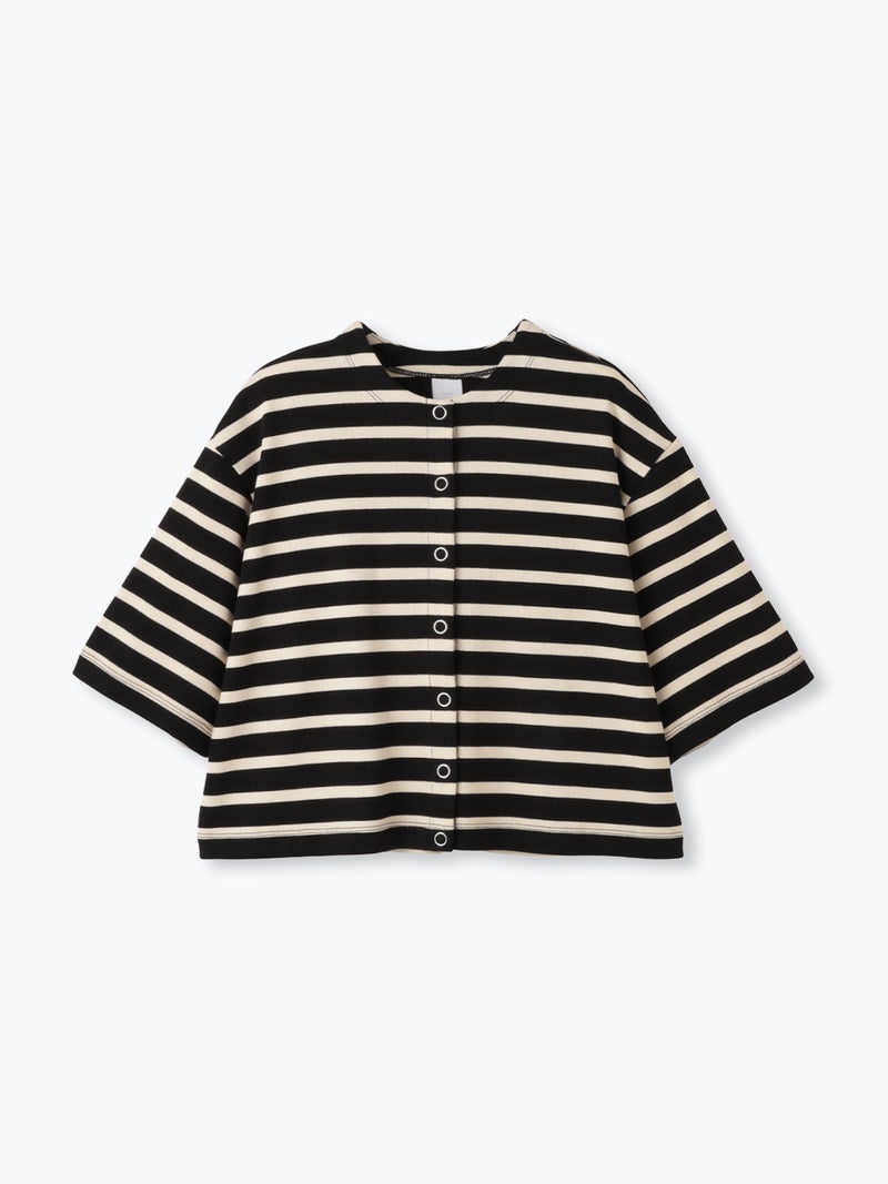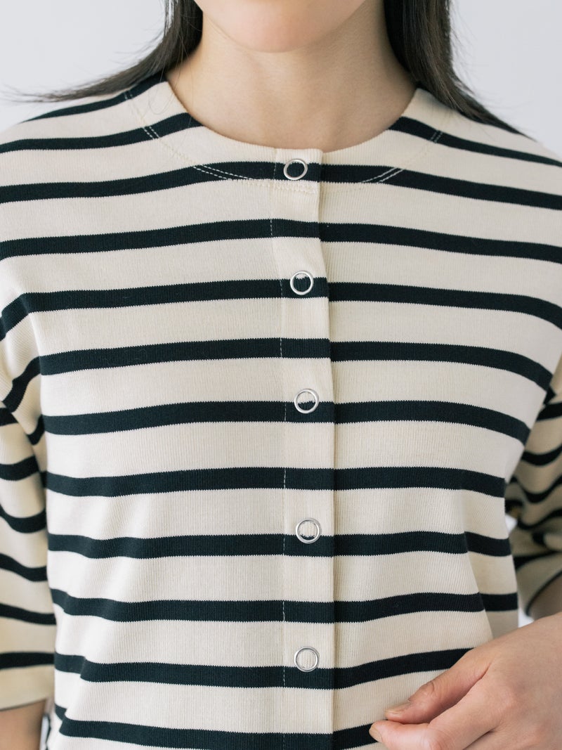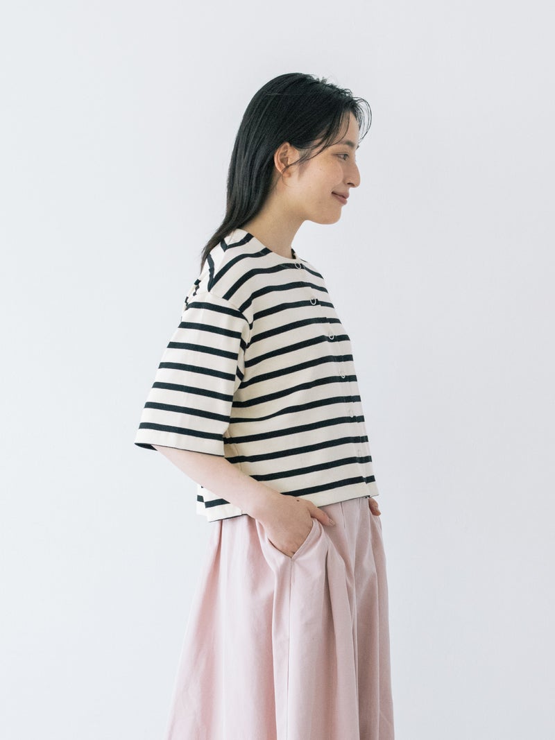 5分袖の絶妙な丈感で全体をすっきりとまとめ、
