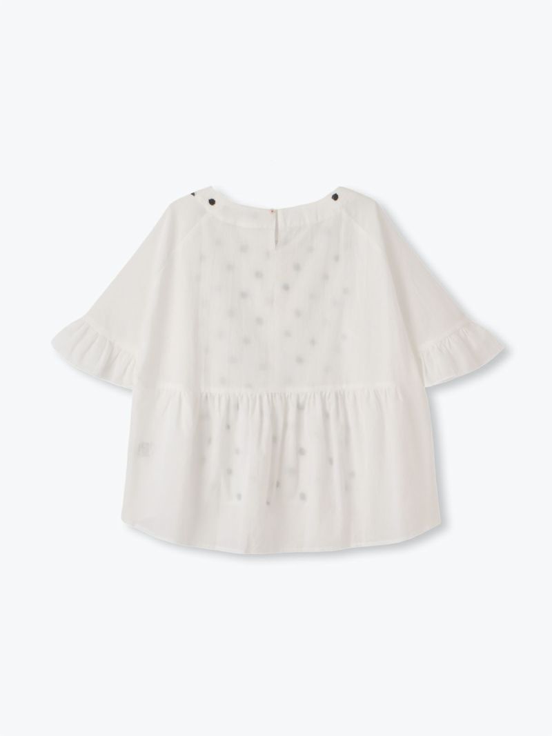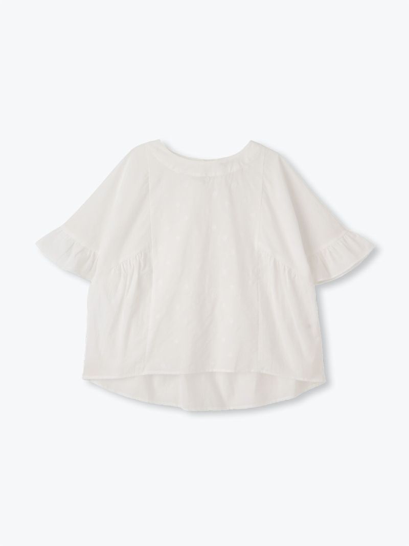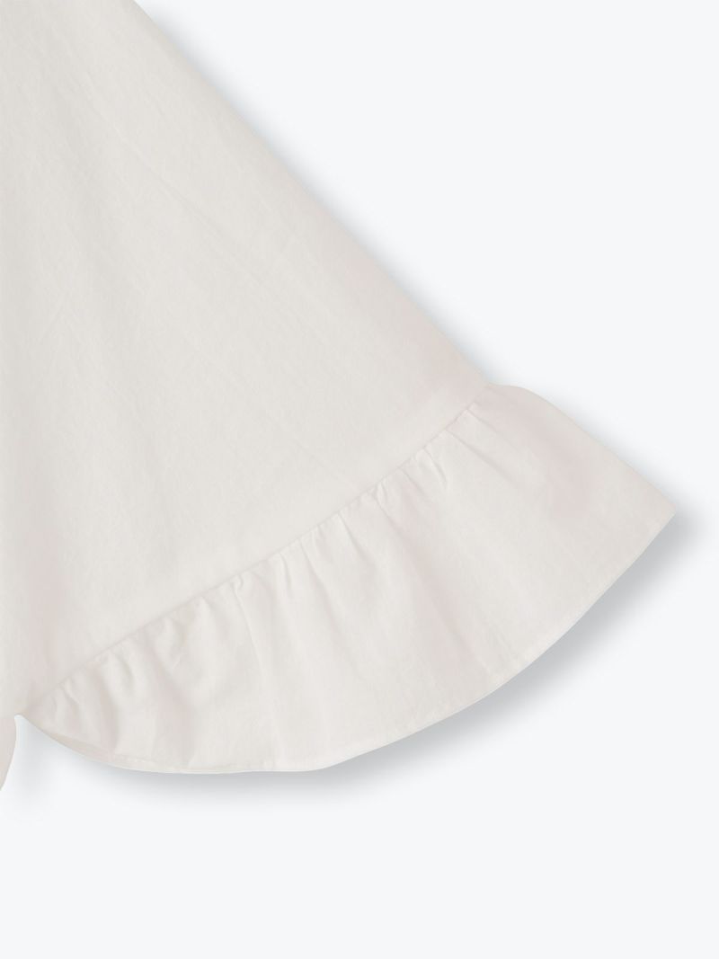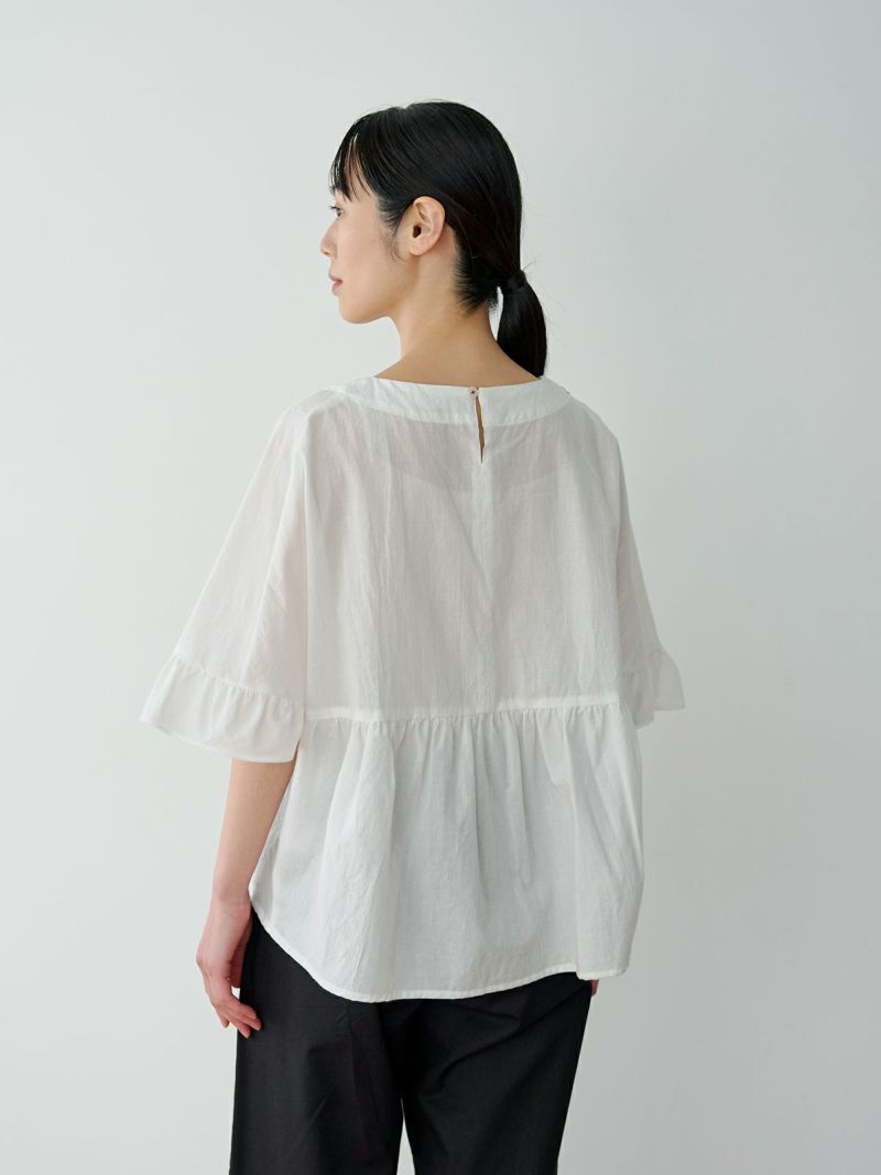 こなれ感のあるドロップショルダーに小さなフリル袖が
