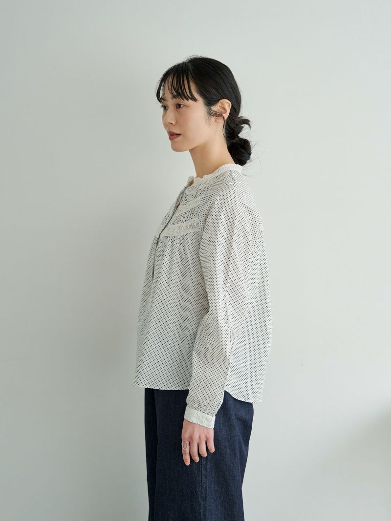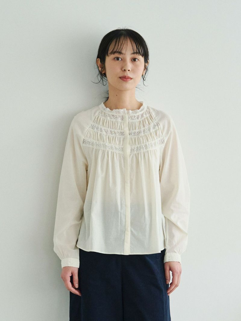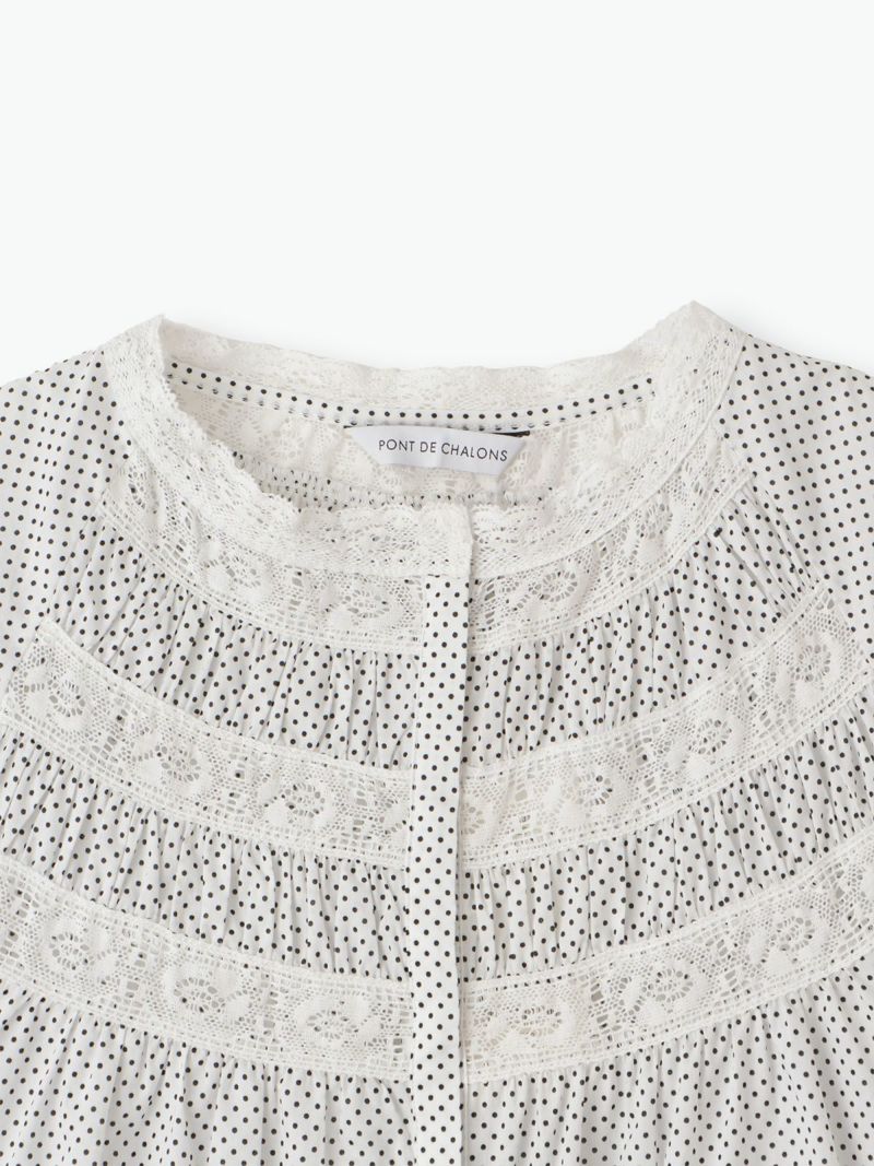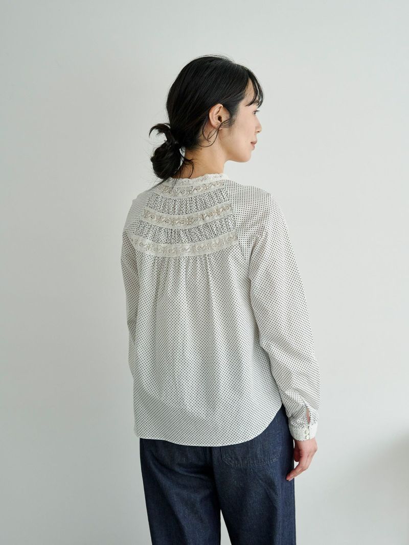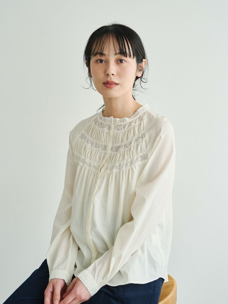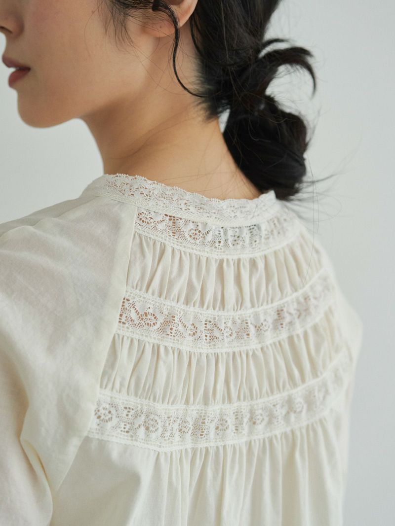衿元や袖口、フロントのレースを効かせて、