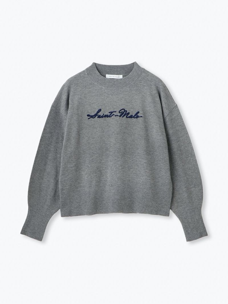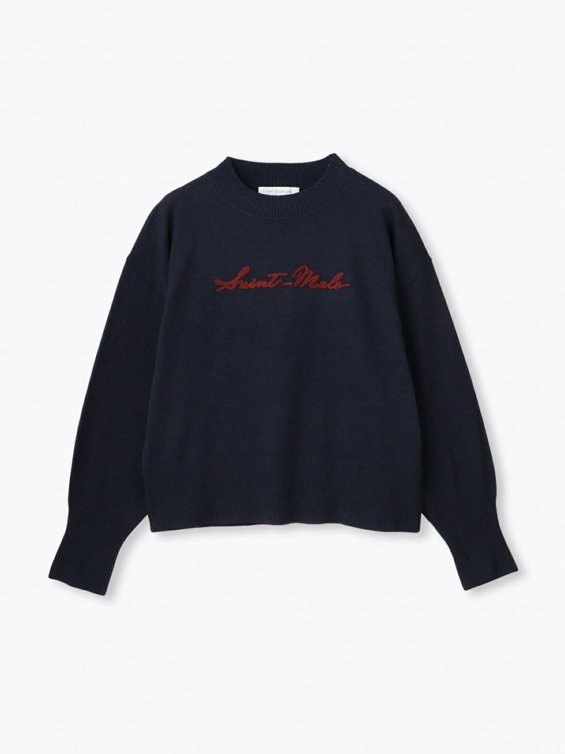 チェーンステッチ風の刺繍ロゴがアクセントのニット。