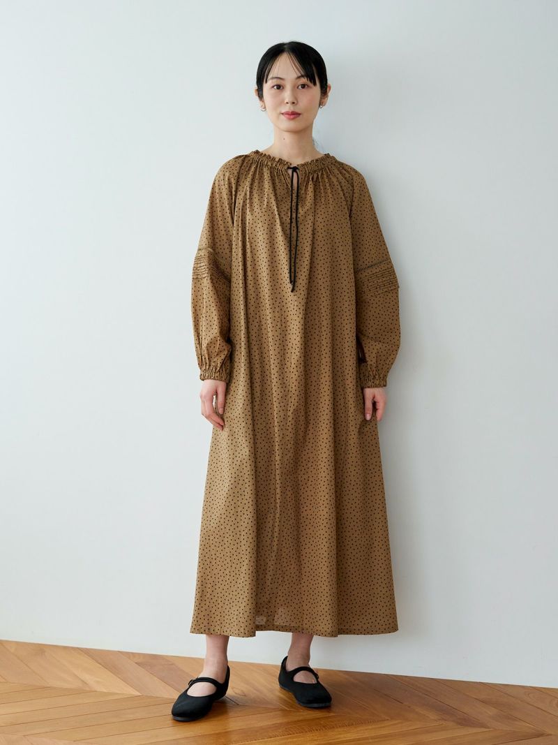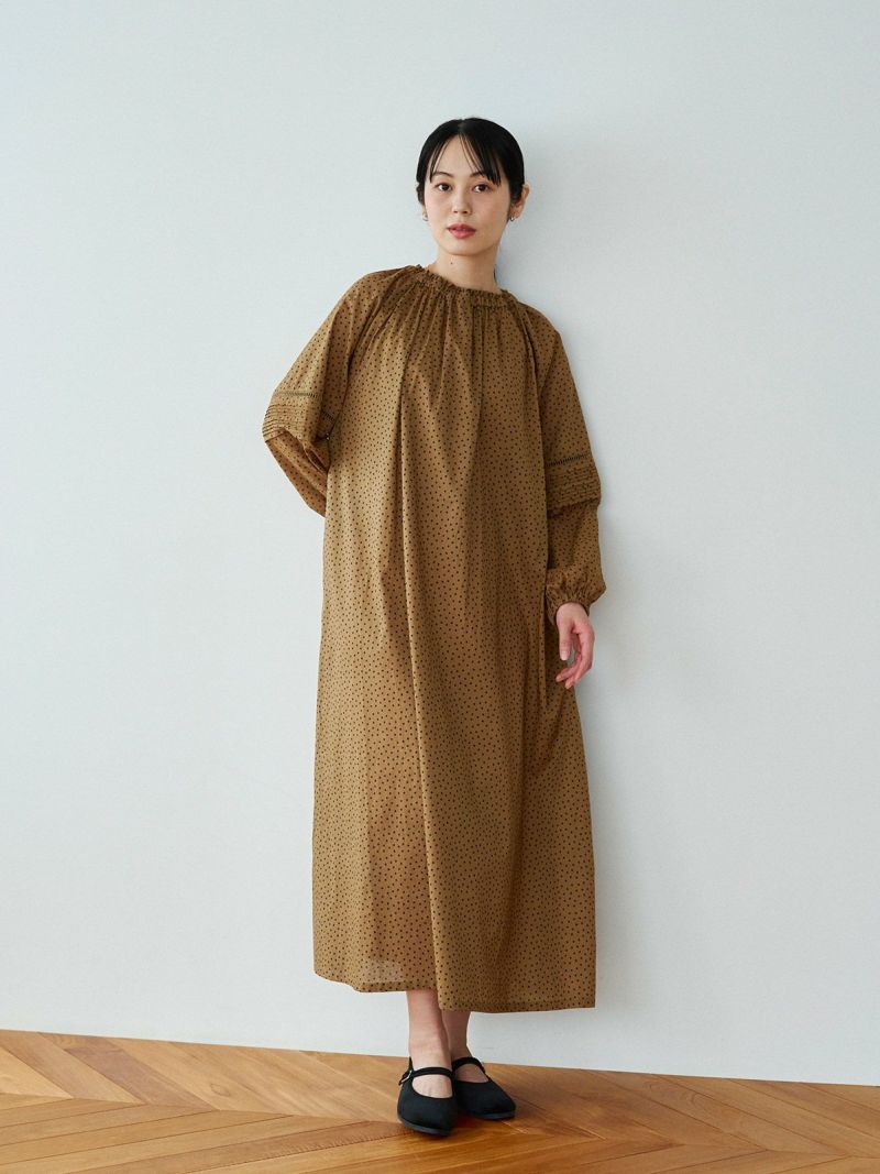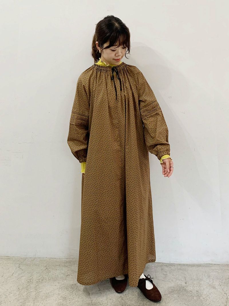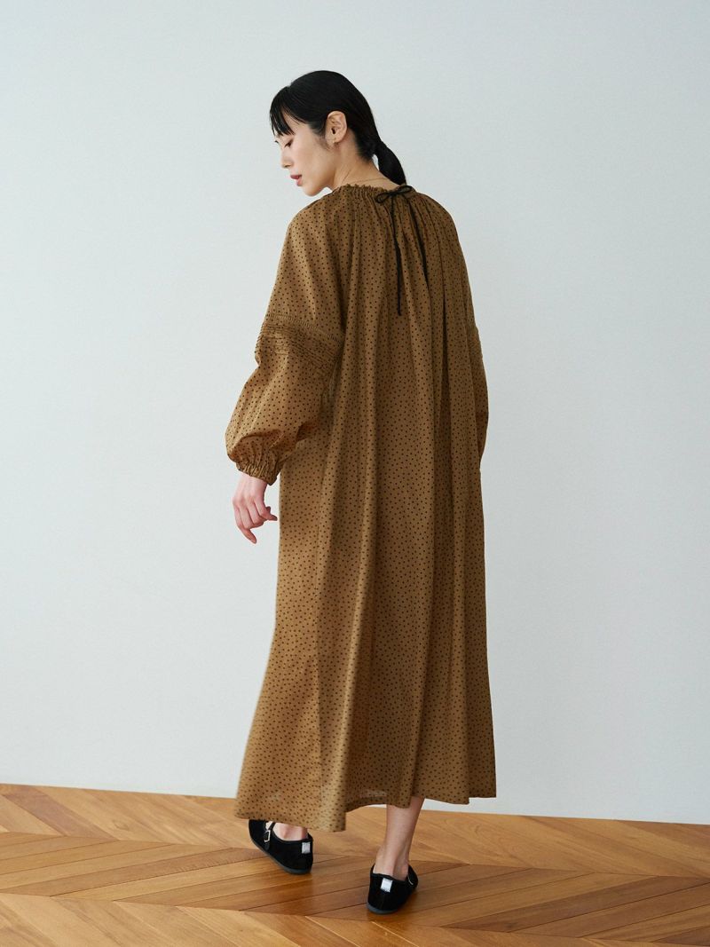 ボリュームのあるギャザーネックが華やかなワンピース。
