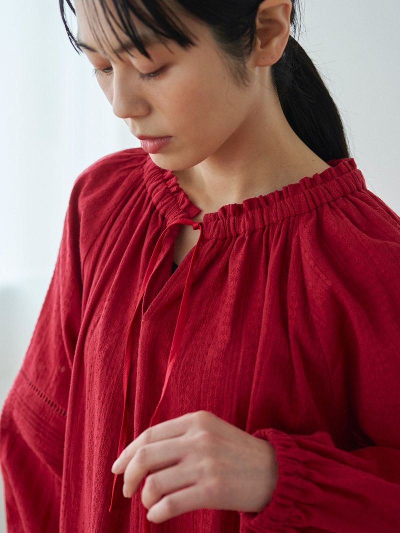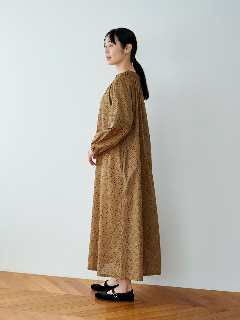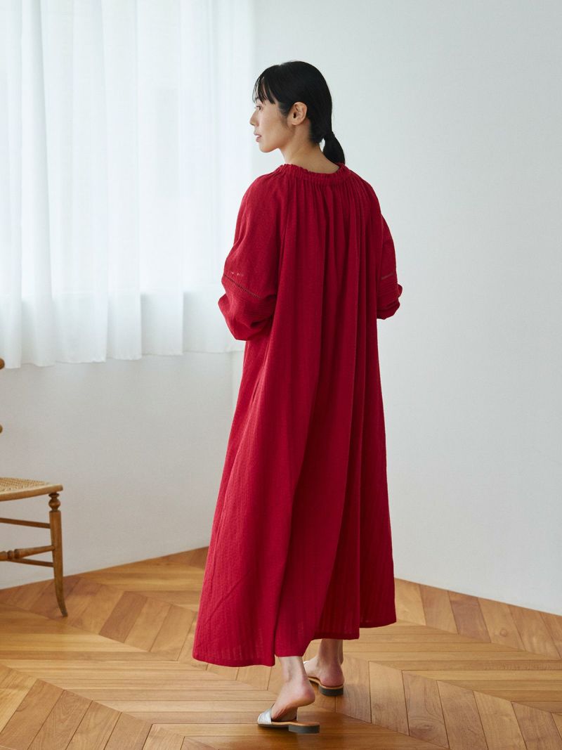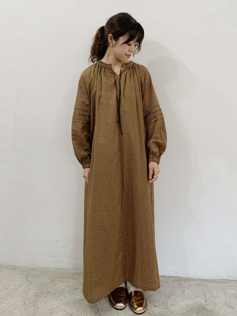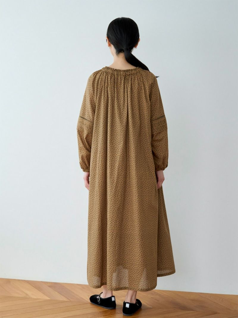 ボリュームのあるギャザーネックが華やかなワンピース。