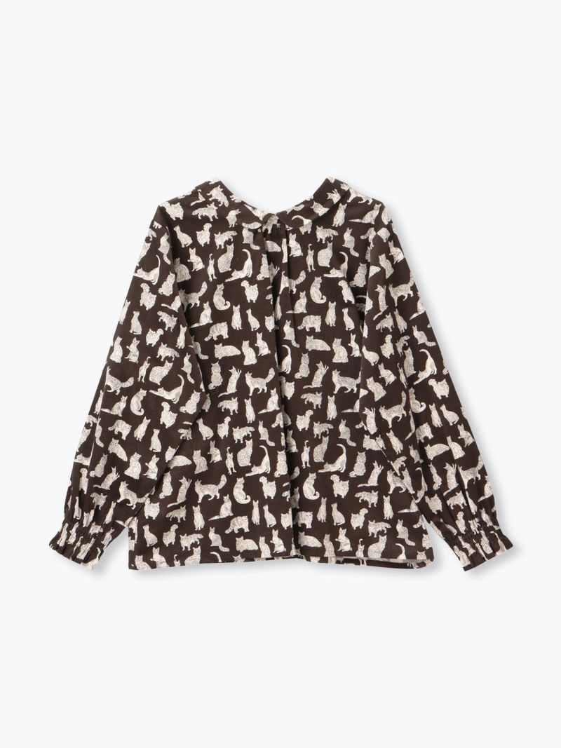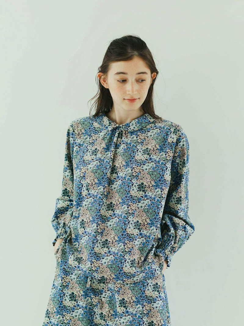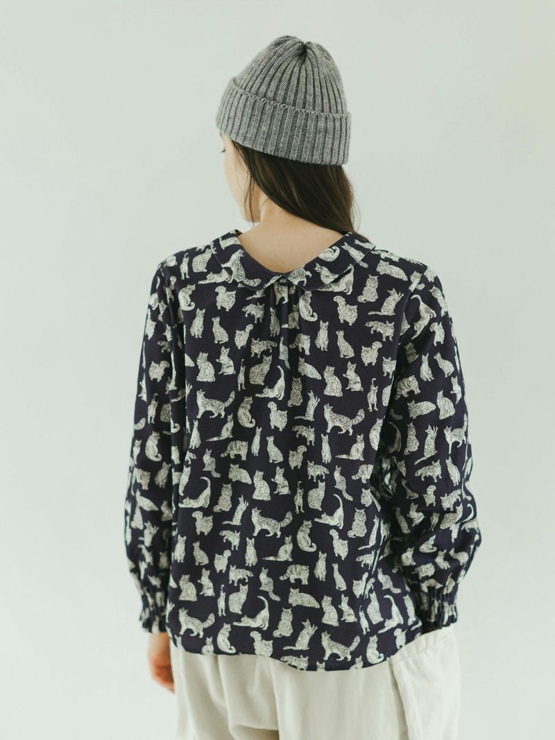 シャーリングの衿と袖が人気の定番前後2WAYブラウスを