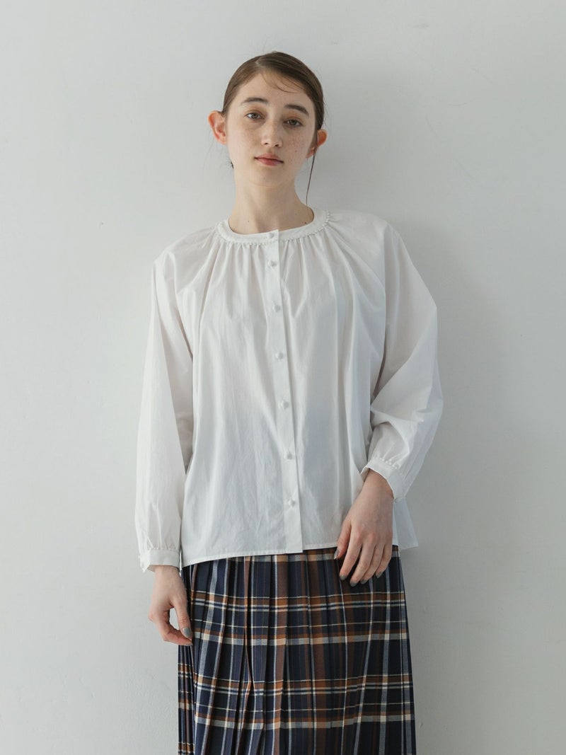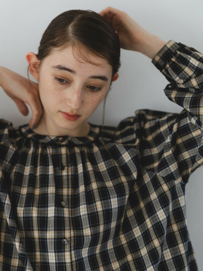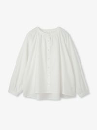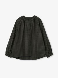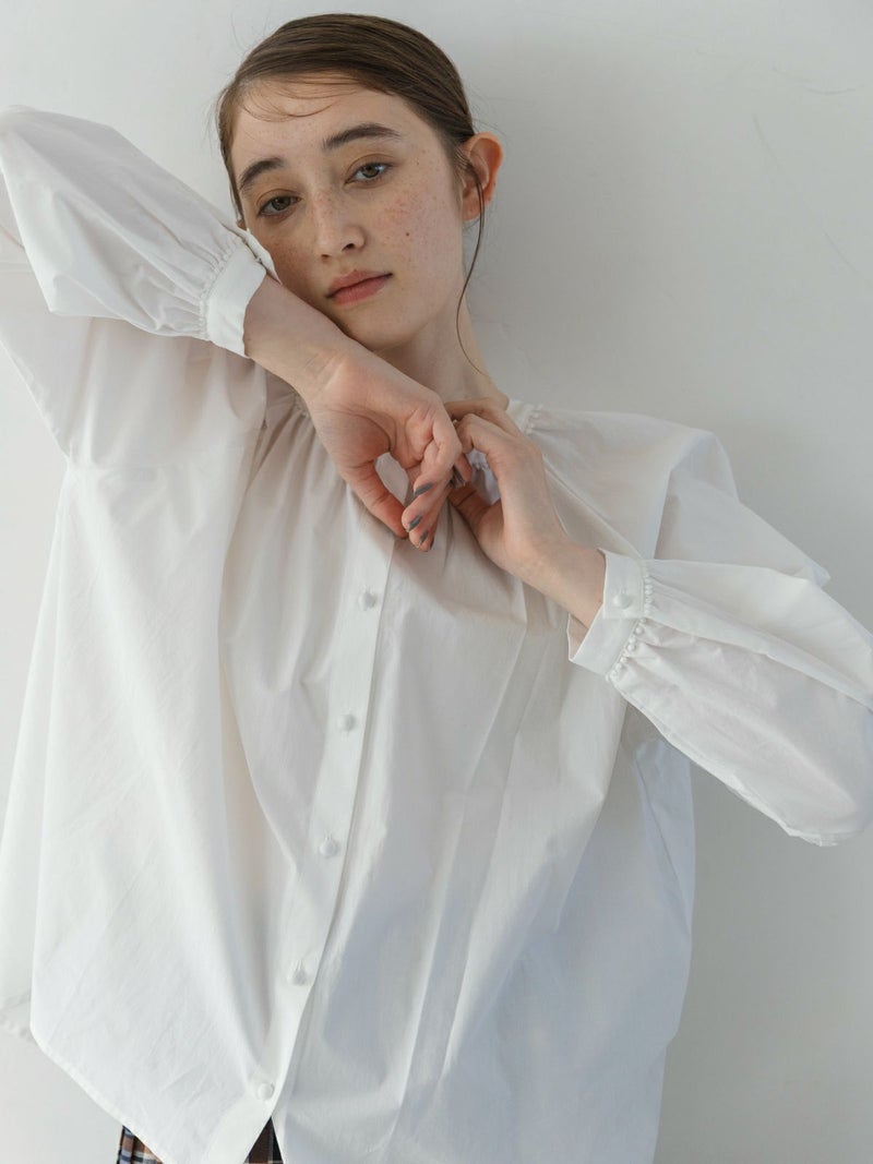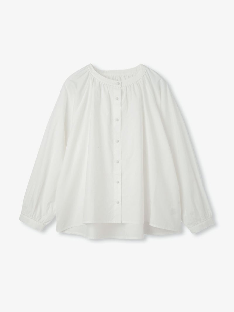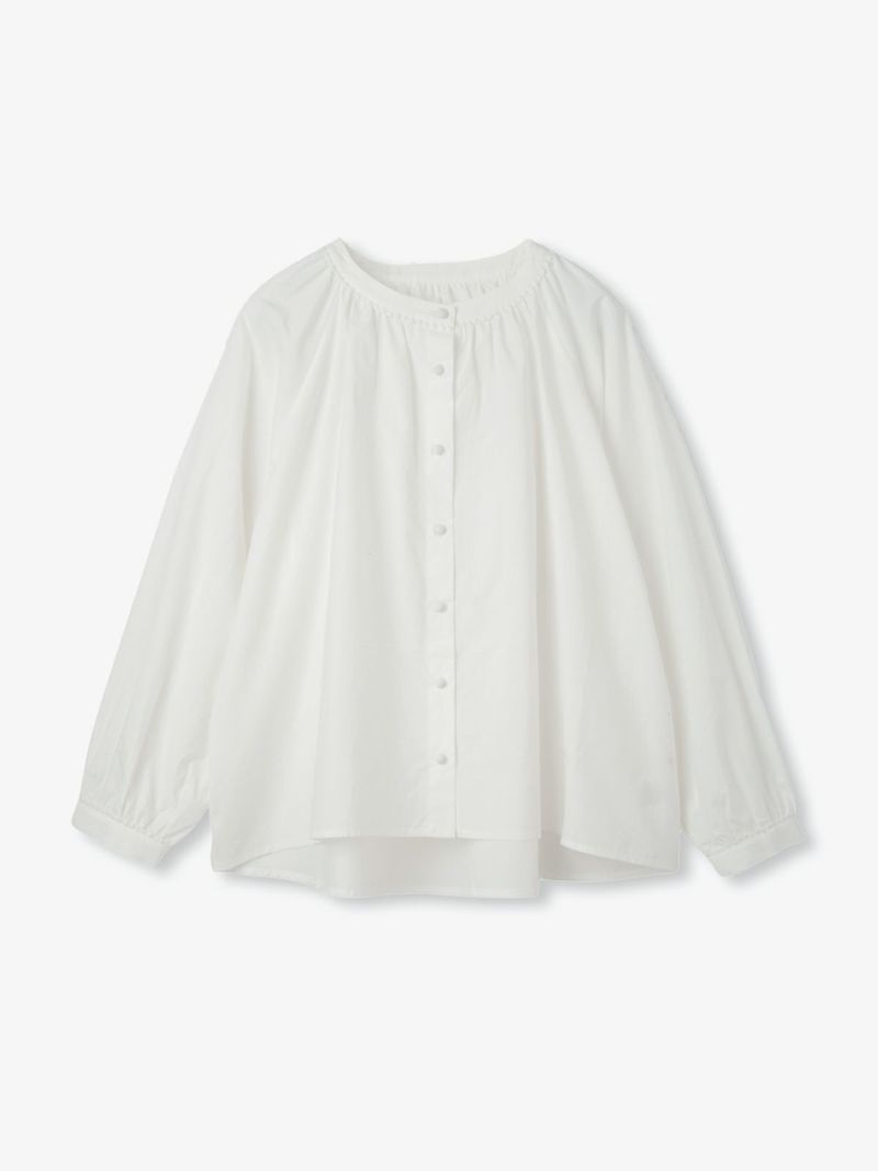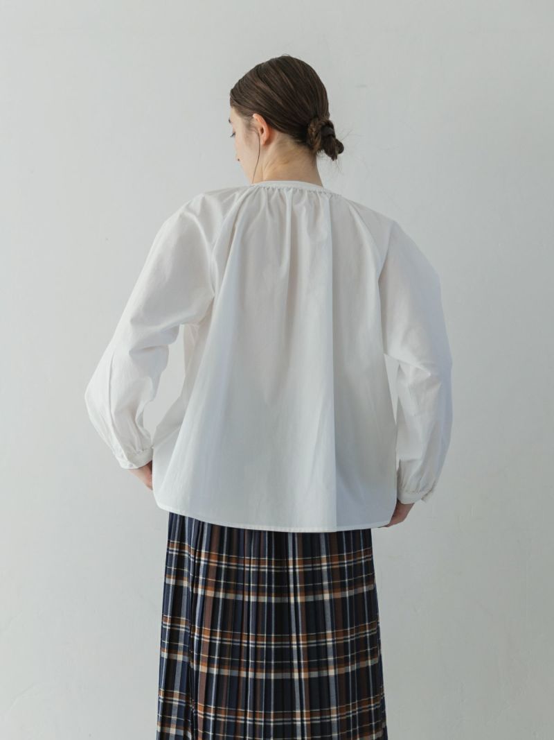 前後の衿ぐりにたっぷりとギャザーを入れ裾に向かって広がる身頃。