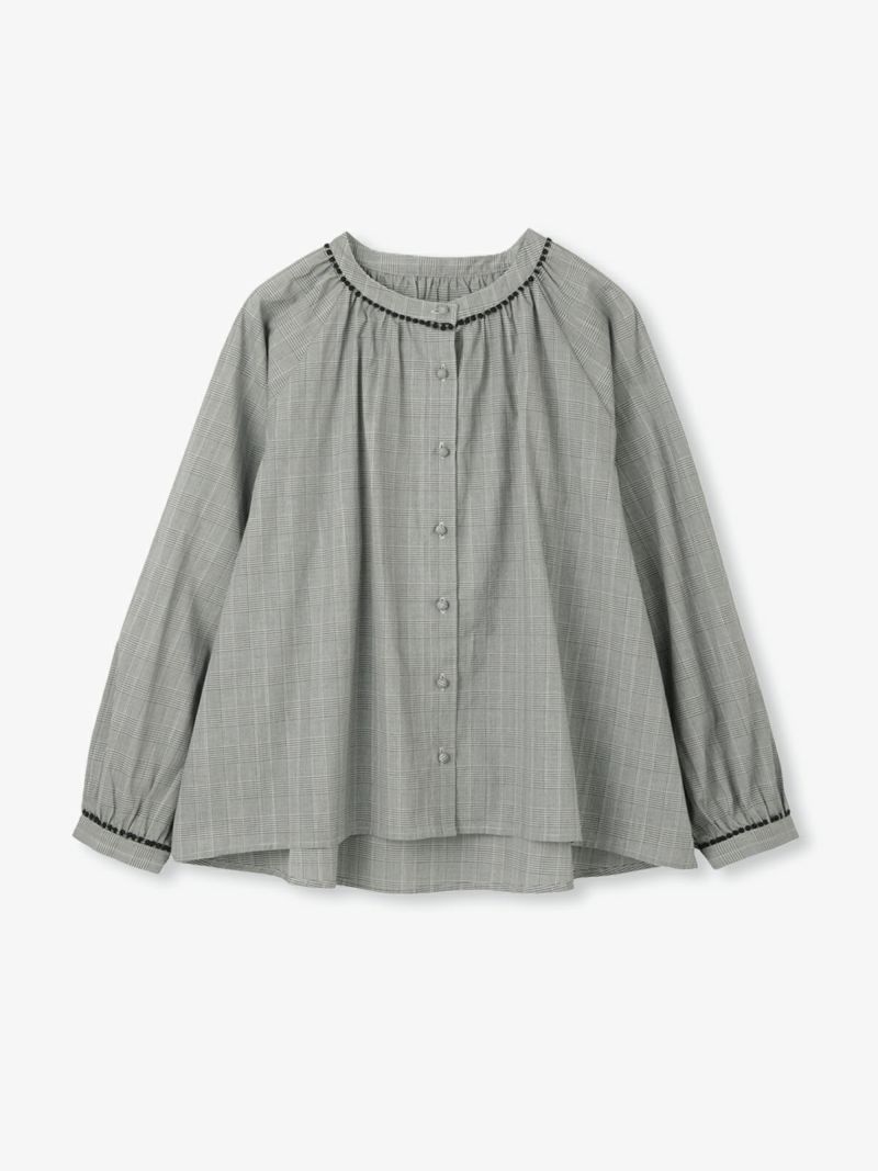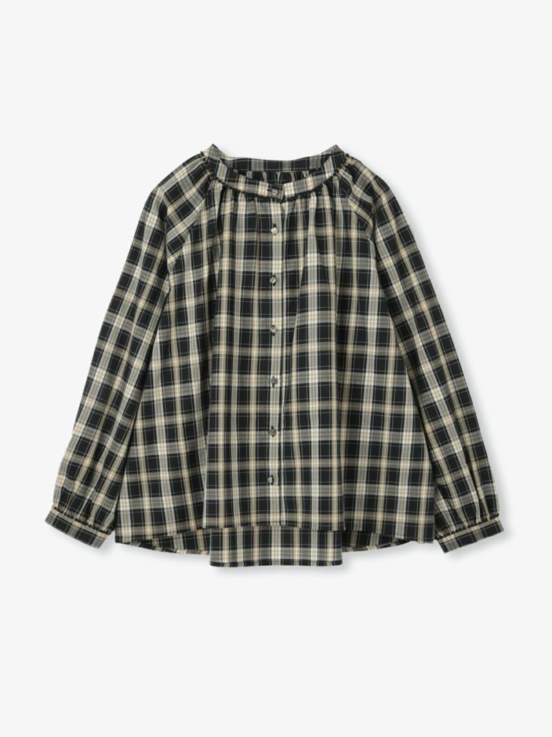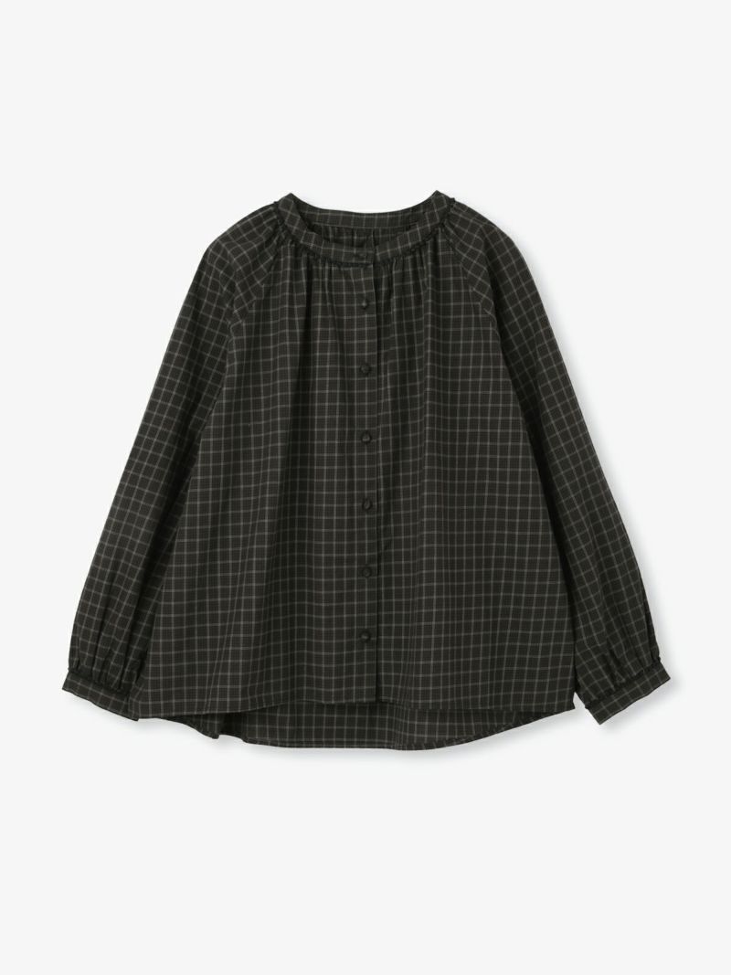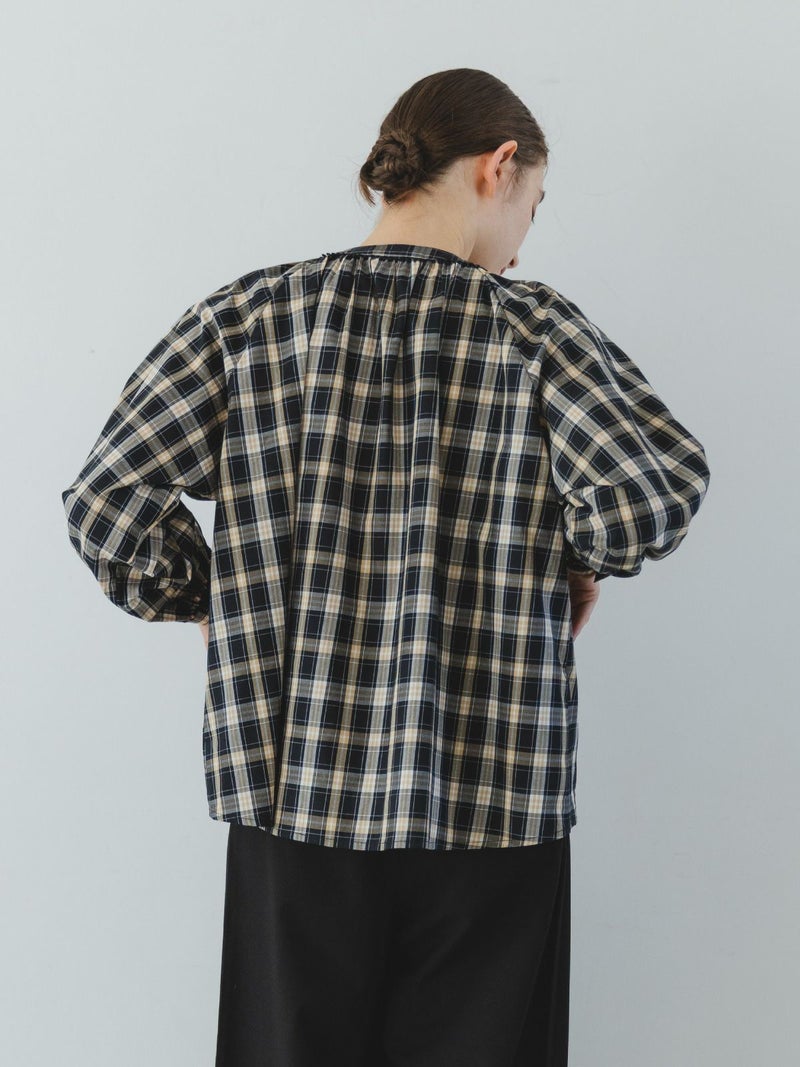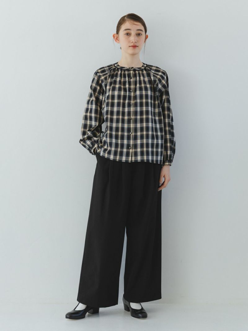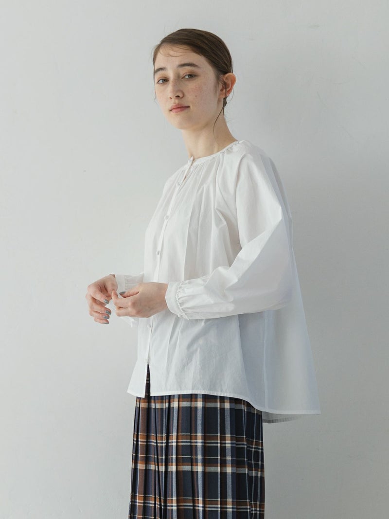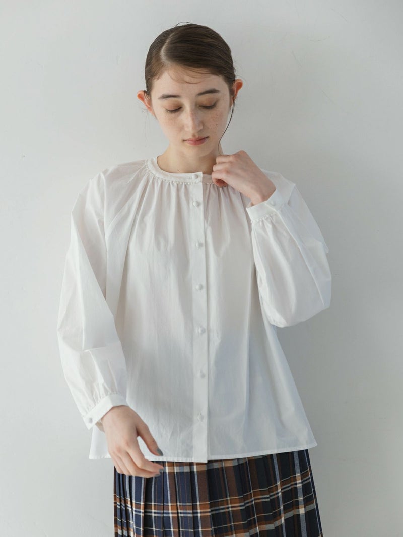前後の衿ぐりにたっぷりとギャザーを入れ裾に向かって広がる身頃。