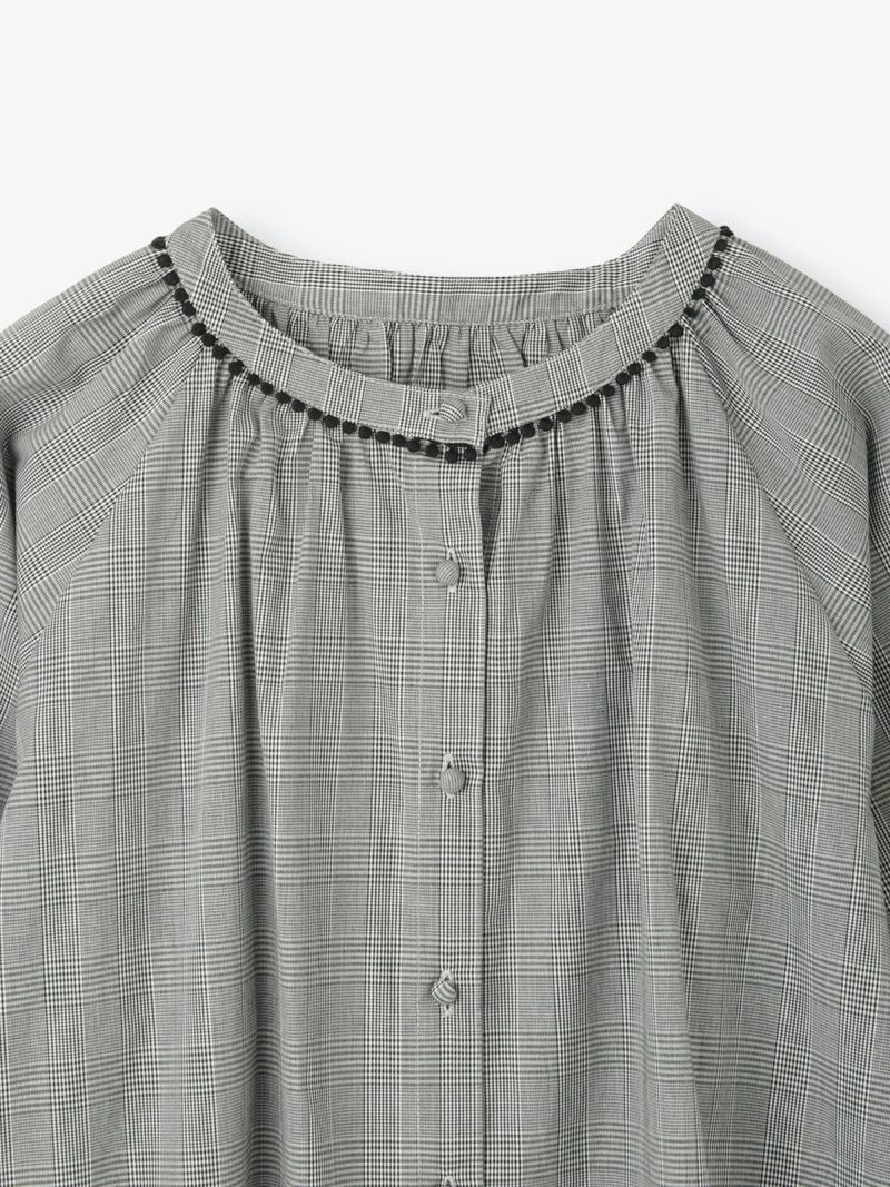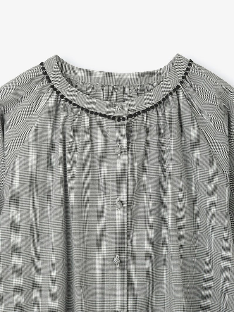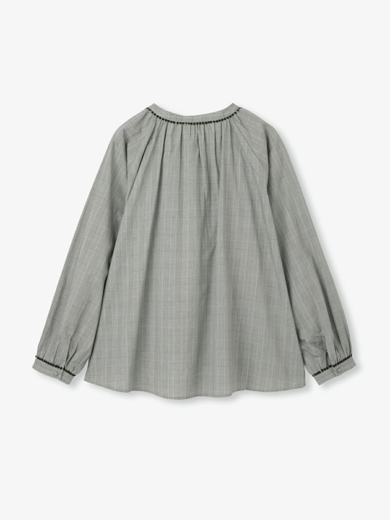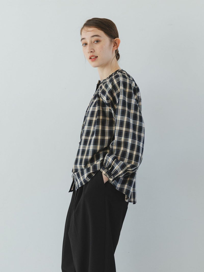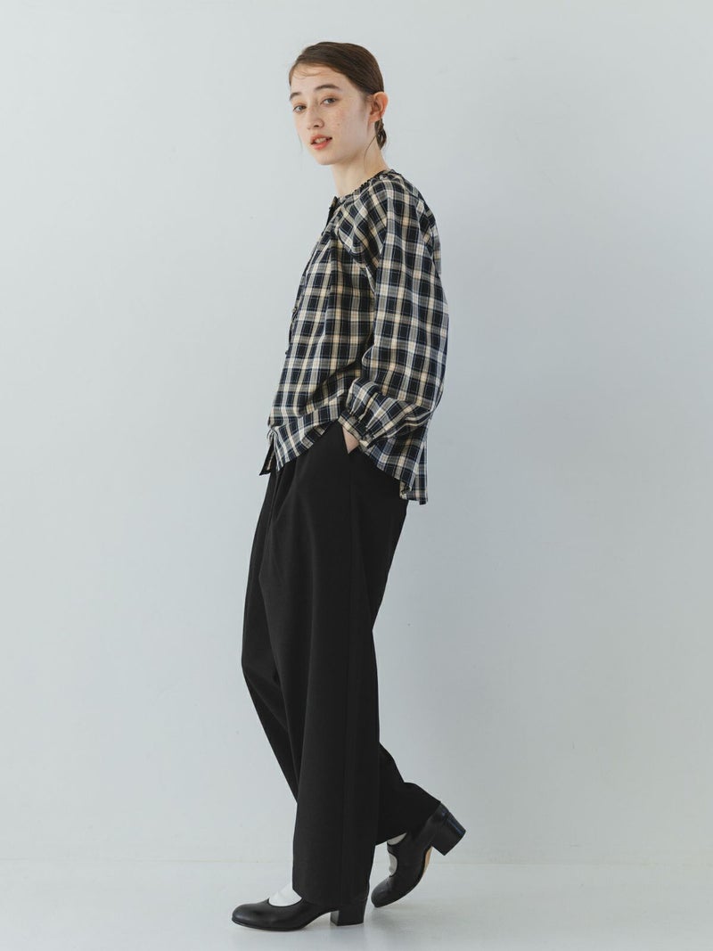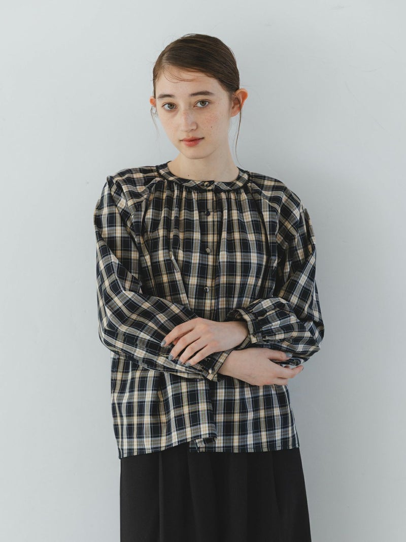 前後の衿ぐりにたっぷりとギャザーを入れ裾に向かって広がる身頃。