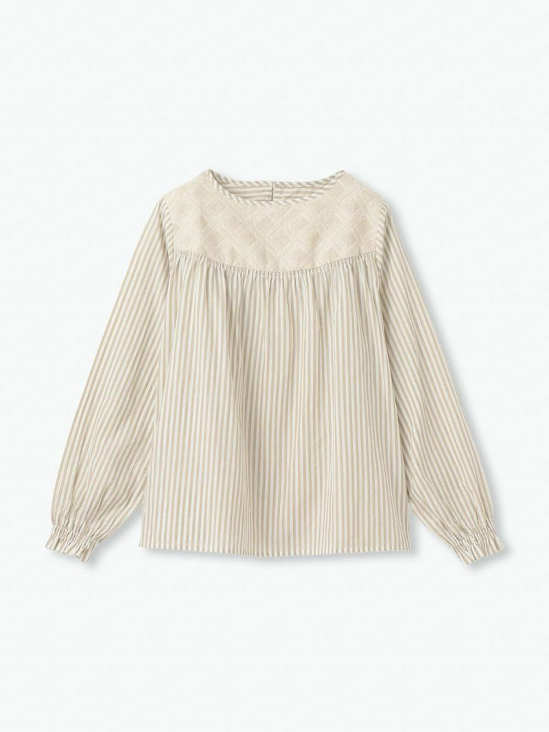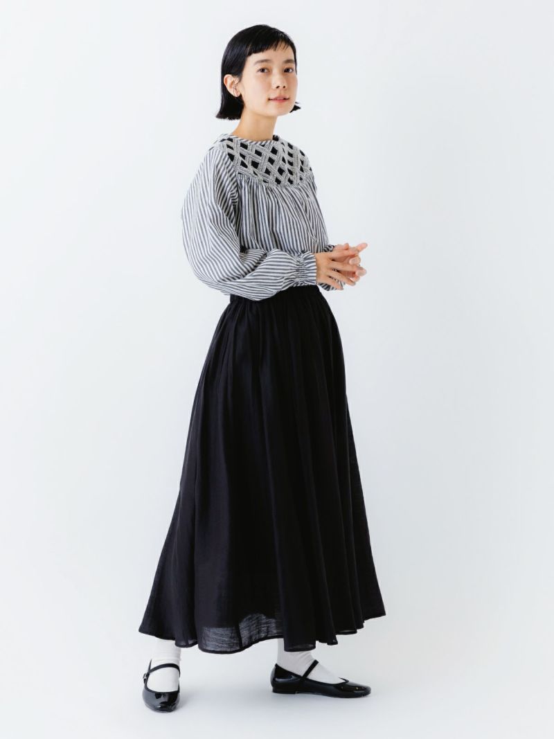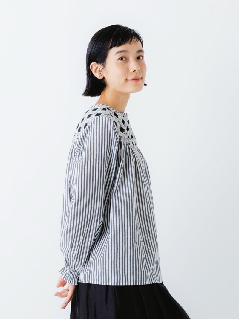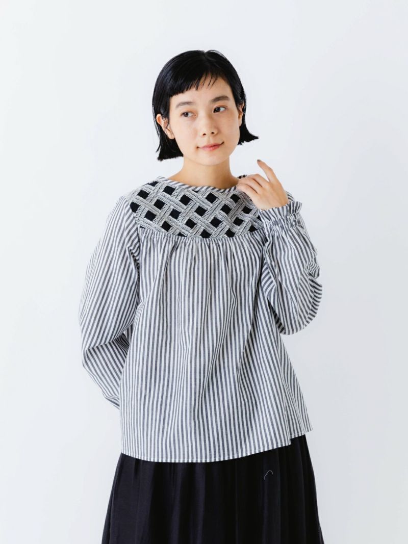 印象的な格子の刺繍生地をぐるりとヨーク部分で切替えました。