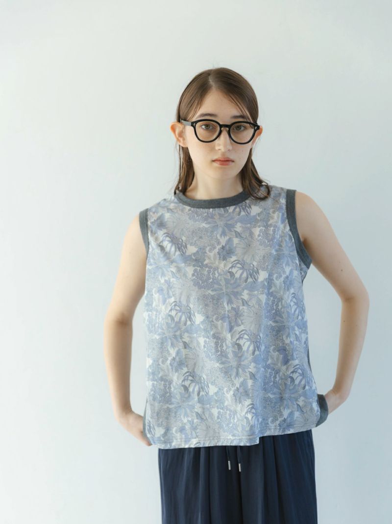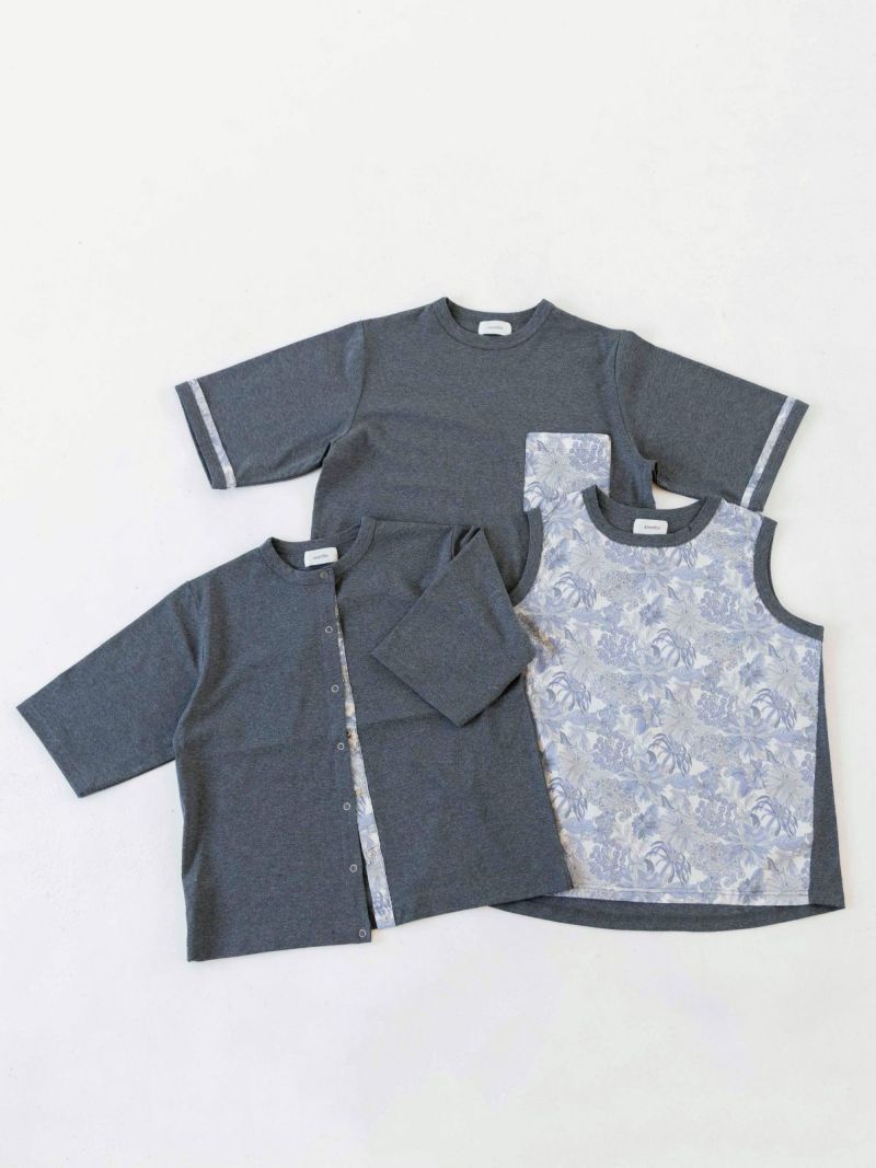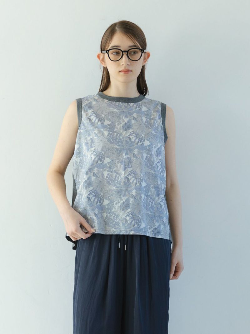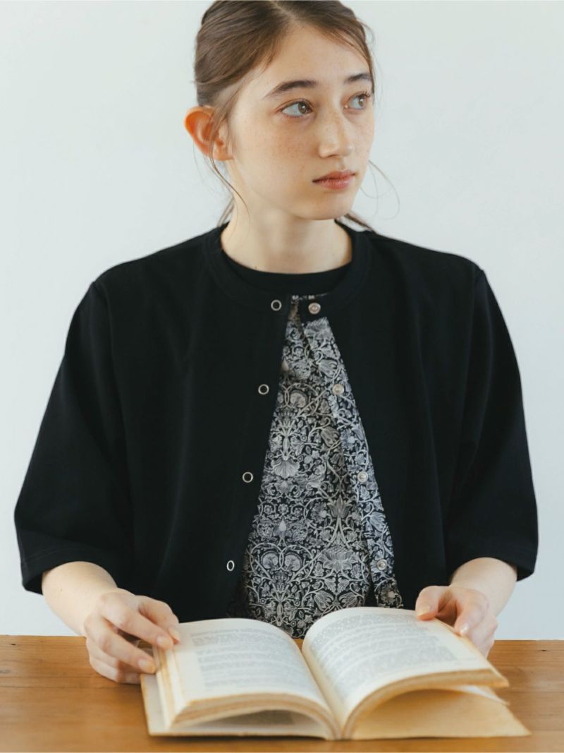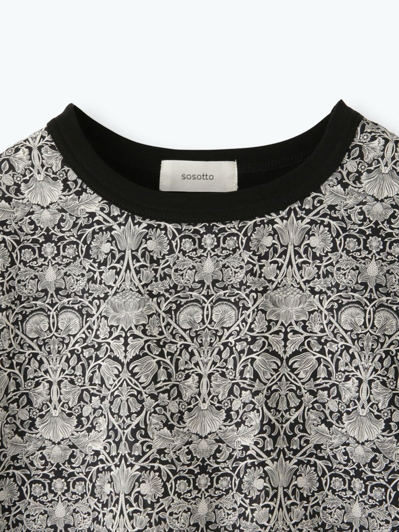 首回りはすっきりと見えるバインダー始末で、前身頃にLIBETYPRINTを全面に使い