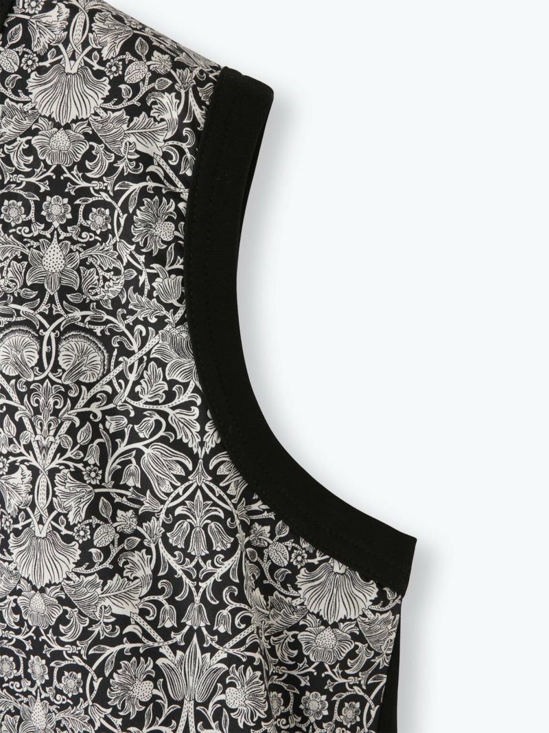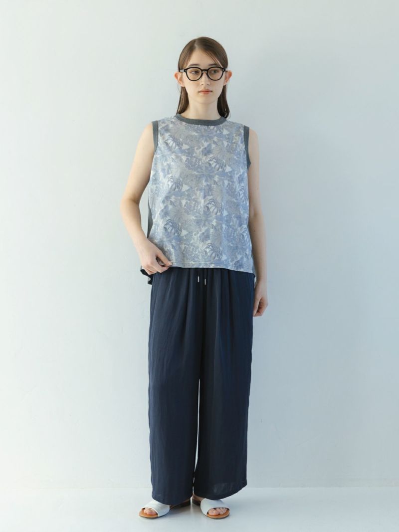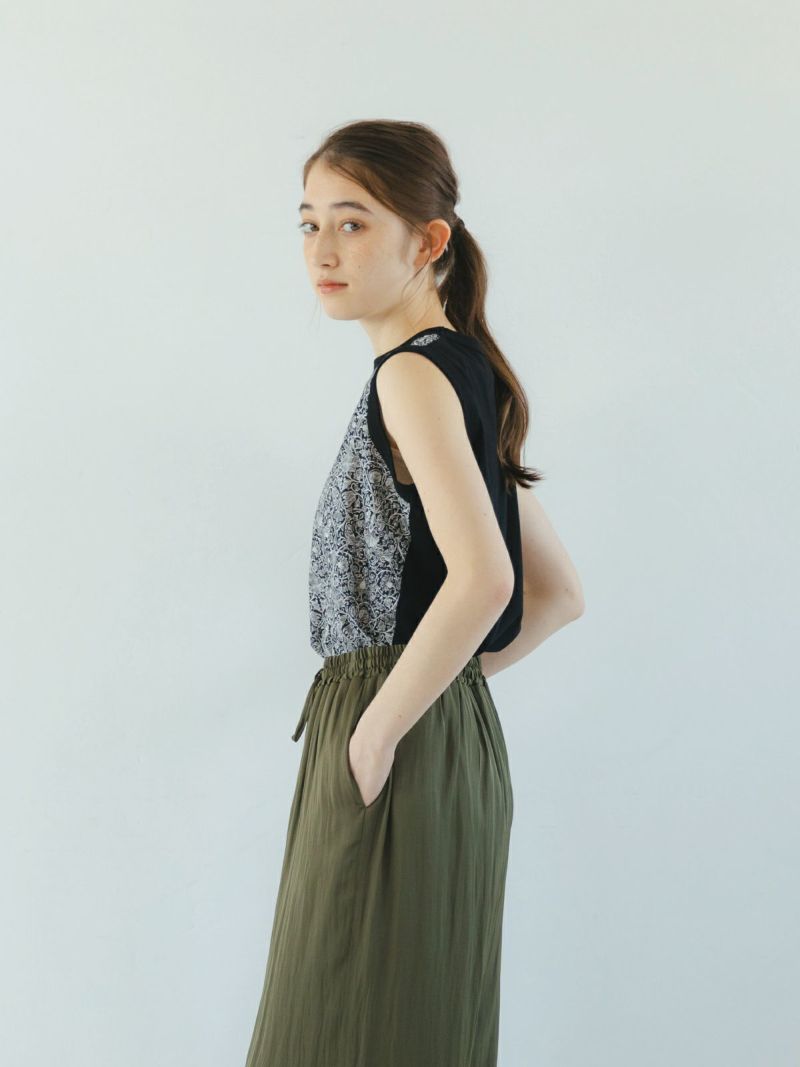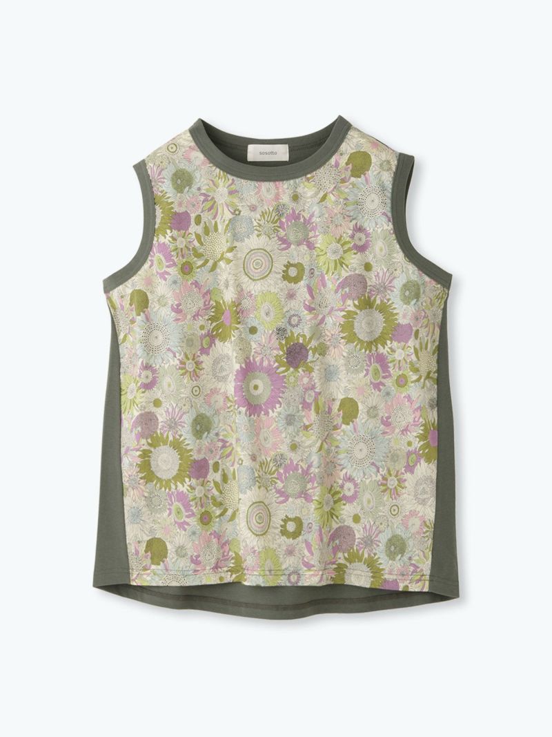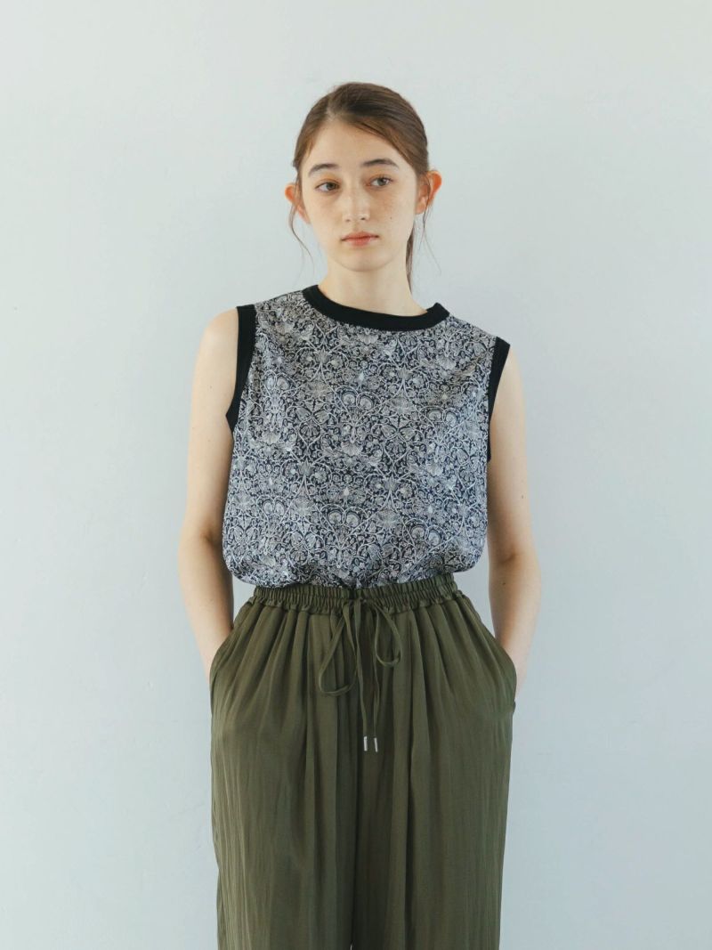 首回りはすっきりと見えるバインダー始末で、前身頃にLIBETYPRINTを全面に使い