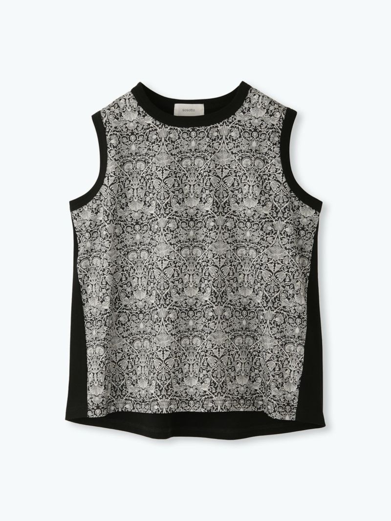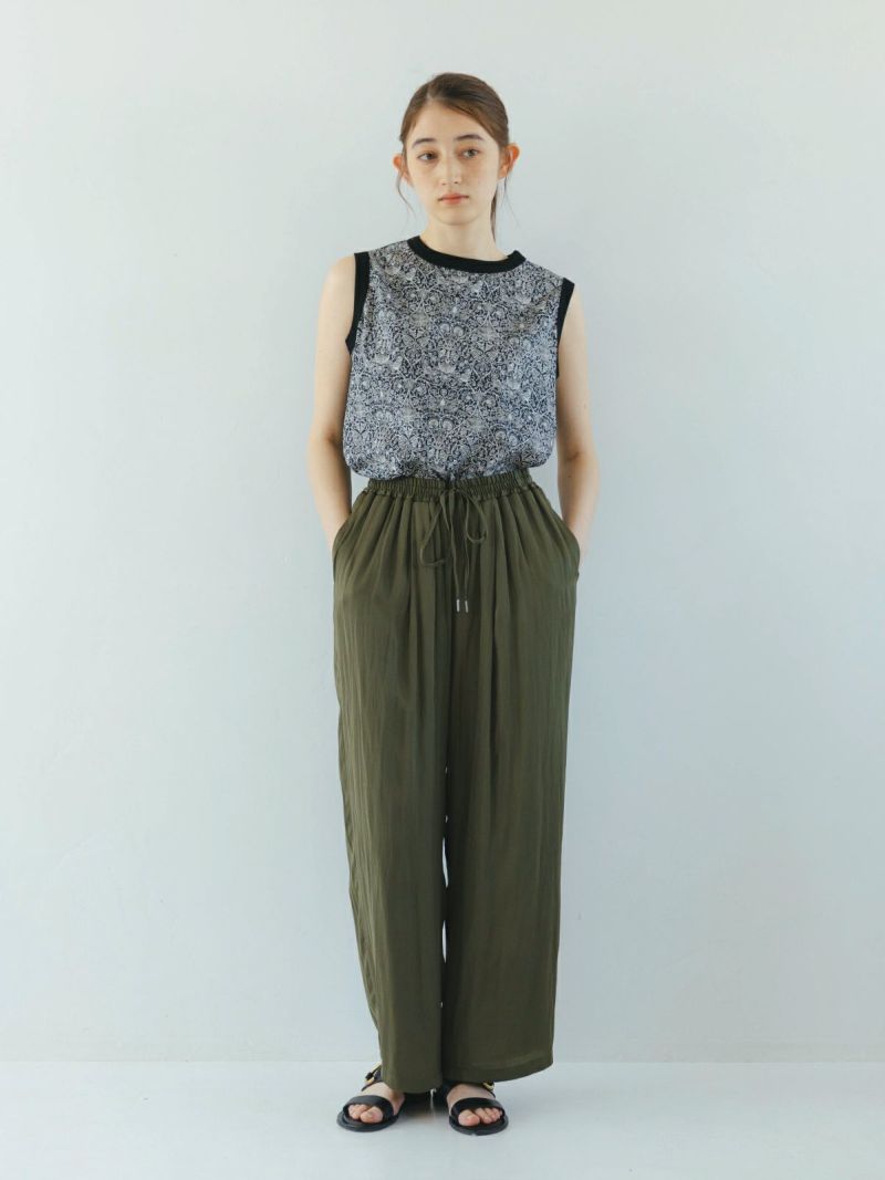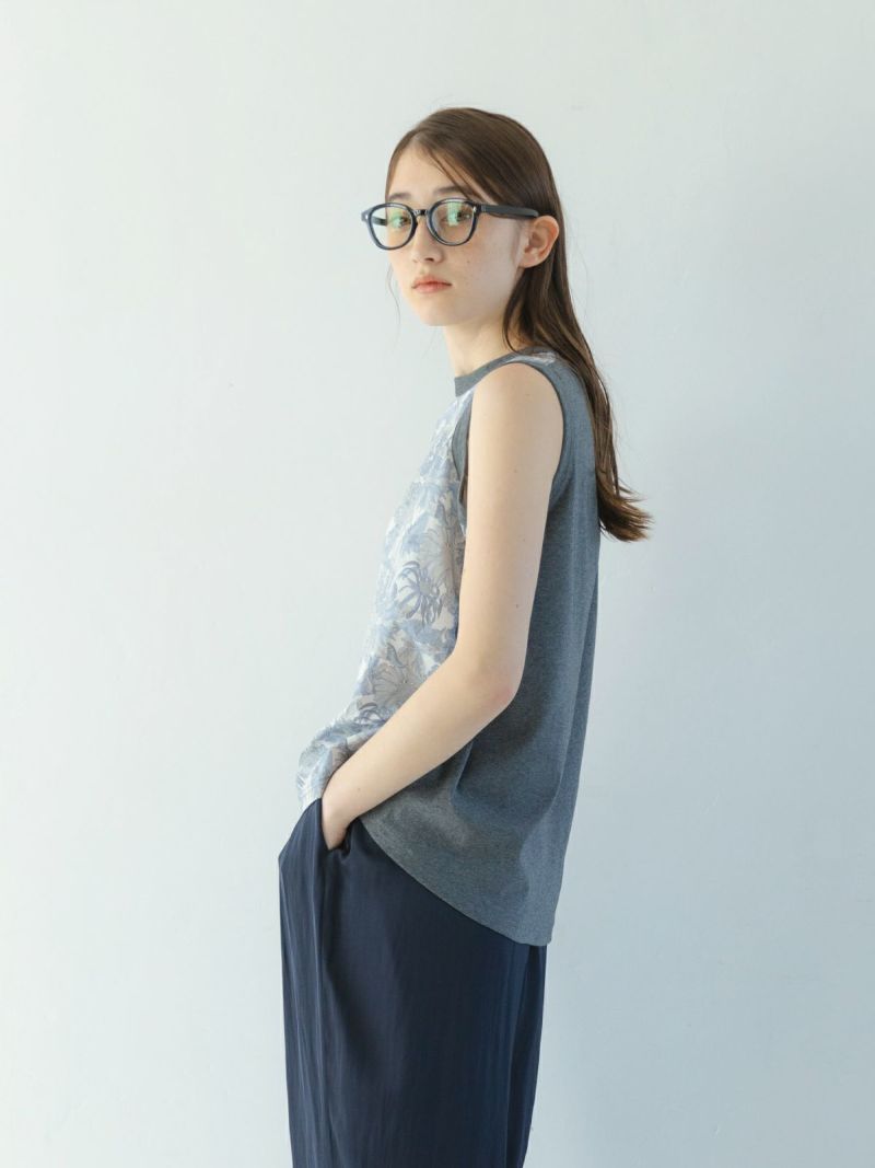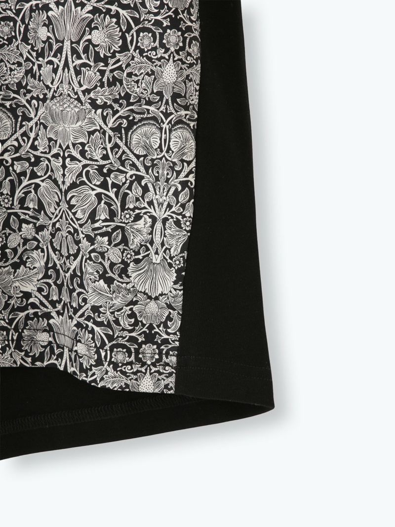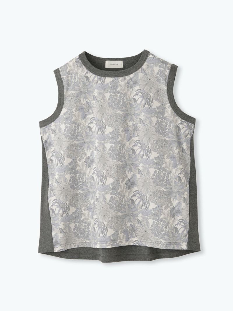 首回りはすっきりと見えるバインダー始末で、前身頃にLIBETYPRINTを全面に使い