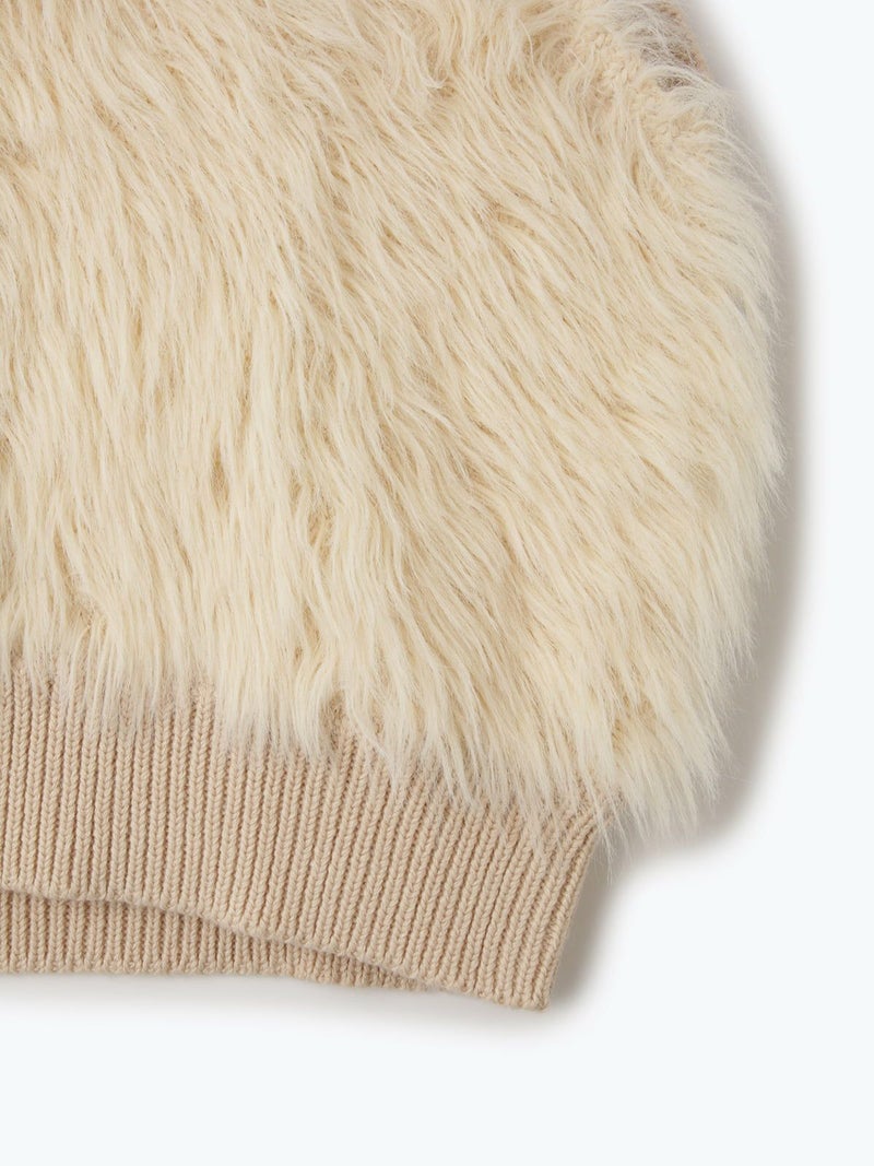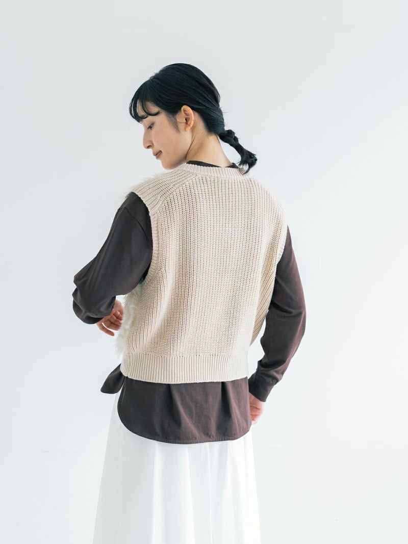毛足の長いシャギー糸をファーのように編み込んだニットベストです。