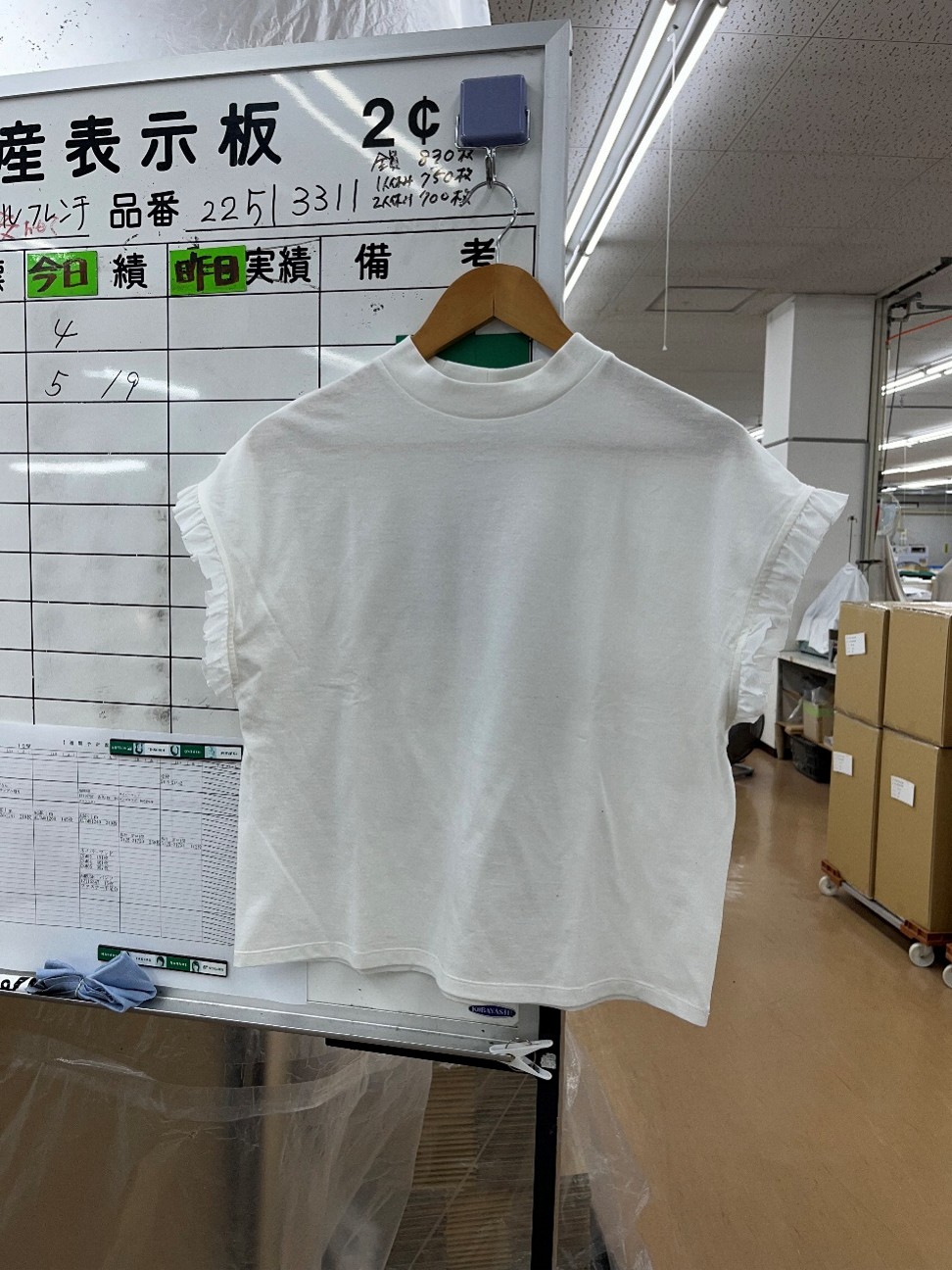 裁断された布はコンテナに積まれ、ミシンチームに渡されます。
