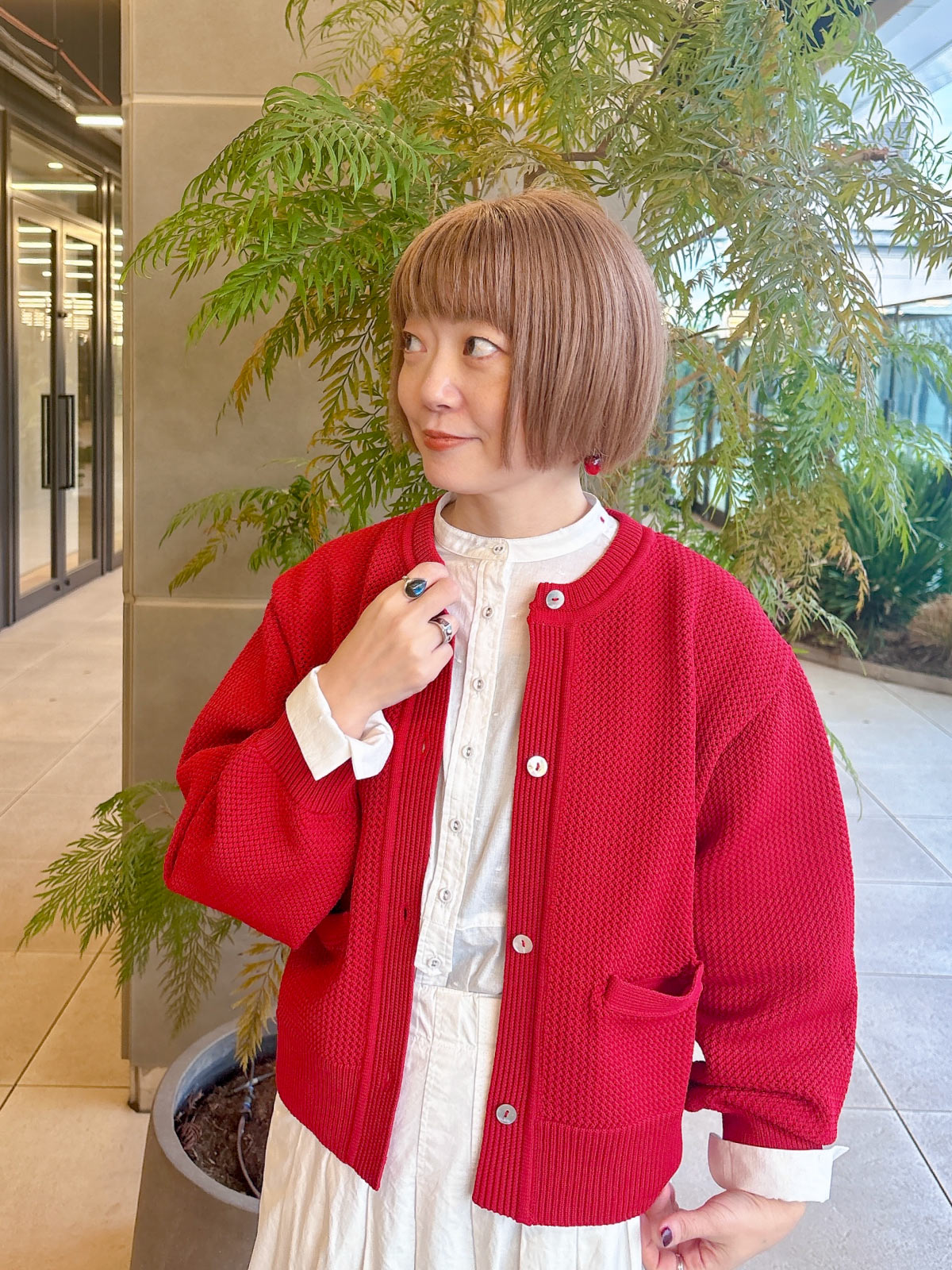 カーディガンからちらりと覗く刺繍が、