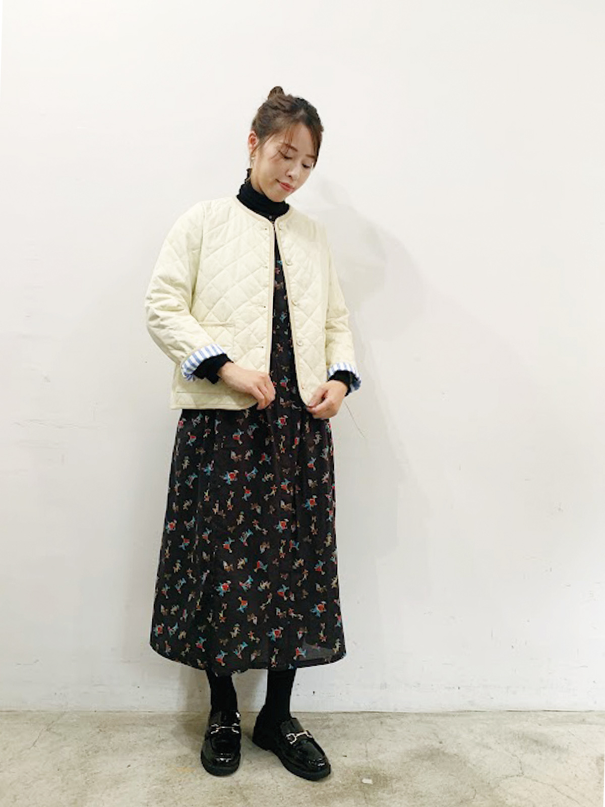 上品な装いとキルティングジャケットのスタイルで