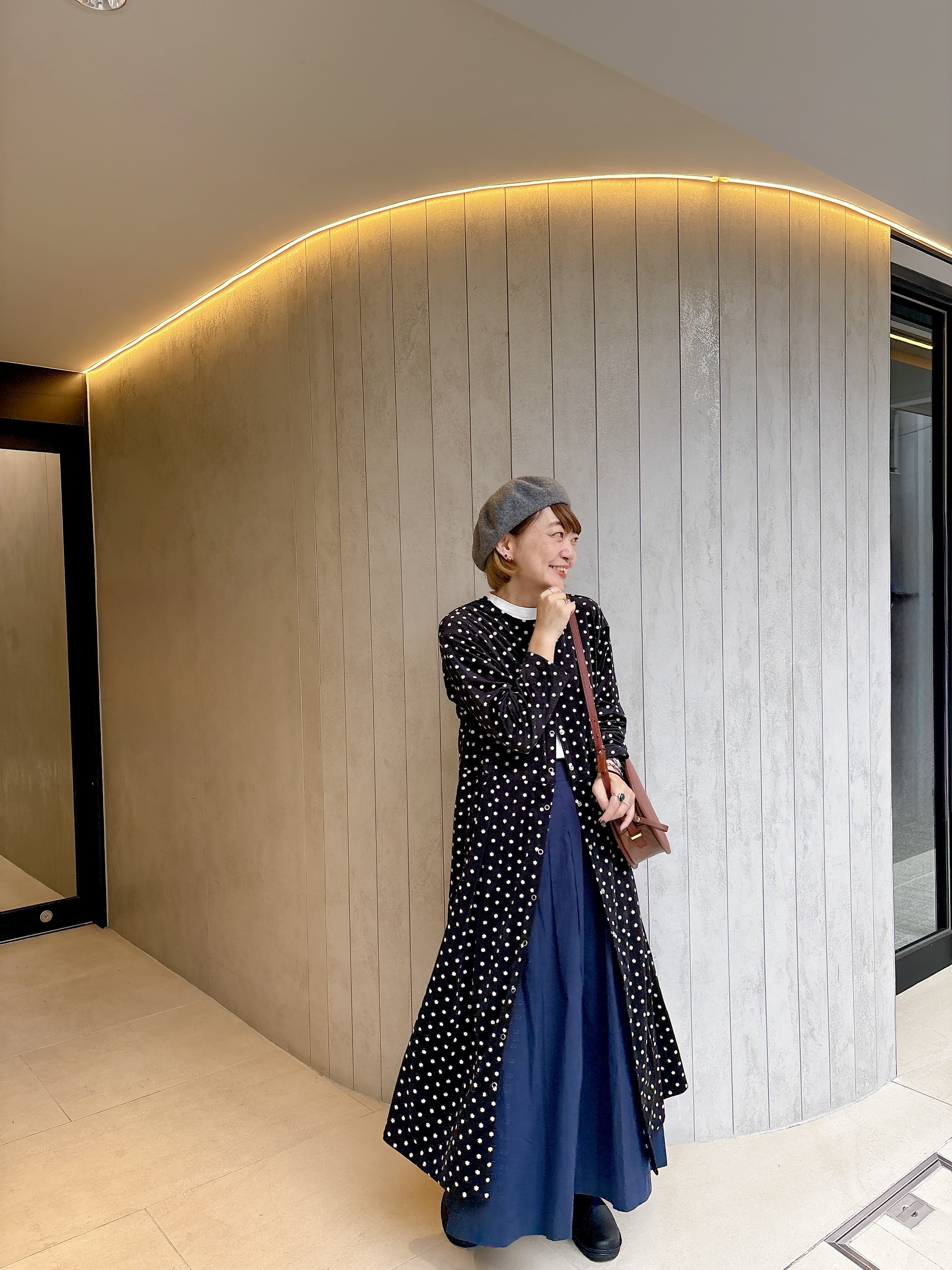 目線を上に上げるようにグレーのベレー帽をかぶれば、全体のシルエットが