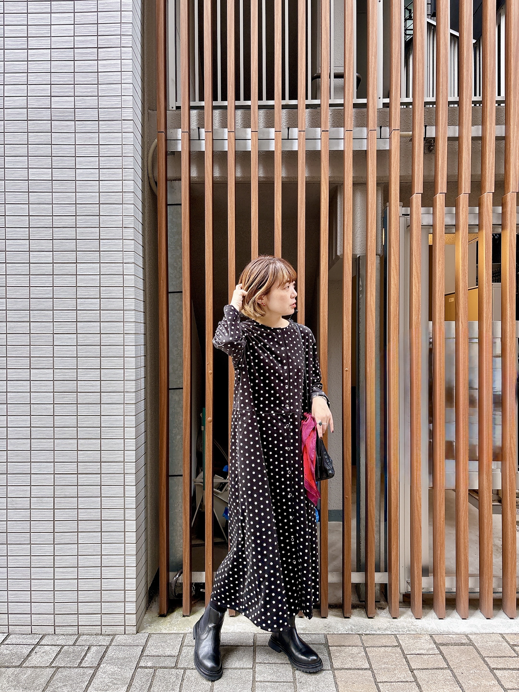 小物は黒でまとめて、バッグに巻いた赤いスカーフをアクセントに。