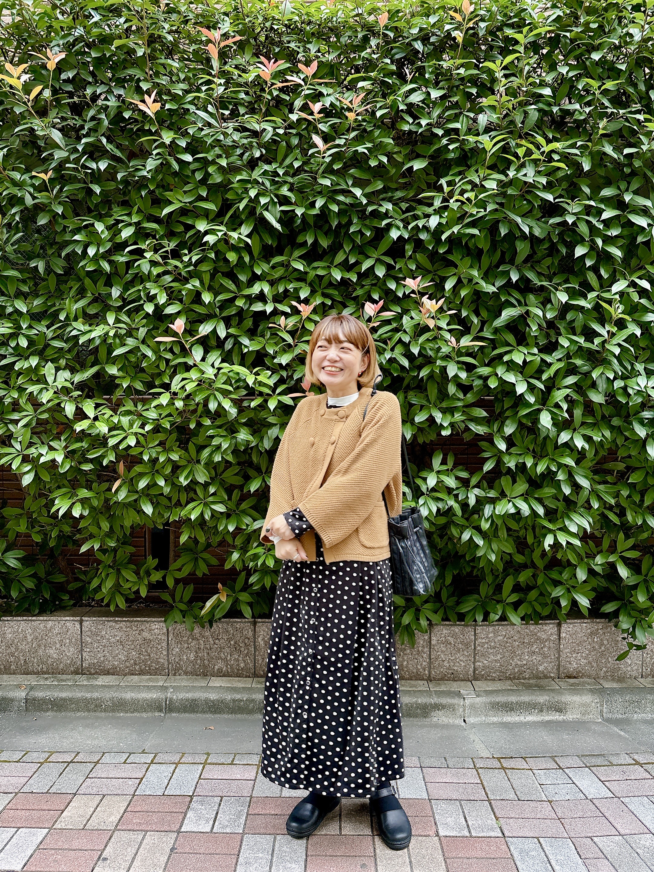 バッグやシューズはブラックで統一して、全体をすっきり引き締めました。