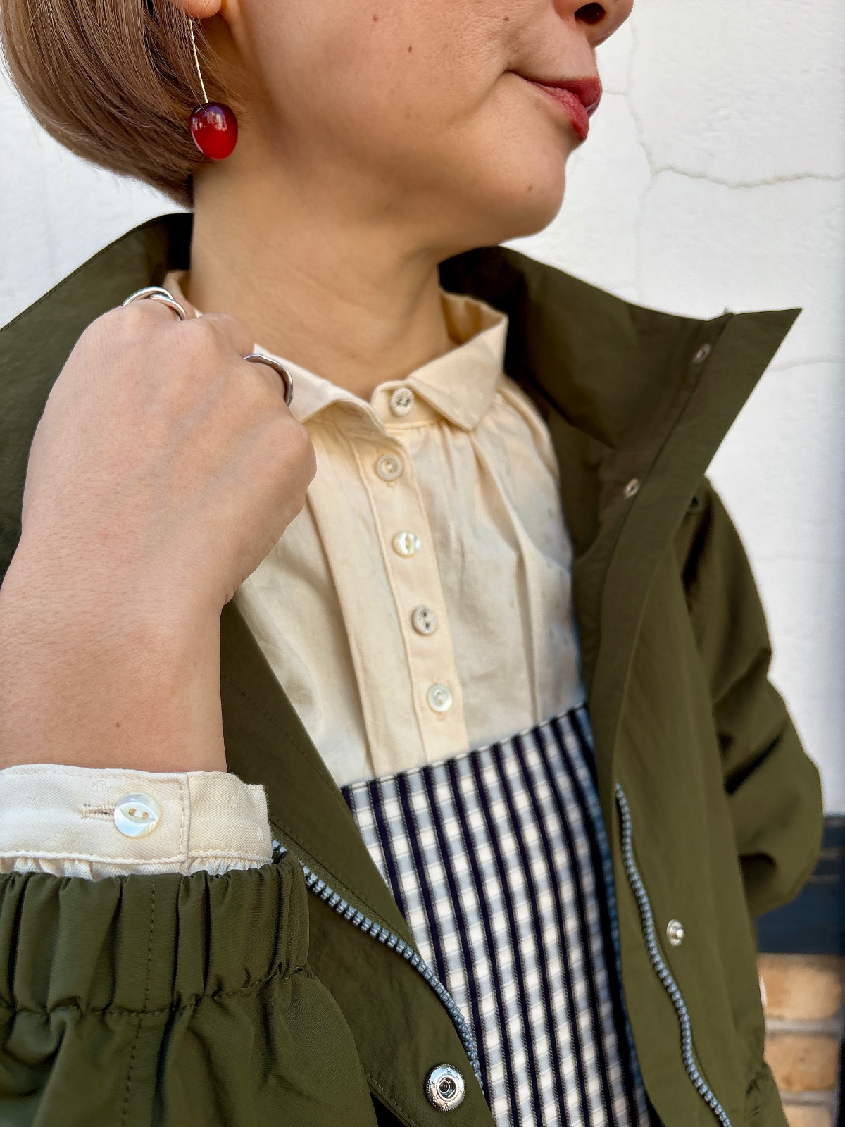 ベージュのマウンテンパーカーに、ギンガムチェックの