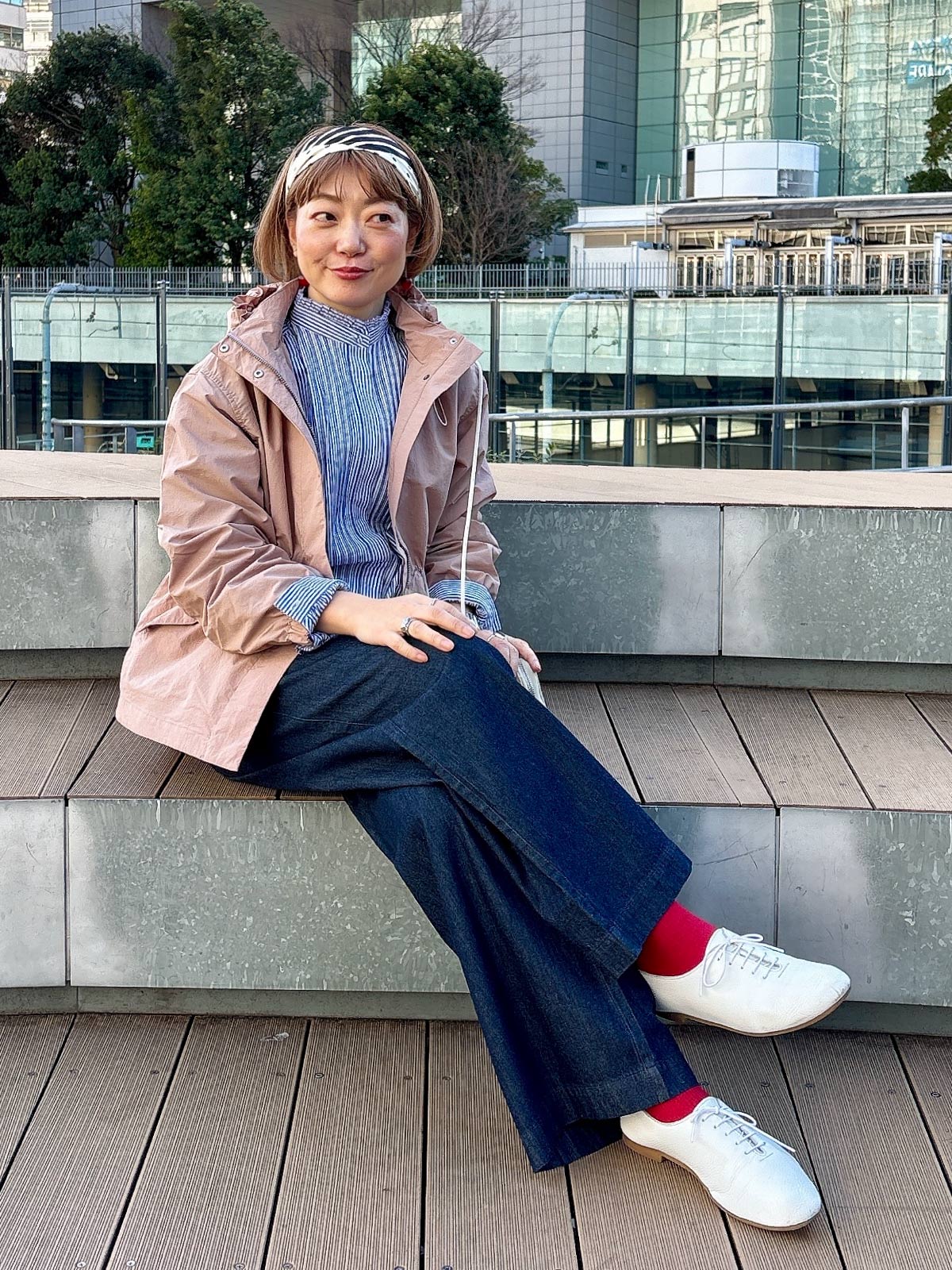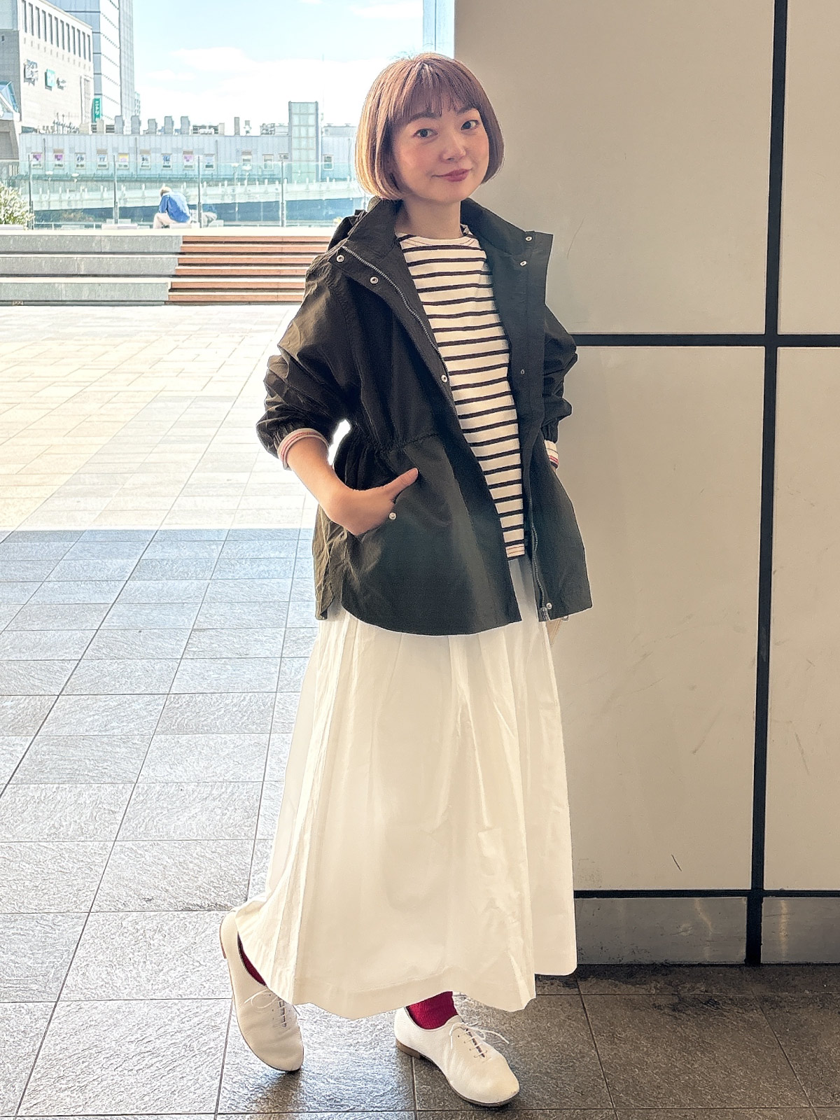 足元には白いソックスを合わせて、軽やかな抜け感を添えています。