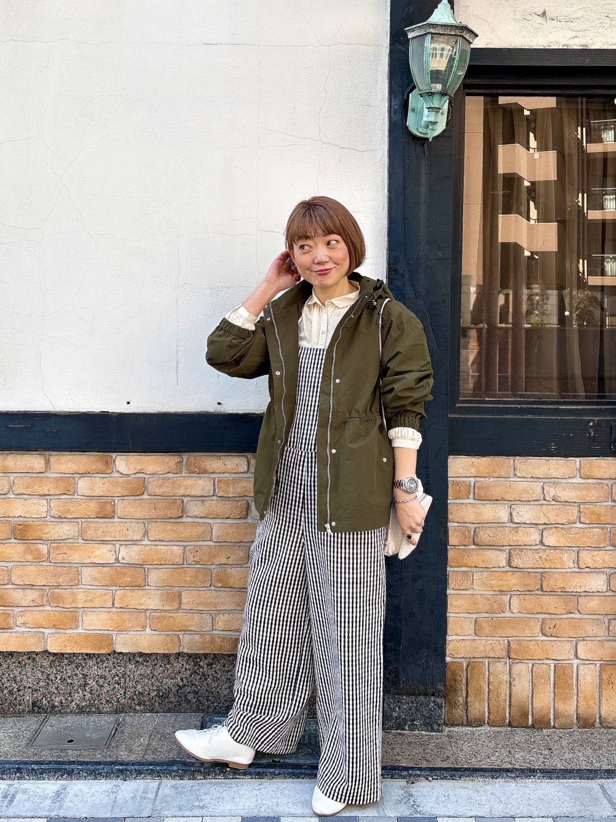 ギンガムチェックのサロペットにカーキのマウンテンパーカーを