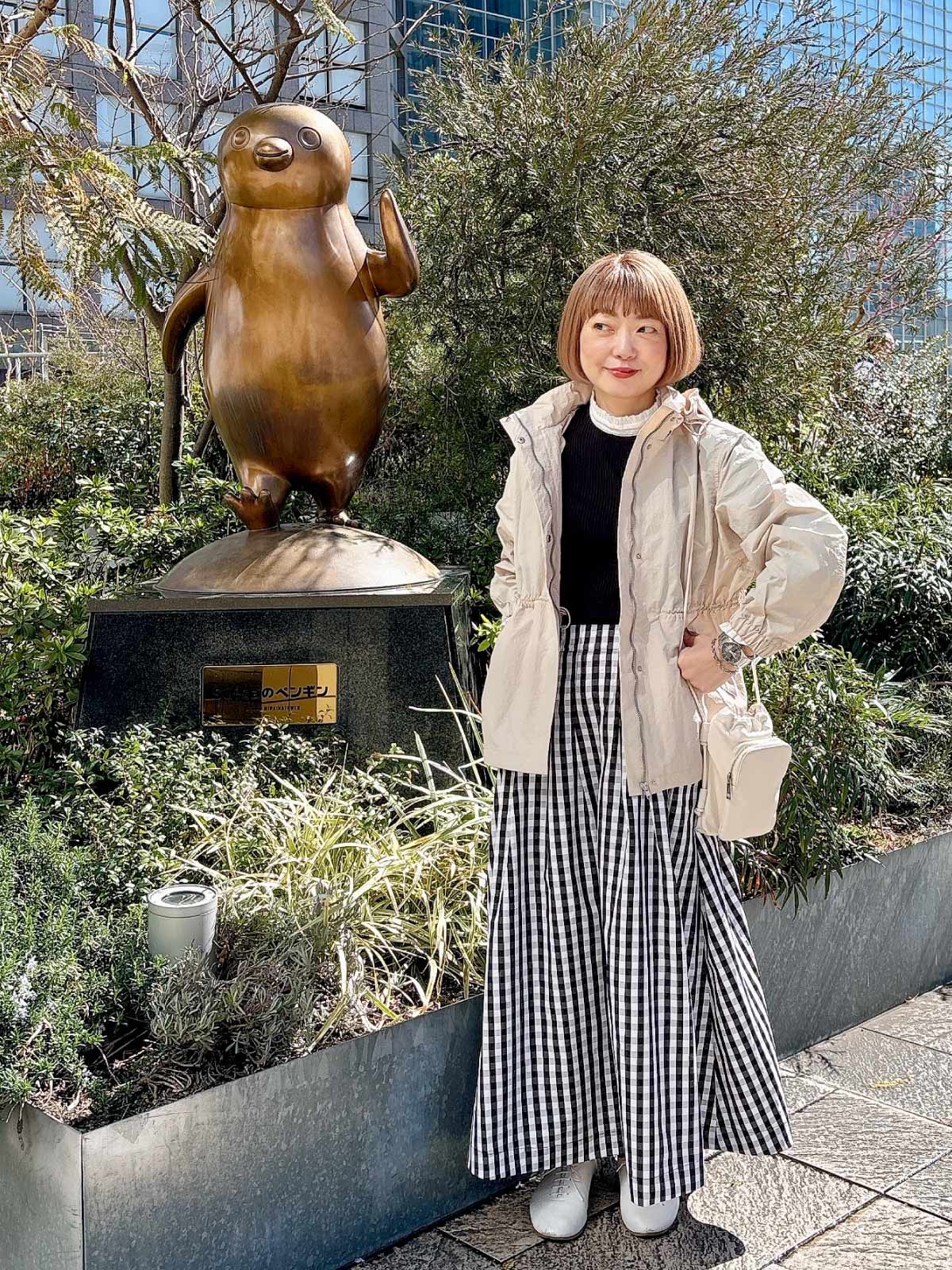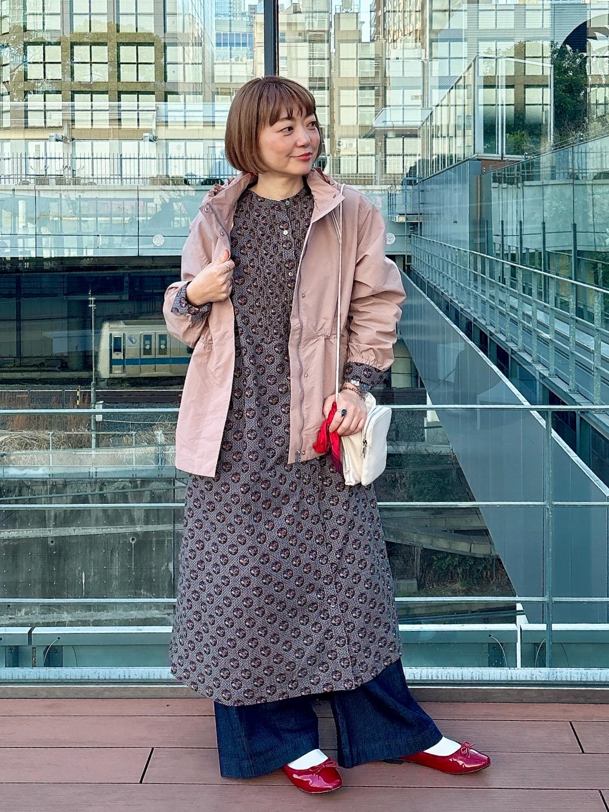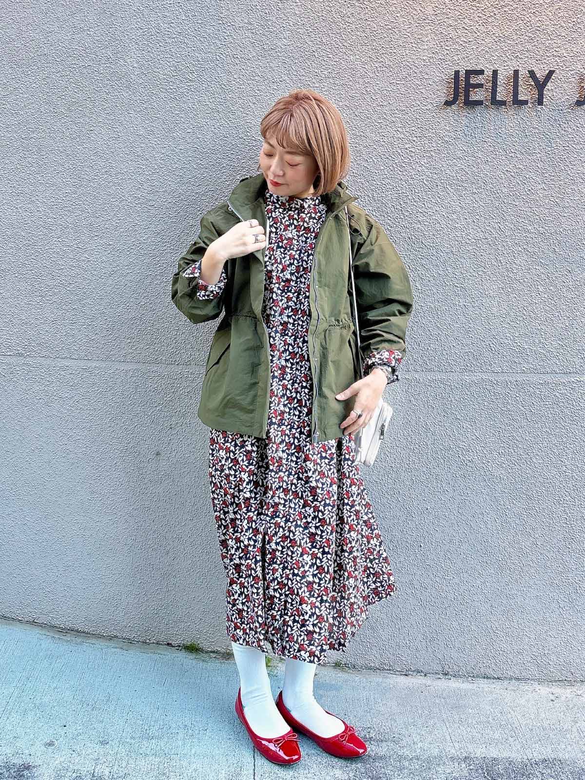 足元のバレエシューズやスカーフは赤でまとめて、