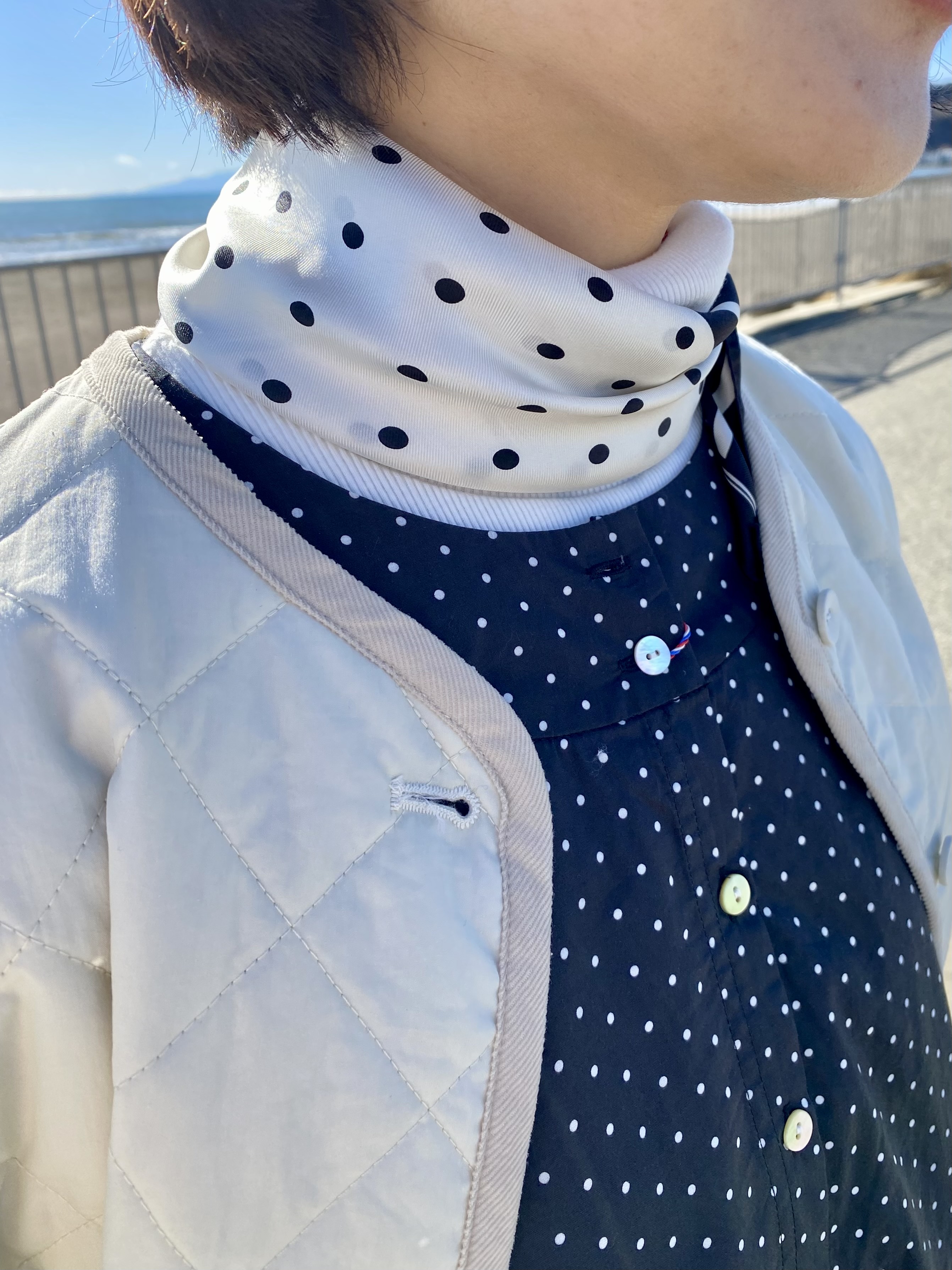 ドットワンピースに×ドットスカーフで遊び心をプラスするのがポンデ流。