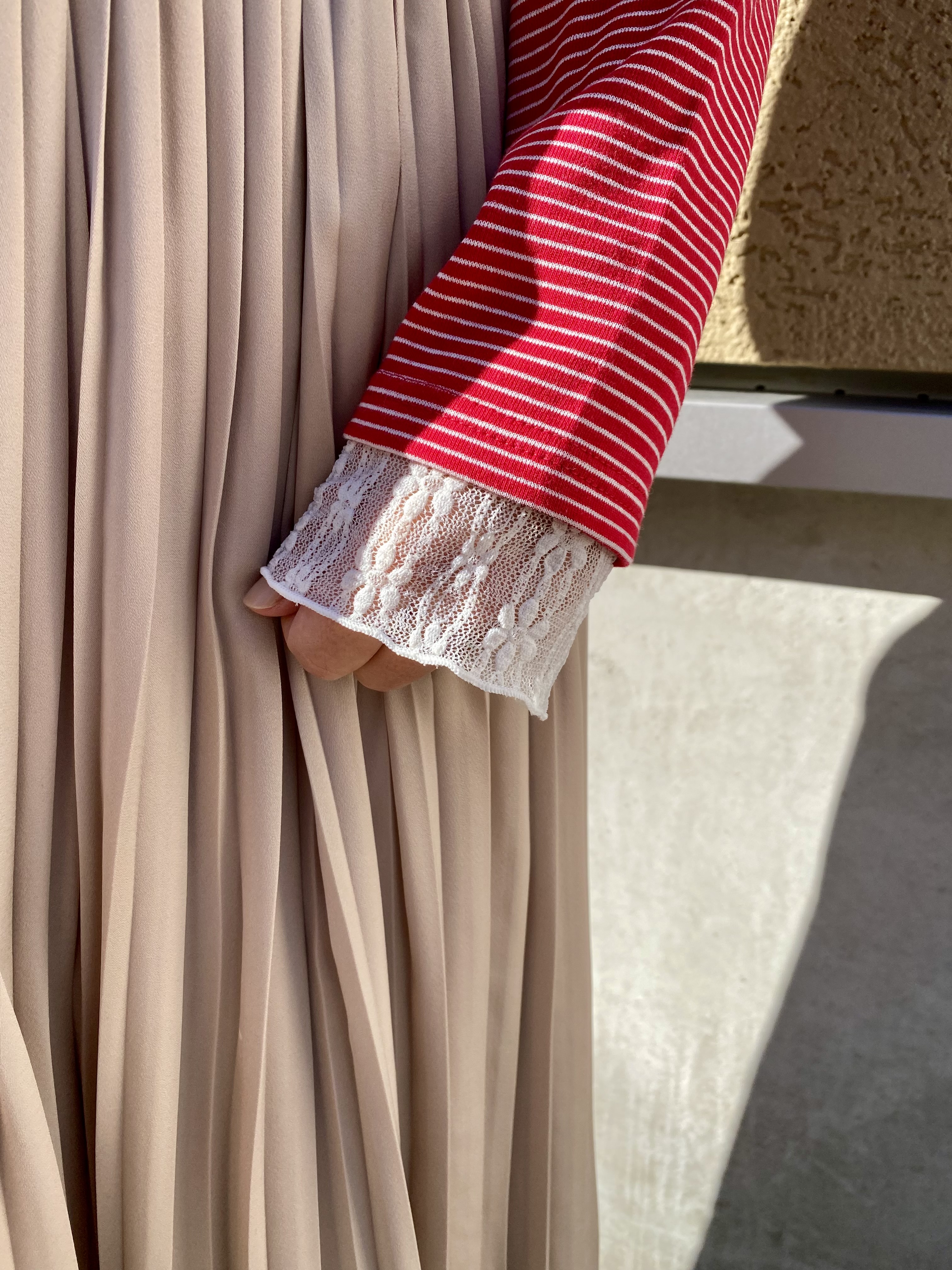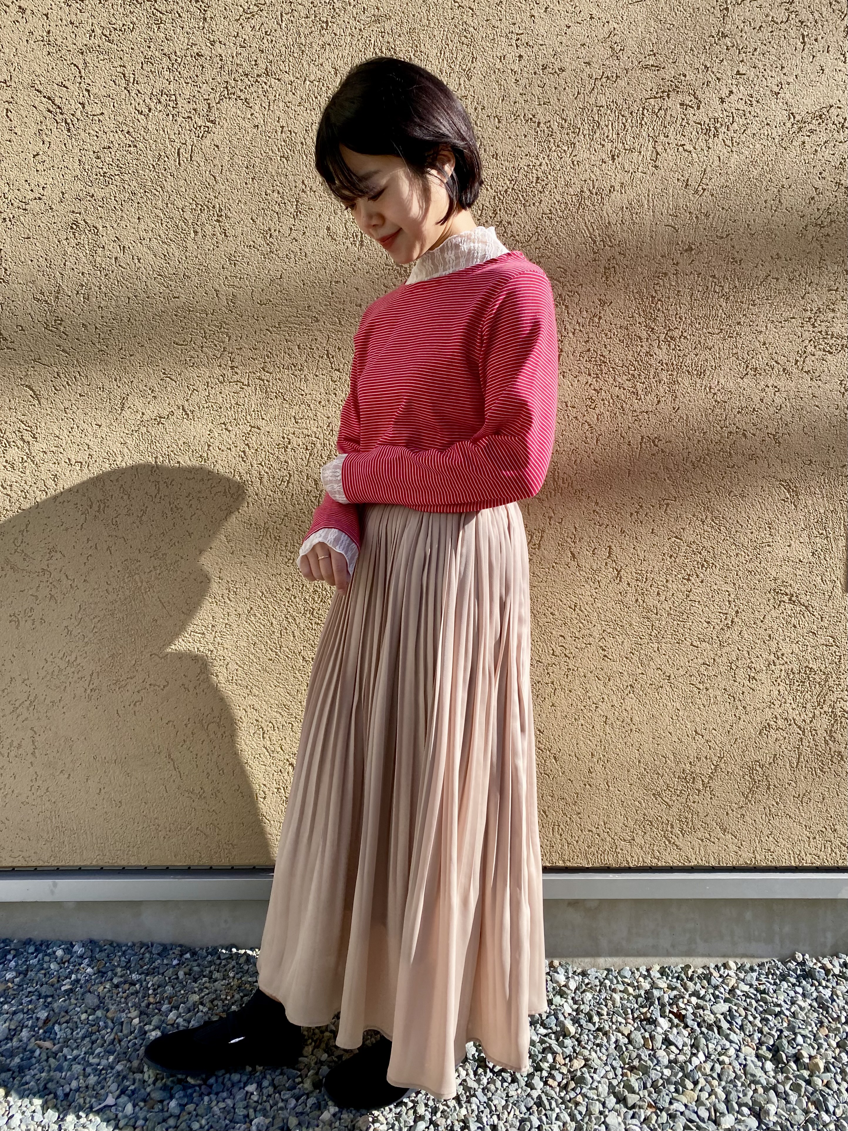 赤ボーダー×ベージュカラーのスカートでシンプルでありながら
