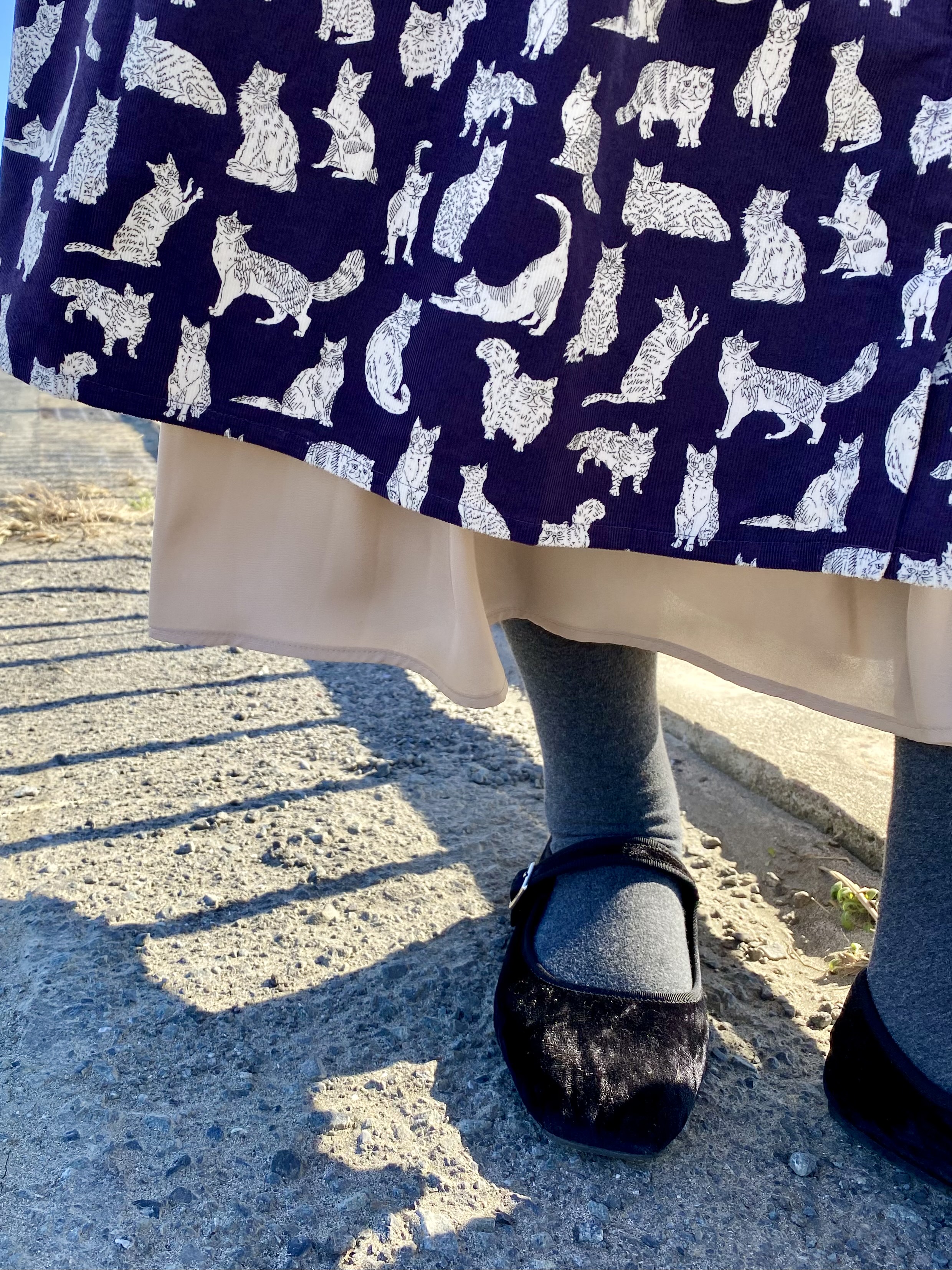 猫ちゃん柄のワンピースの裾からちらちら見える艶スカートがポイントです。