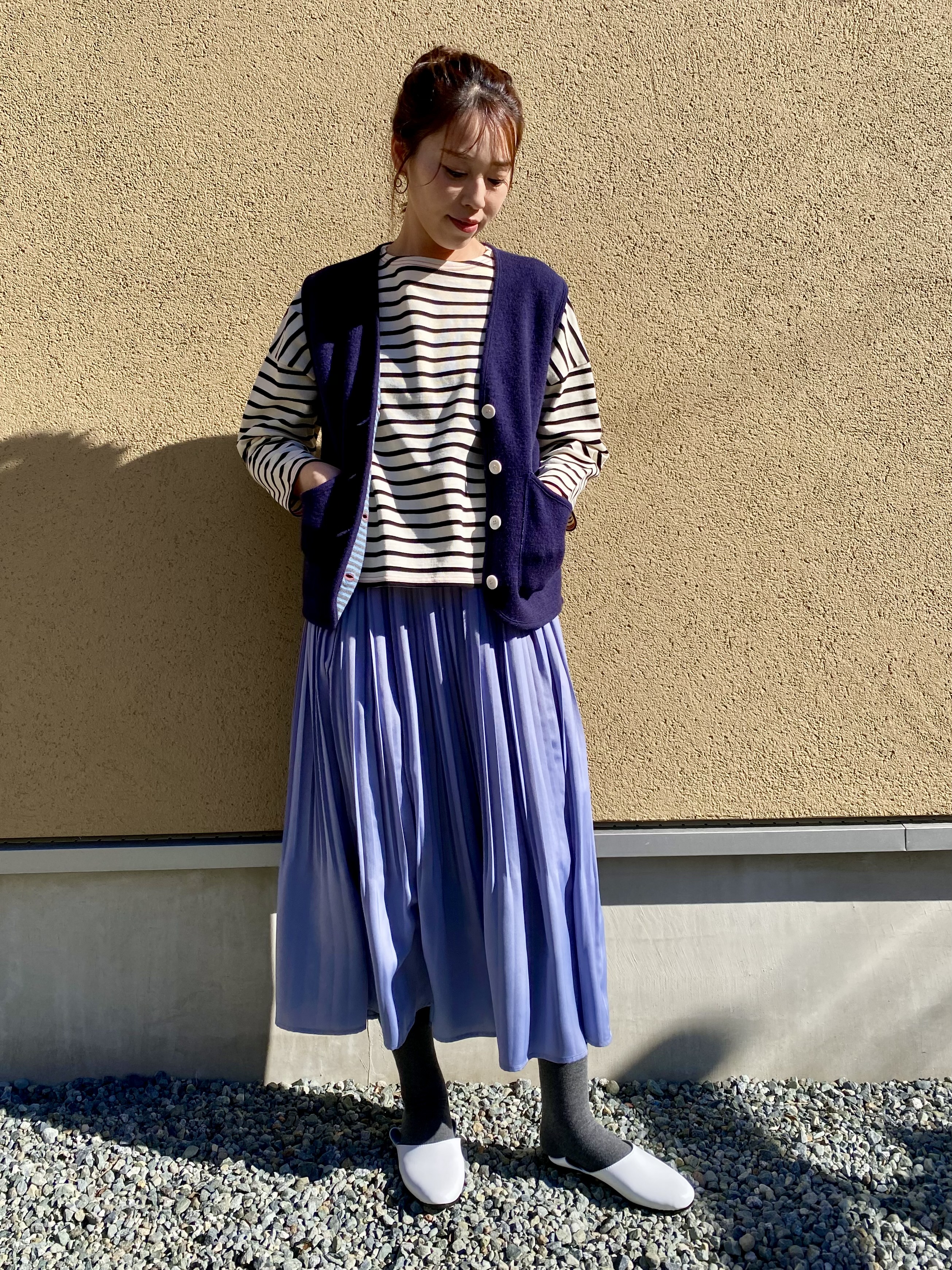 濃いめのネイビーベストで締めるとバランスも◎